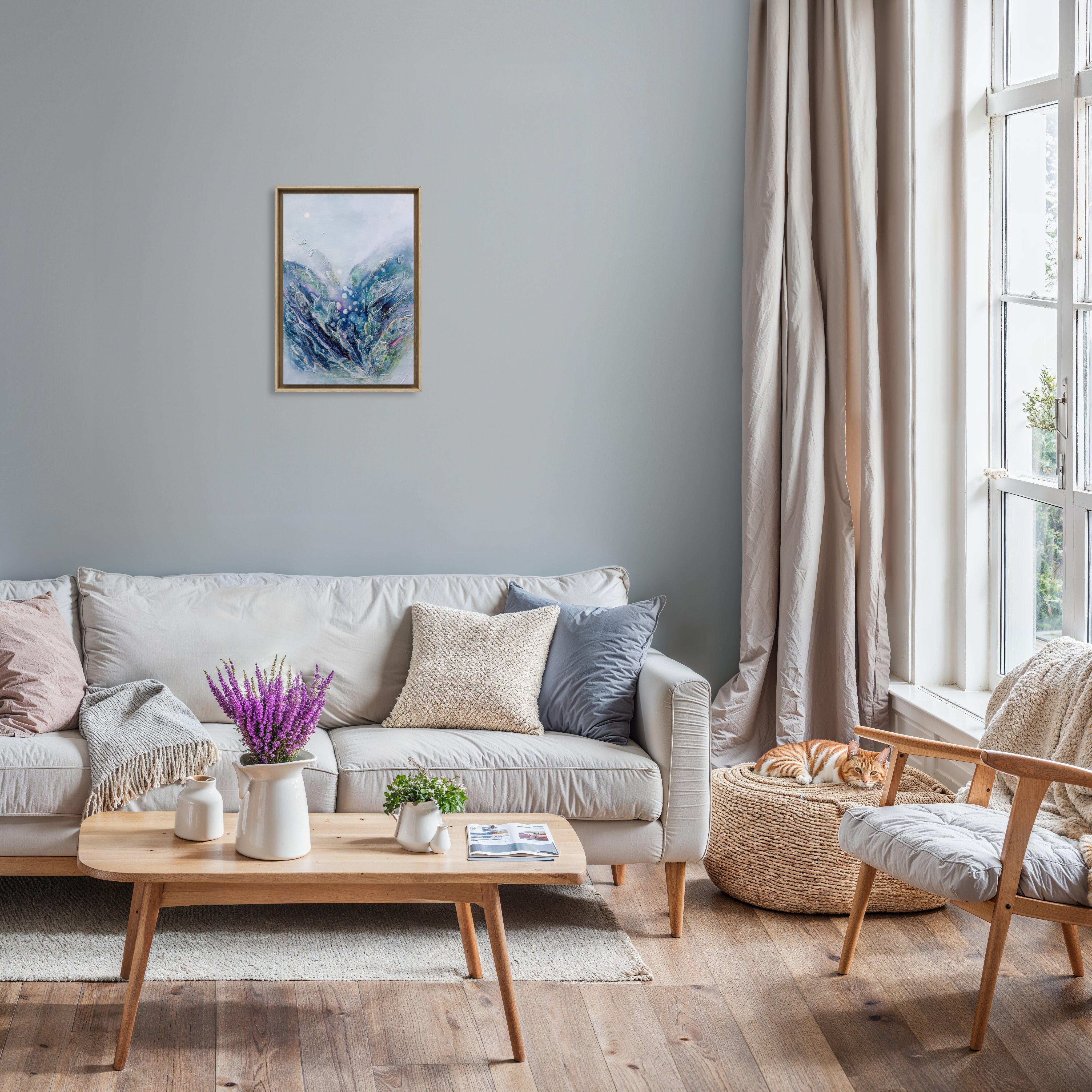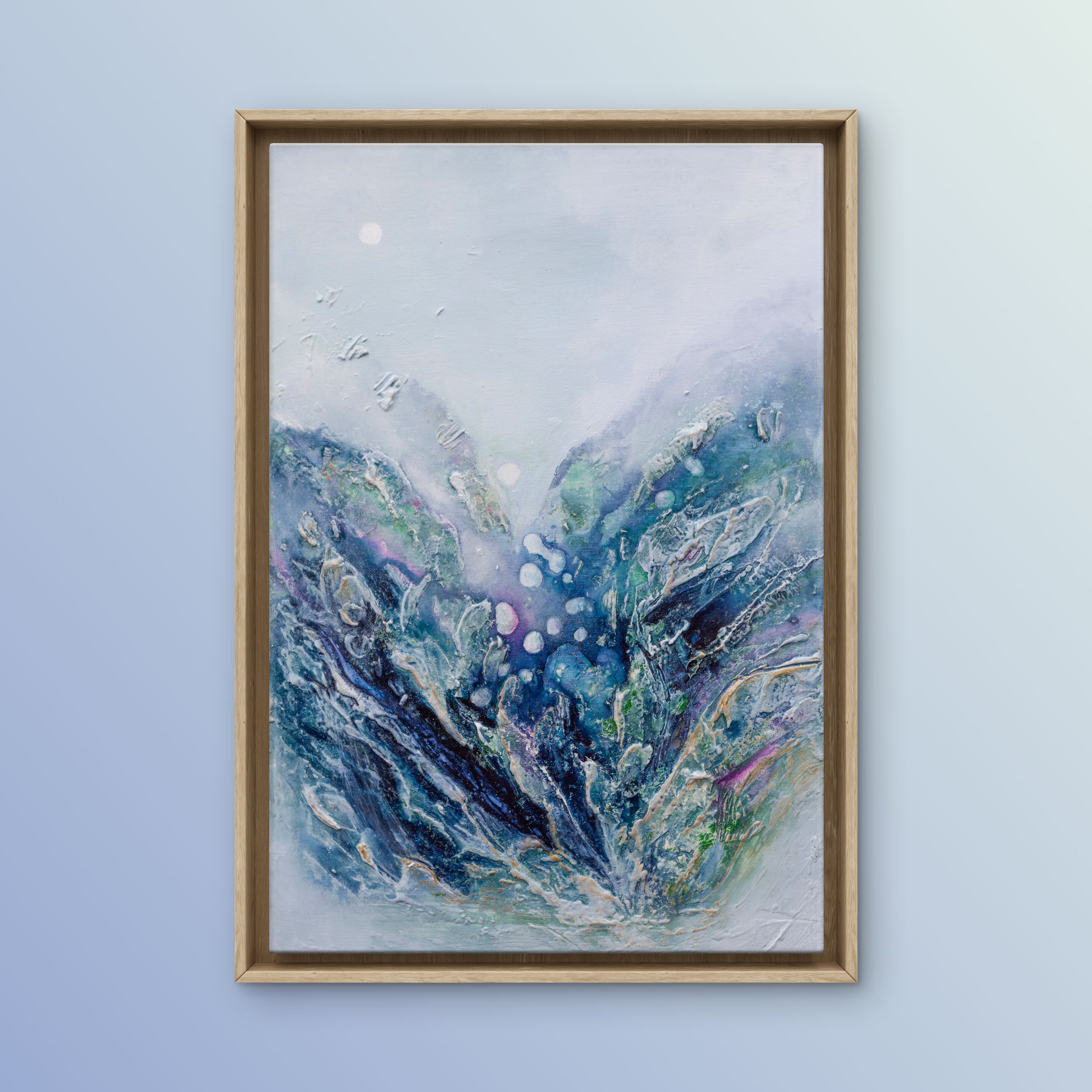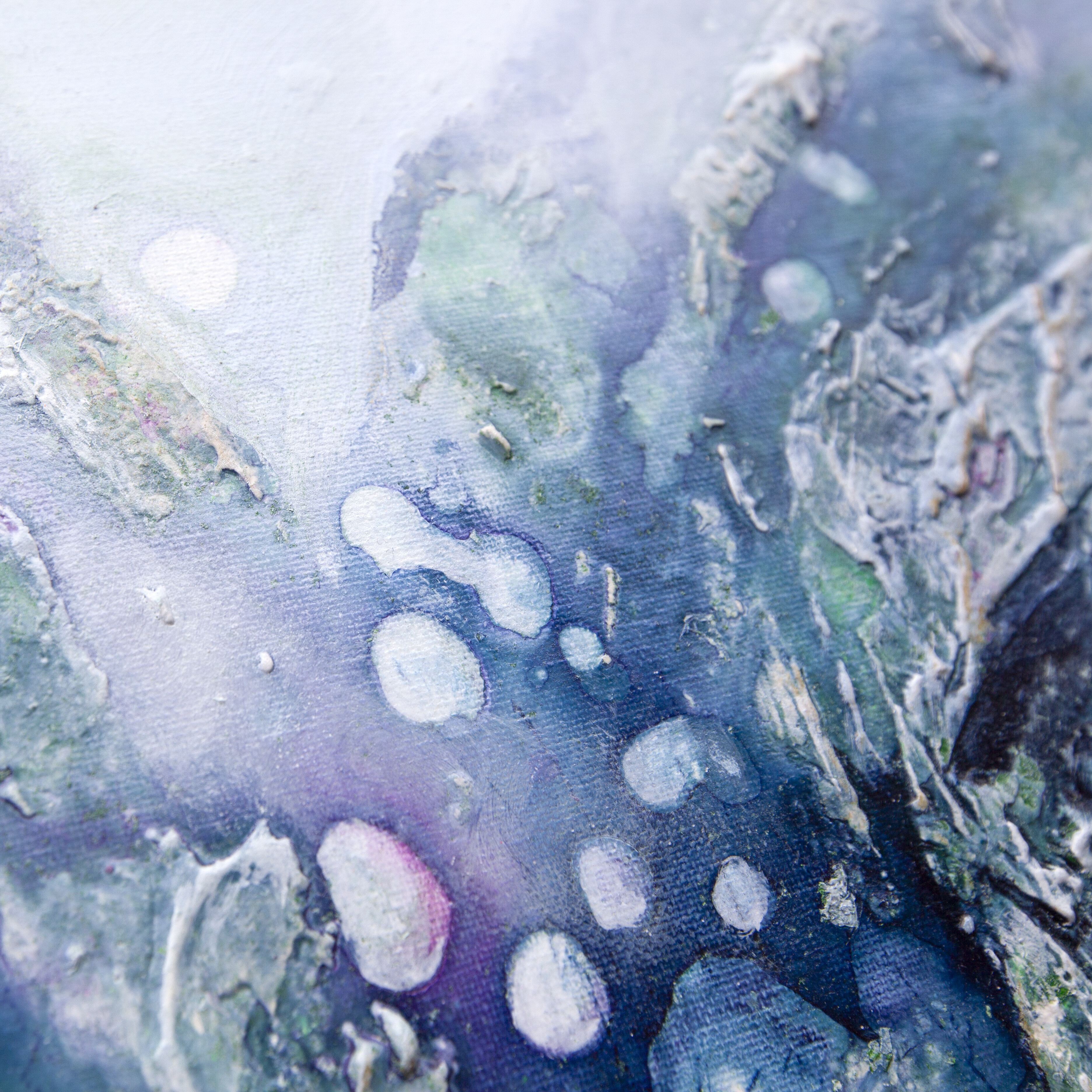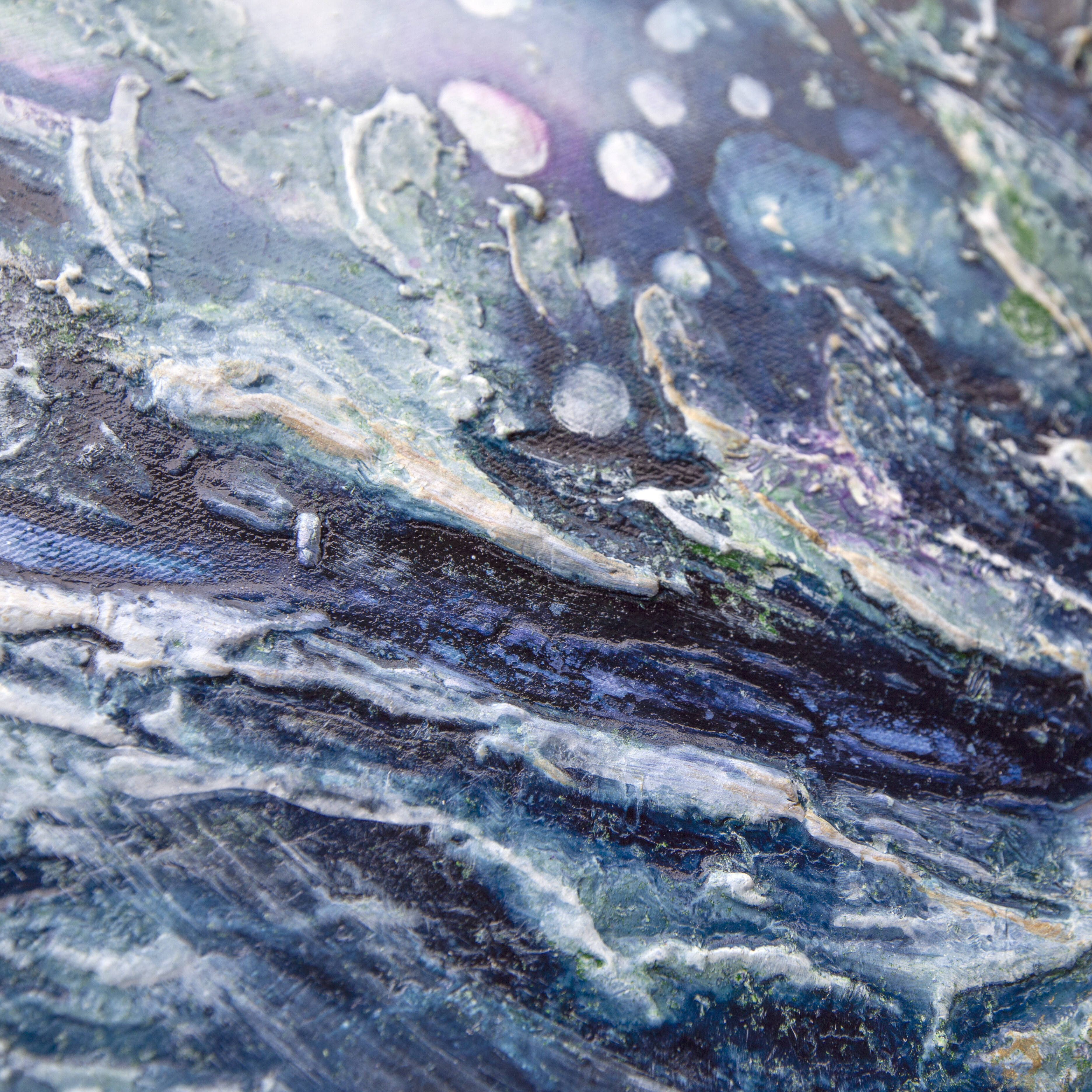 Obraz „A Happy Little Moment” to strukturalna abstrakcja, w której emocje zakodowane są w fakturze i barwie. Dominująca paleta chłodnych odcieni – niebiesko-fioletowych – tworzy nastrój subtelnej radości, cichego uniesienia, które nie krzyczy, ale trwa. Faktury przypominają fragmenty wspomnień – szorstkie i gładkie zarazem – jakby uchwycone w momencie, gdy spokój spotyka się z błyskiem wewnętrznego światła. Głębokie fiolety przenikają się z rozbielonym błękitem, przywołując skojarzenia z wieczornym niebem, chwilą ciszy lub nagłym przebłyskiem ulgi. To nie wielka euforia, lecz mały, intymny moment szczęścia, który zostaje z nami na dłużej.