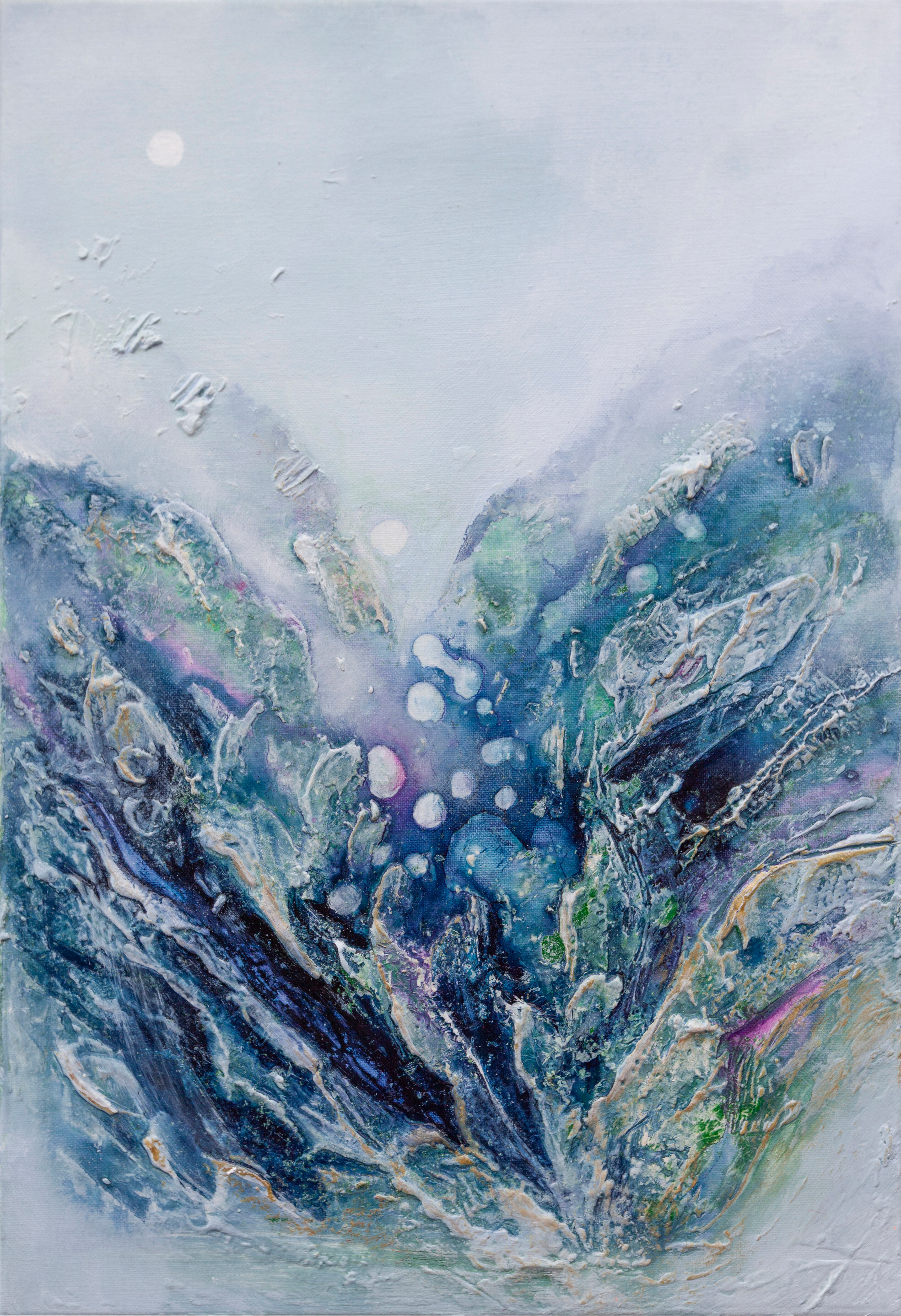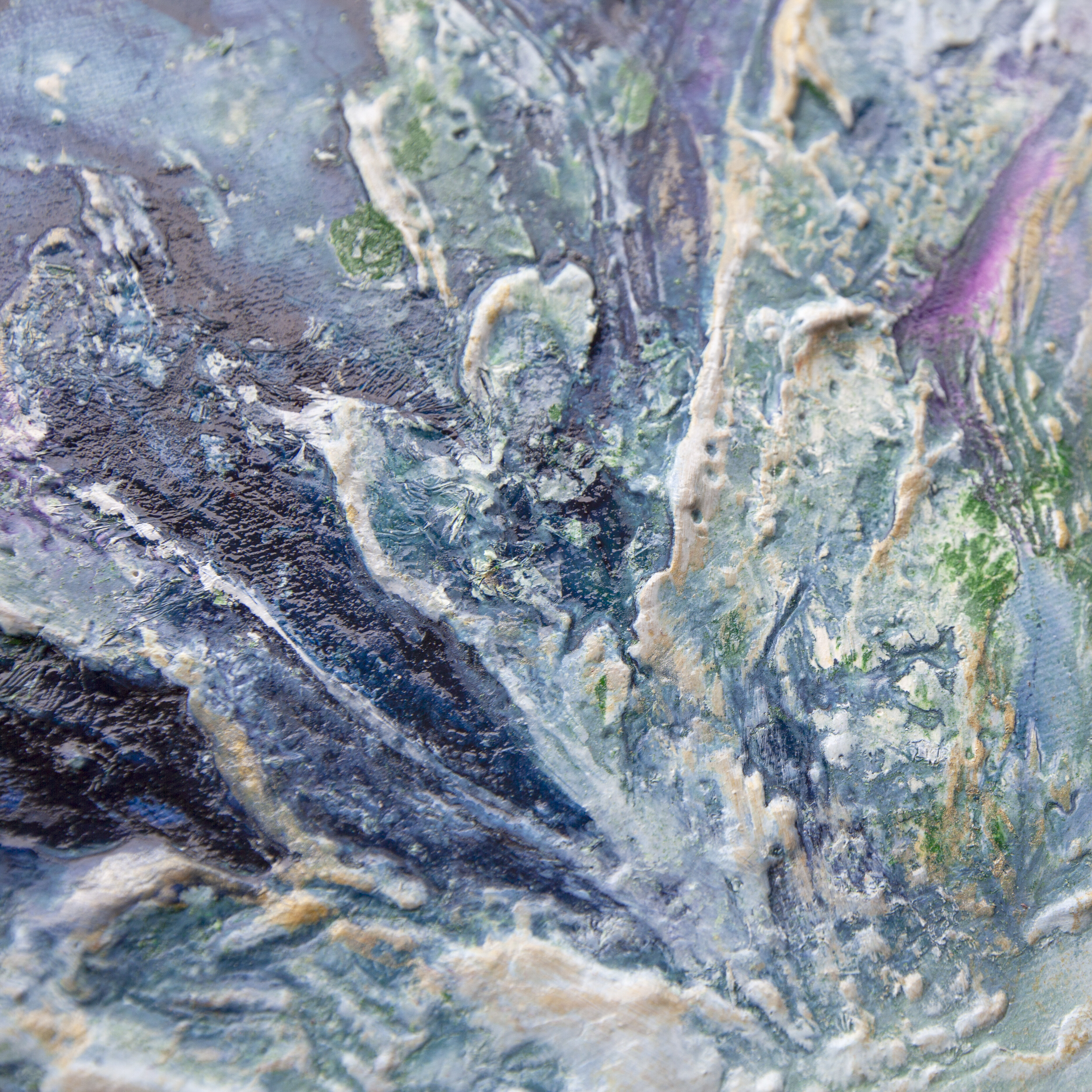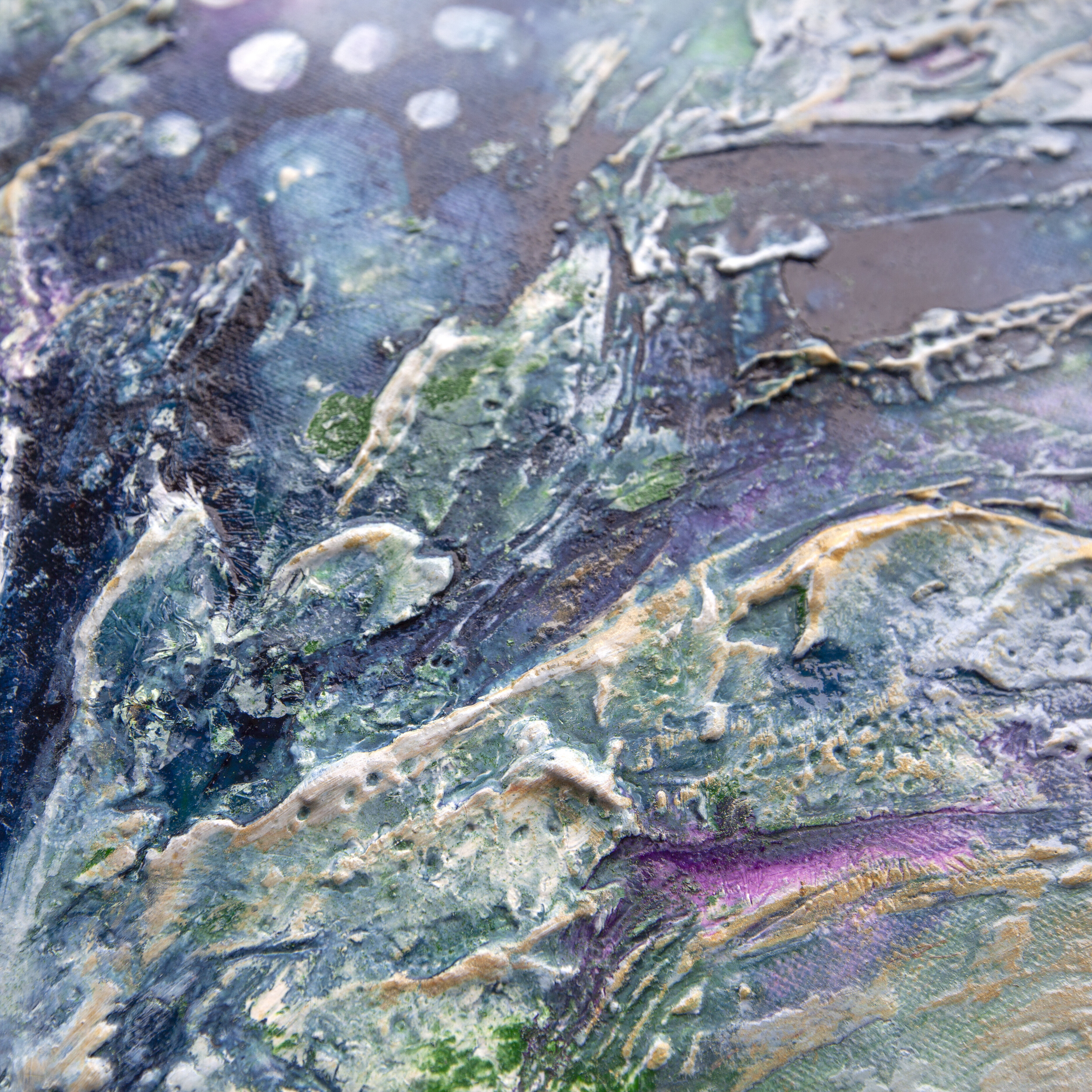 Obraz strukturalny wykonany techniką mieszaną -akryl i pasta strukturalna. Obraz jest zabezpieczony błyszczącym werniksem i ma boki zamalowane w tonacji obrazu. Obraz sprzedawany bez ramy