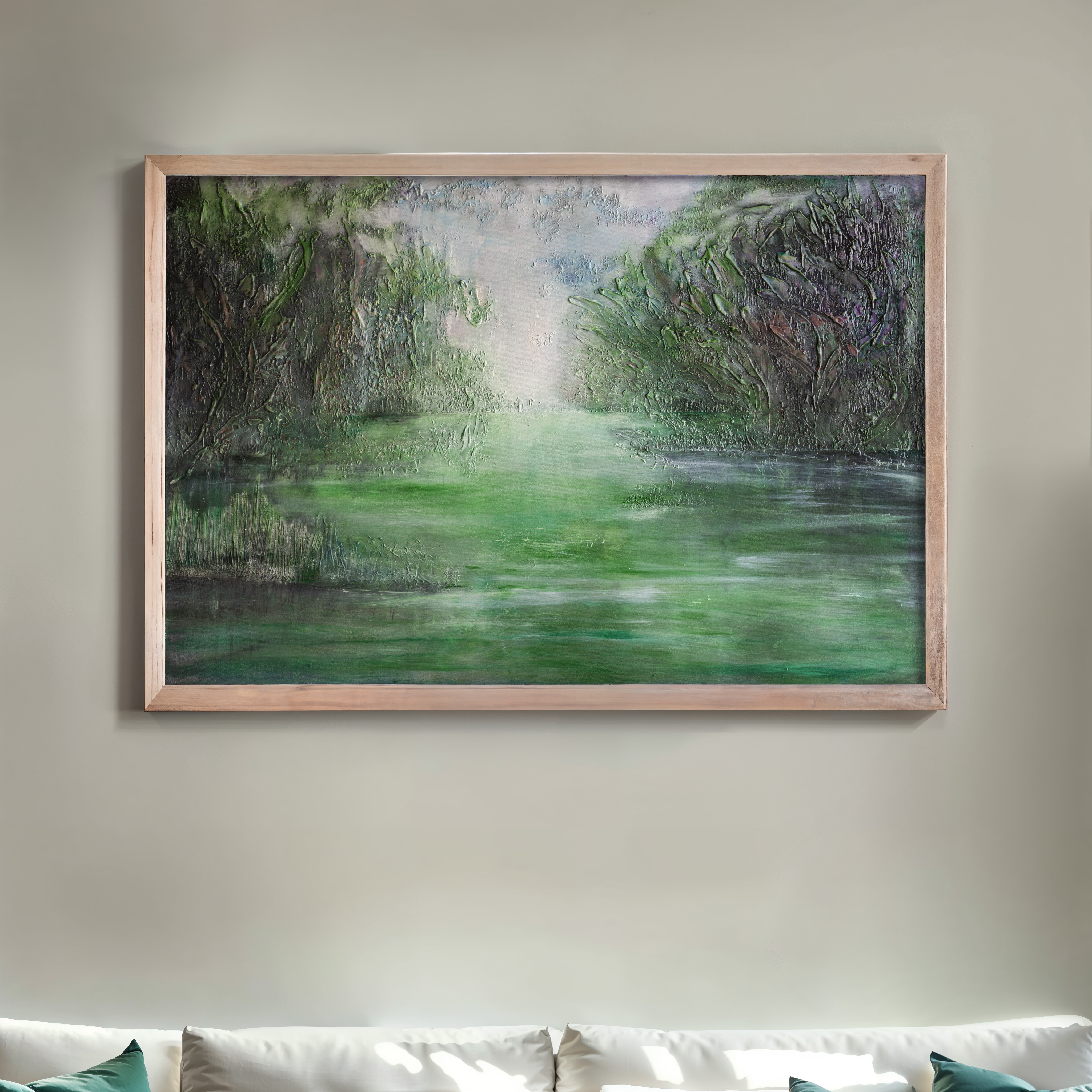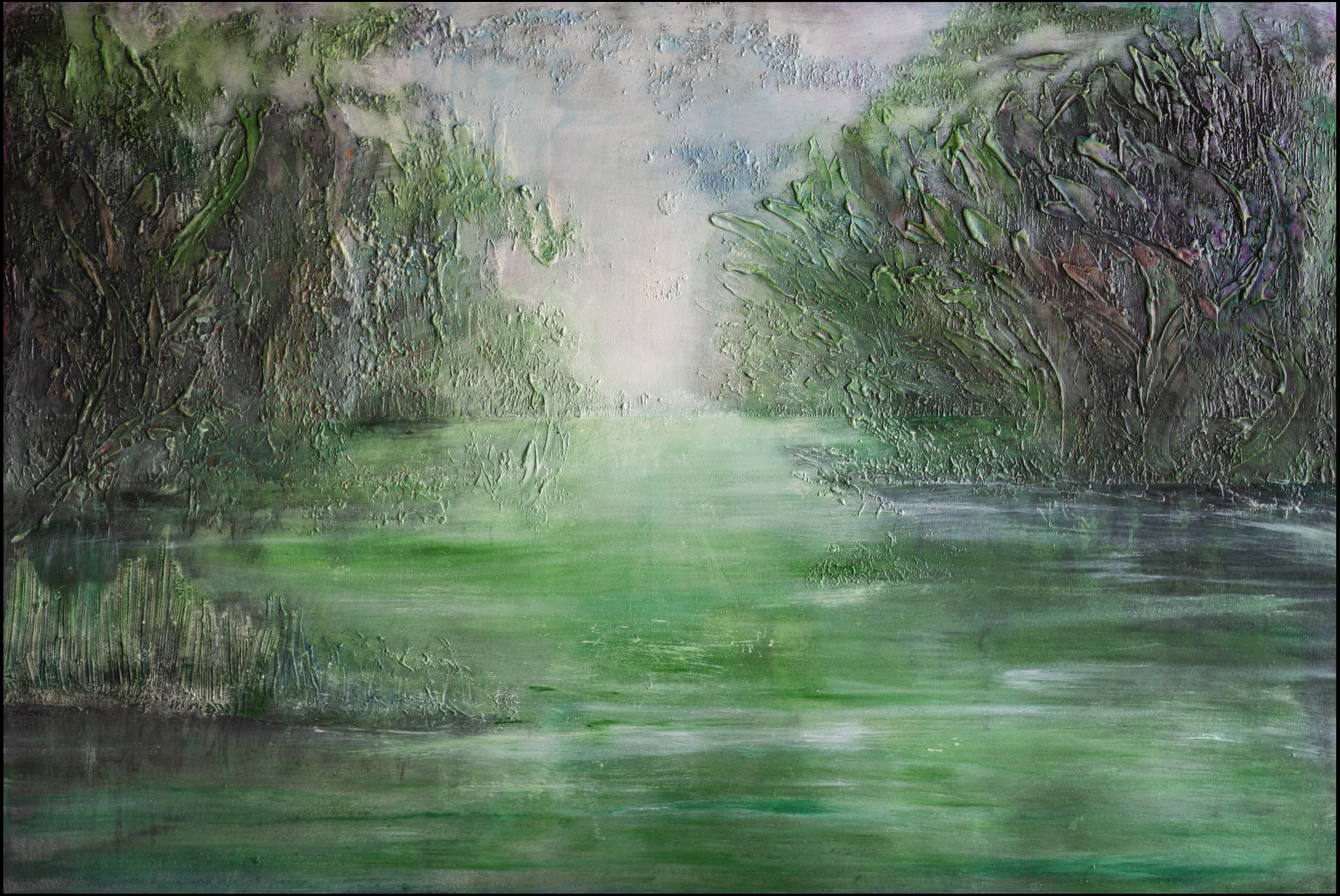 Obraz strukturalny wykonany techniką mieszaną (mixed media) - olej, akryl i faktura. Obraz jest zabezpieczony werniksem błyszczącym (tafla wody) i satynowym (góra).