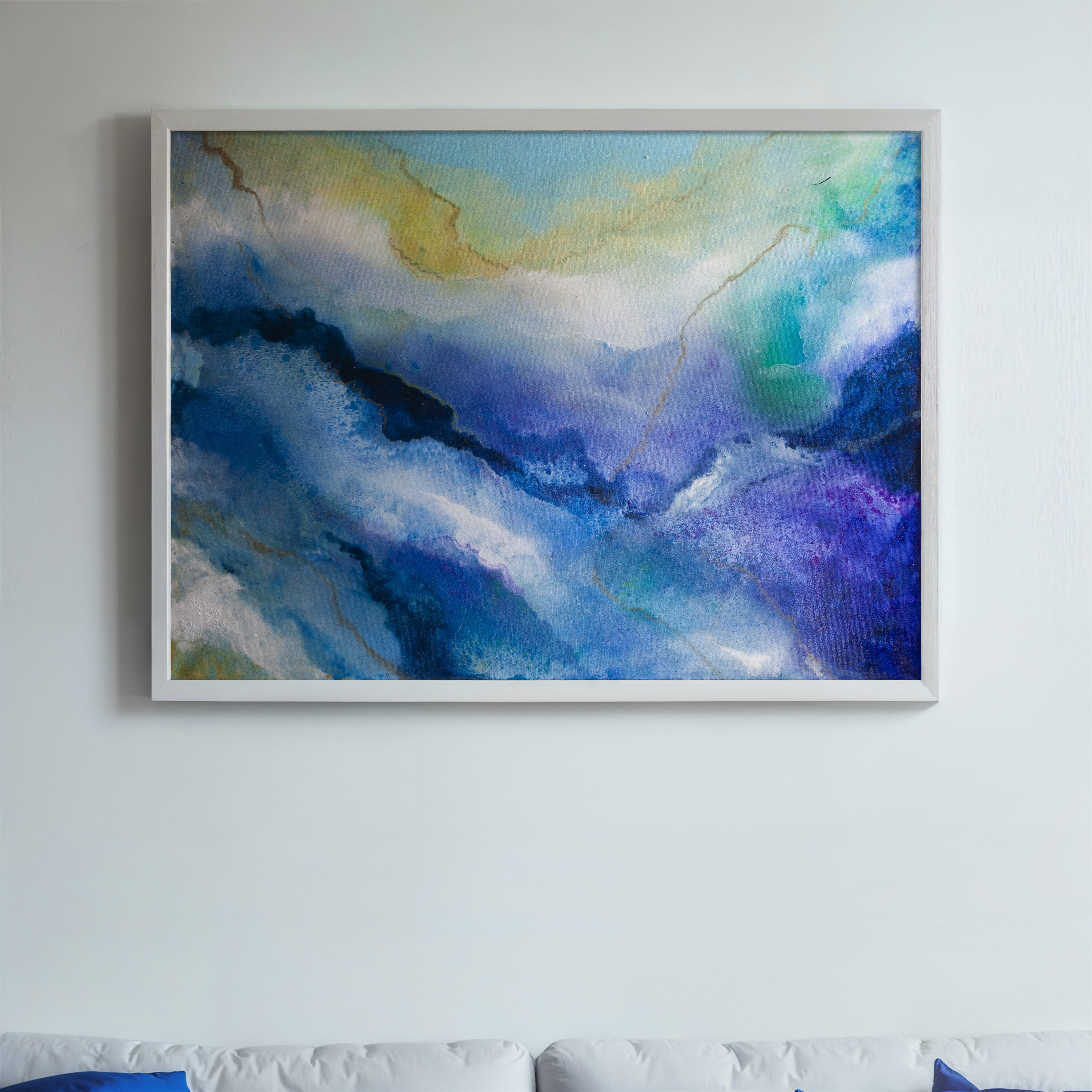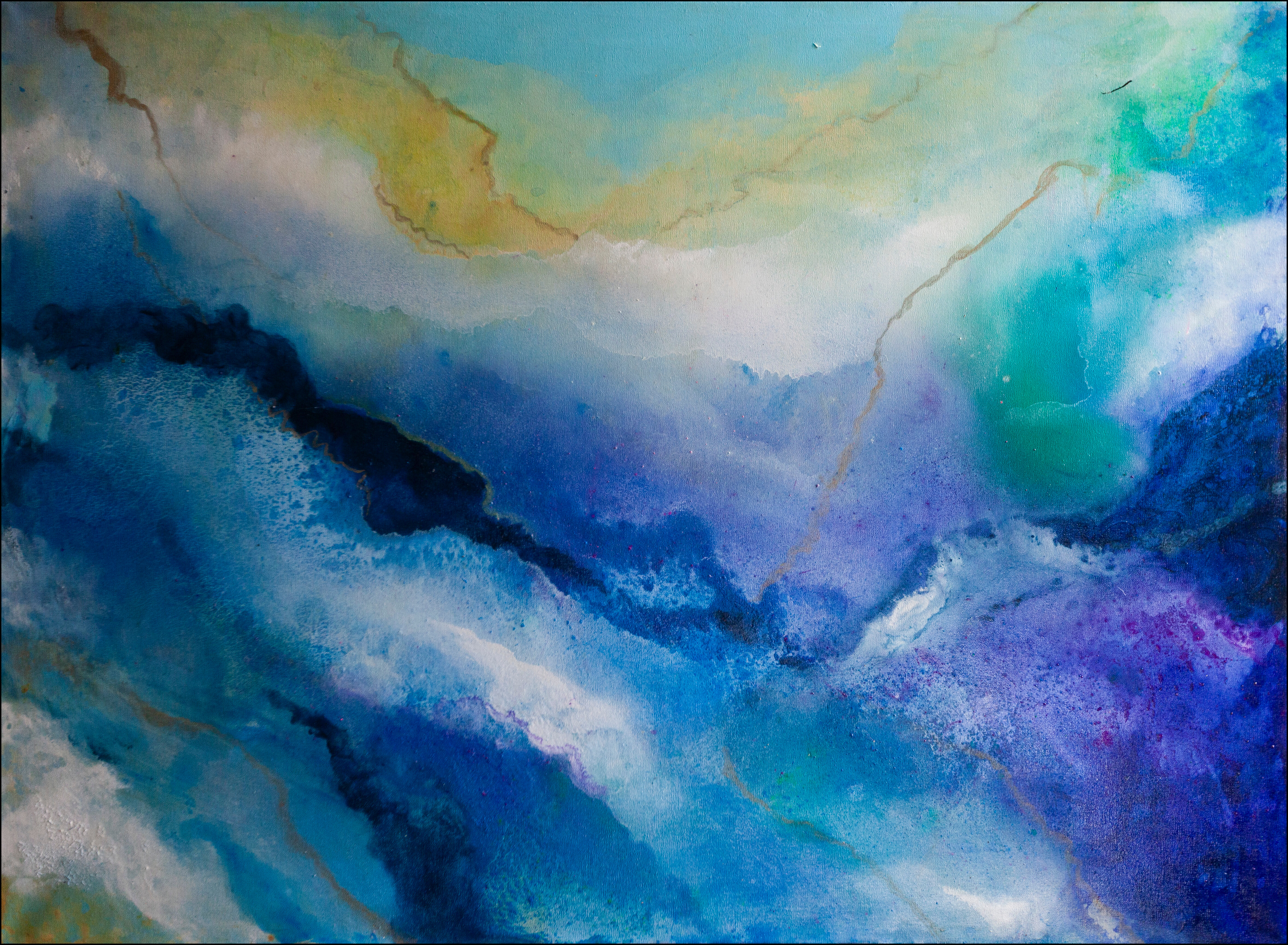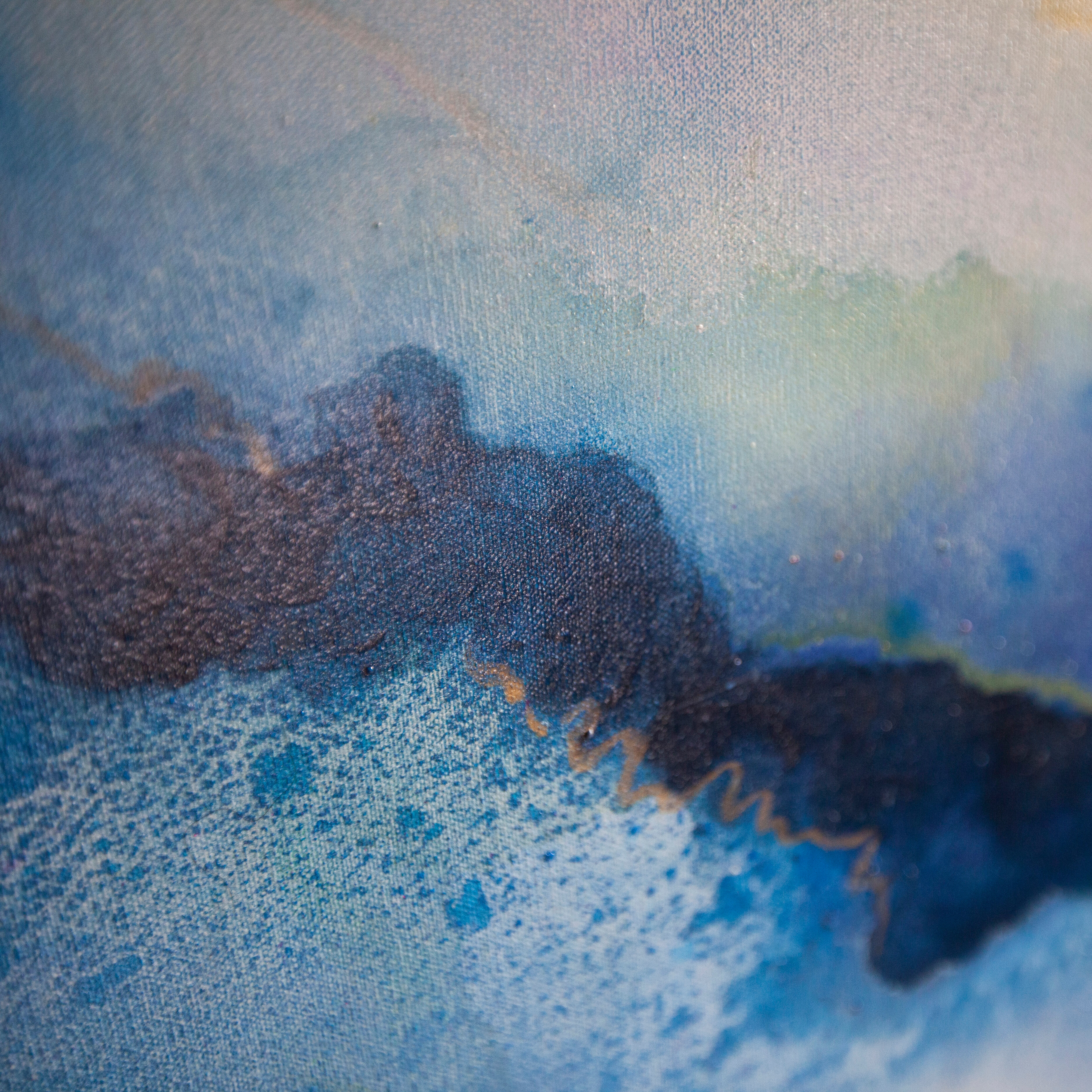 Niebieska abstrakcja inspirowana krajobrazem górskim. Delikatne, falujące linie i głębokie odcienie błękitu tworzą wizję przestrzeni – surowej, ale jednocześnie spokojnej. Kompozycja przypomina warstwice topograficzne lub sylwetki pasm górskich tonących w mglistym świetle świtu. Zacierające się kontury nadają obrazowi wrażenie snu – jakby uchwycono wspomnienie podróży w miejsce, które istnieje bardziej w wyobraźni niż na mapie.