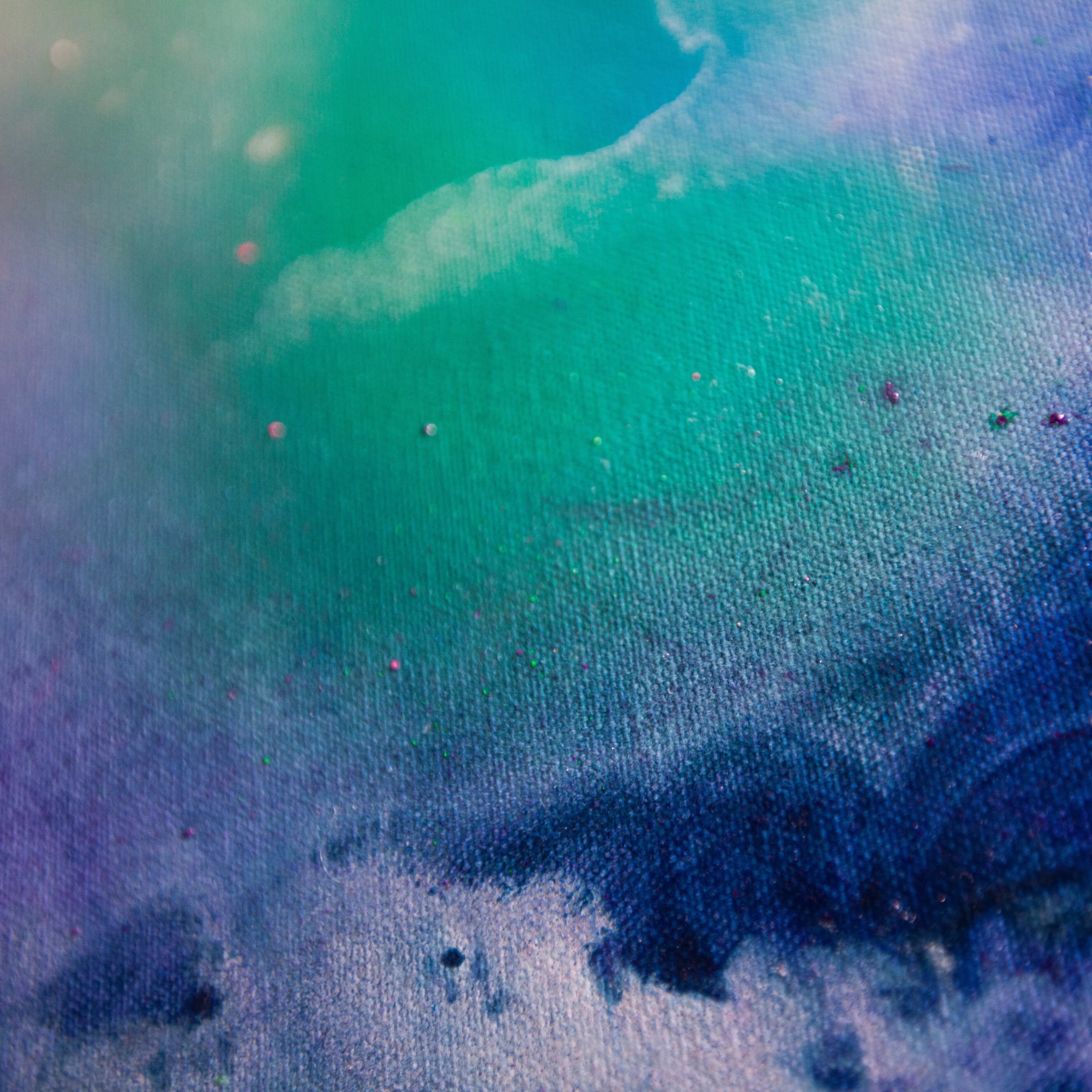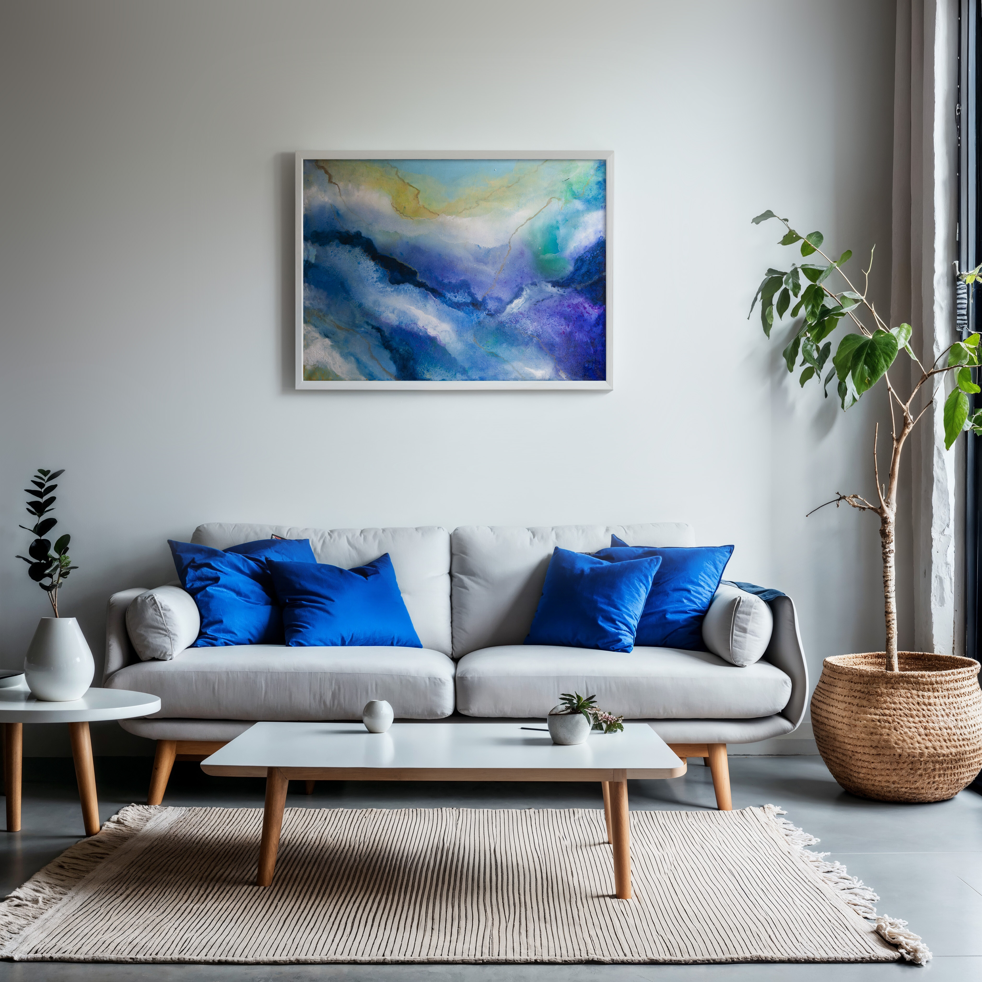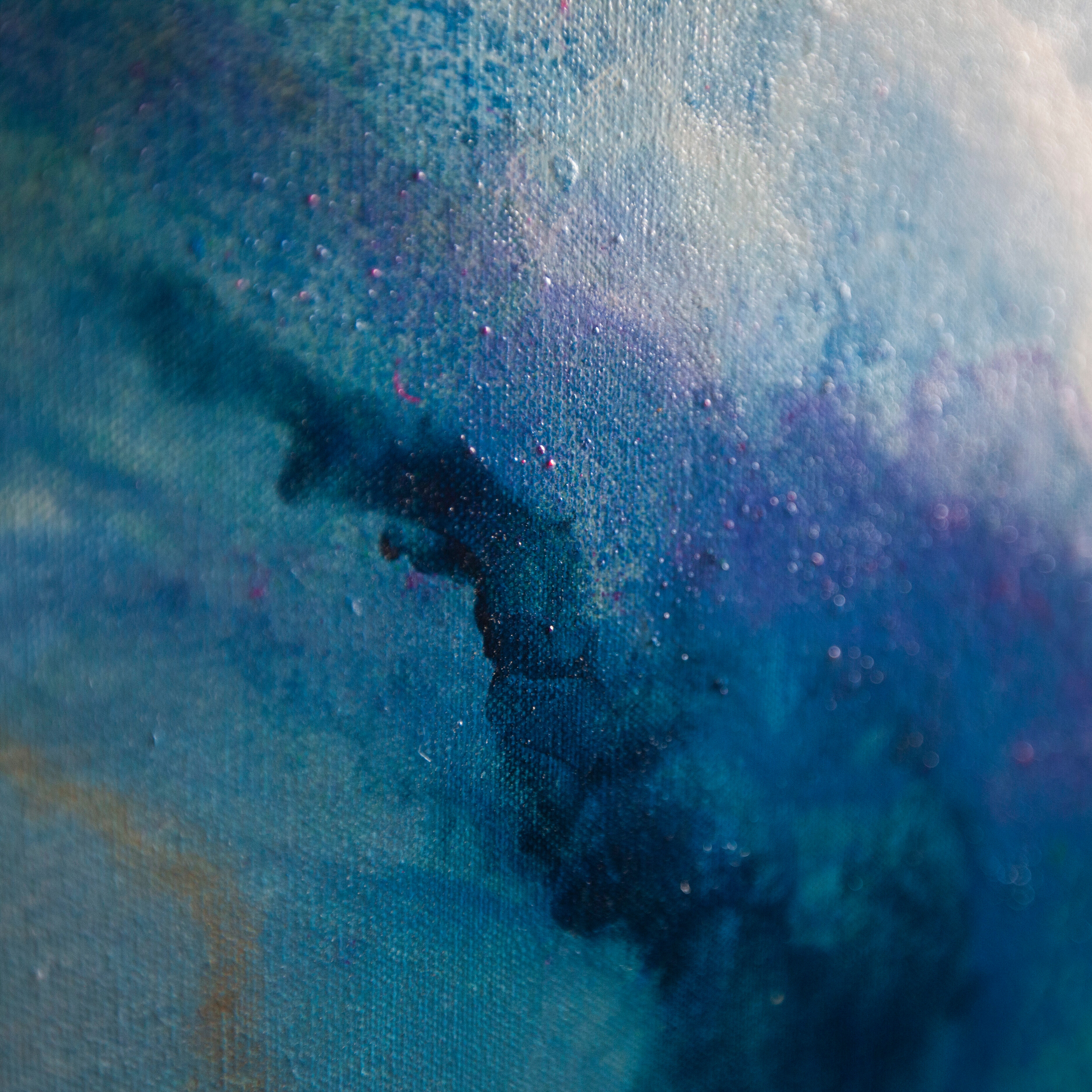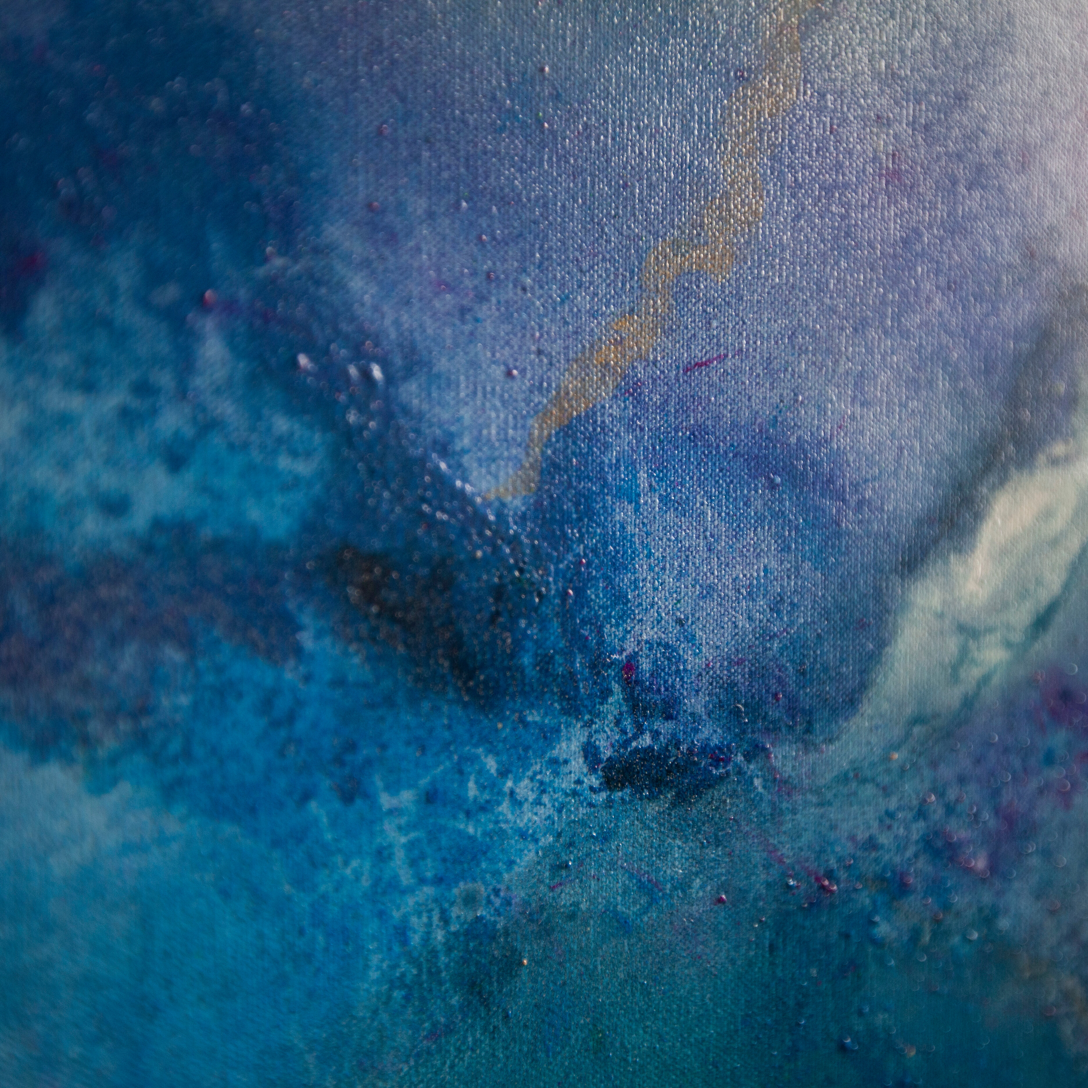 Niebieska abstrakcja inspirowana krajobrazem górskim. Delikatne, falujące linie i głębokie odcienie błękitu tworzą wizję przestrzeni – surowej, ale jednocześnie spokojnej. Kompozycja przypomina warstwice topograficzne lub sylwetki pasm górskich tonących w mglistym świetle świtu. Zacierające się kontury nadają obrazowi wrażenie snu – jakby uchwycono wspomnienie podróży w miejsce, które istnieje bardziej w wyobraźni niż na mapie.