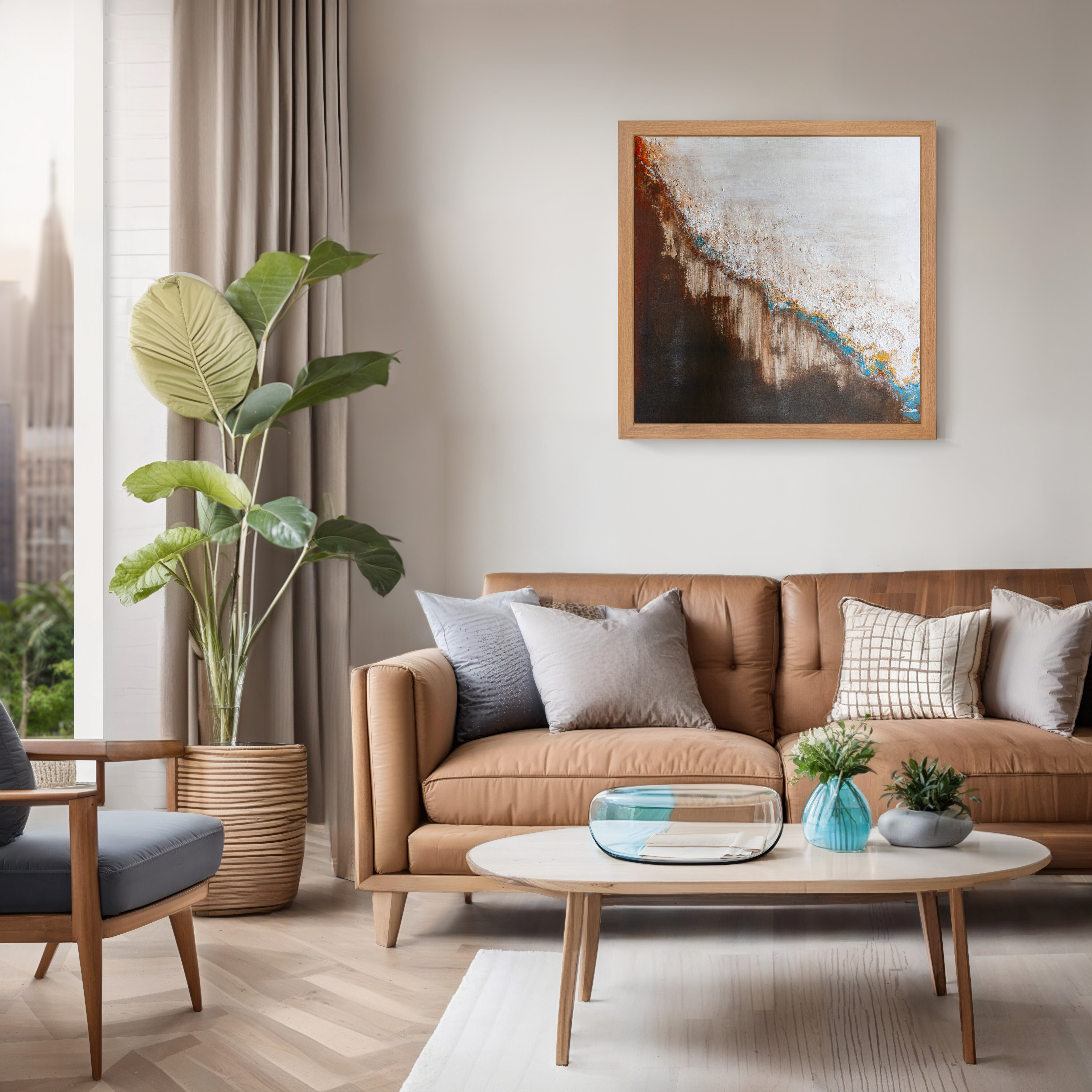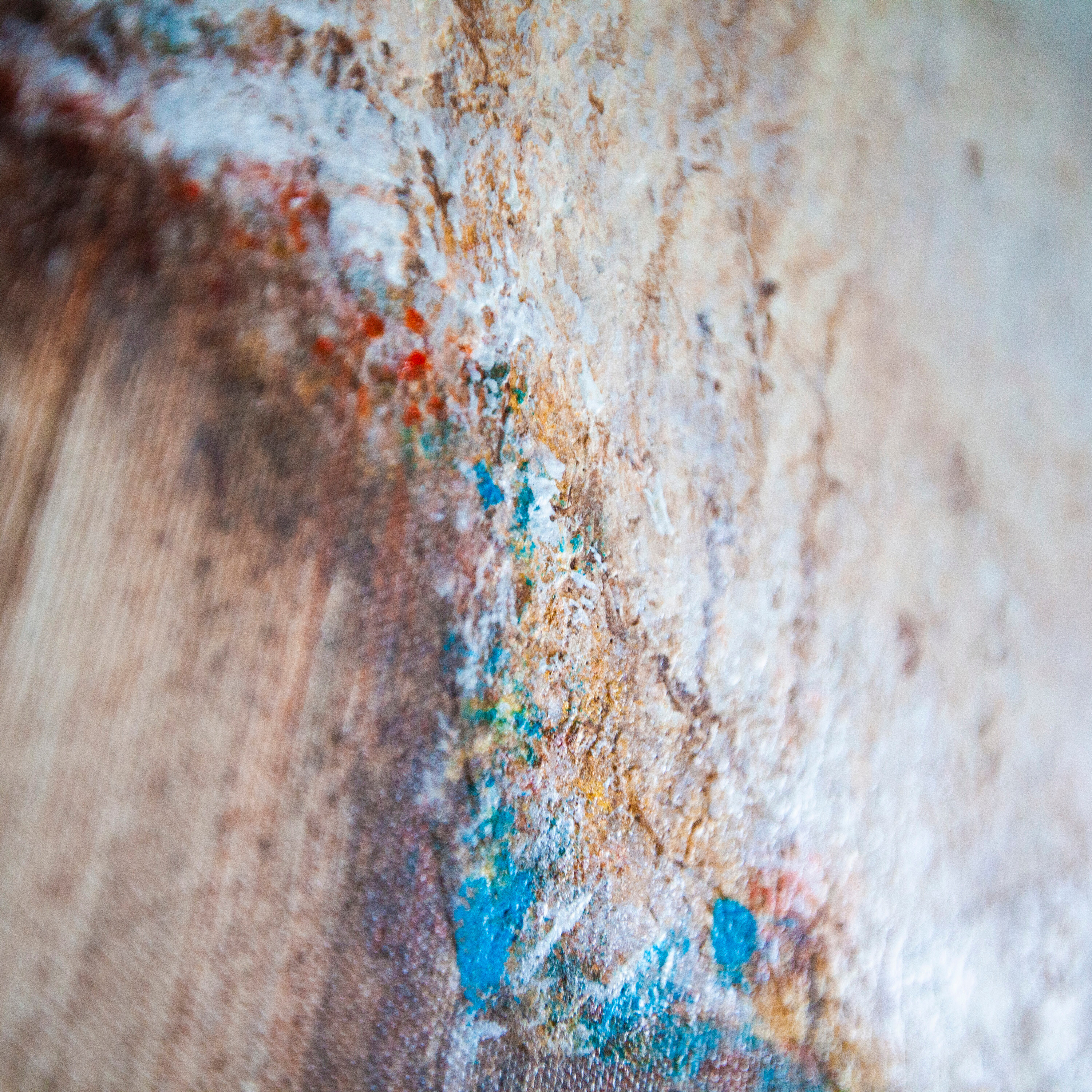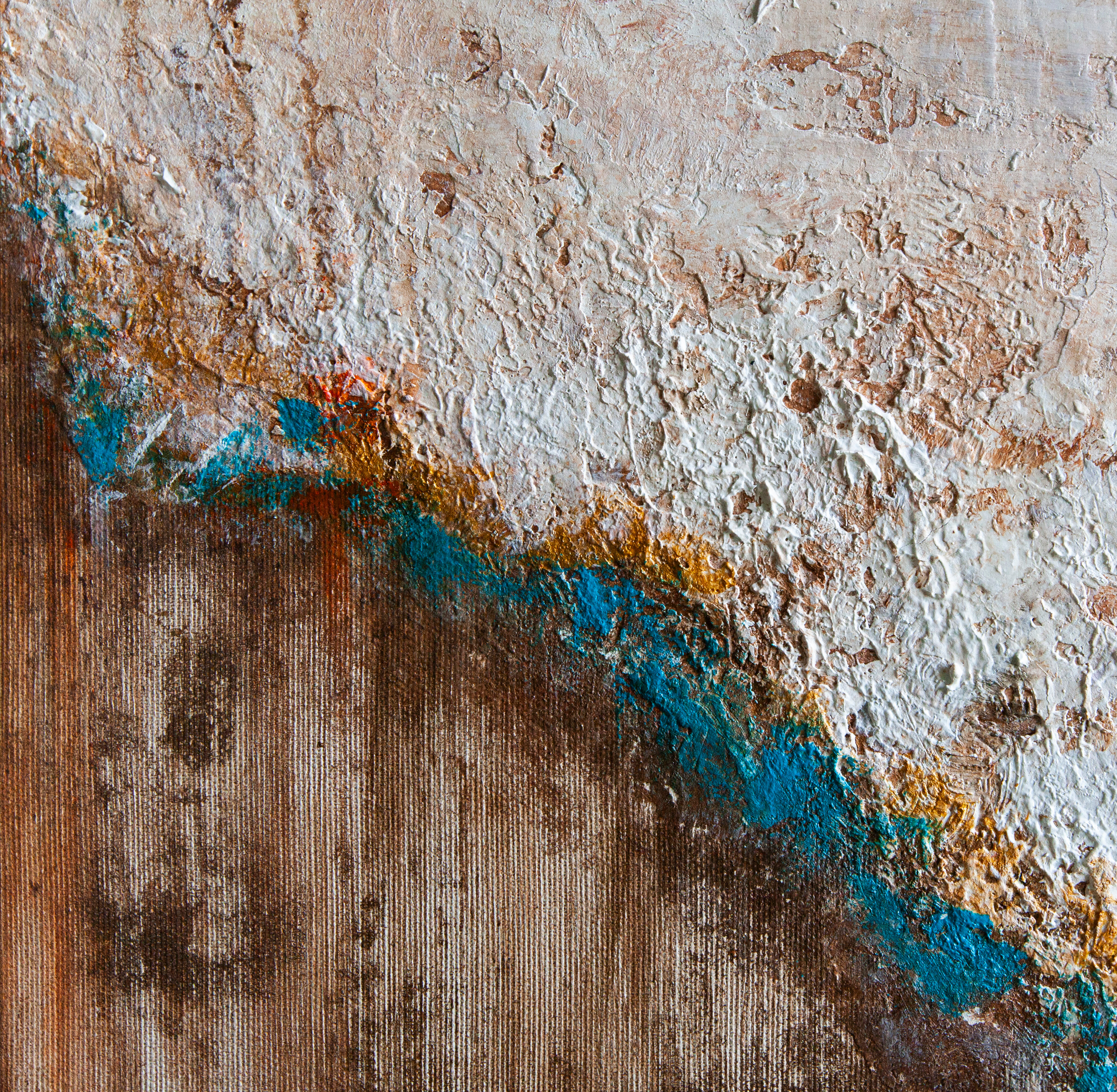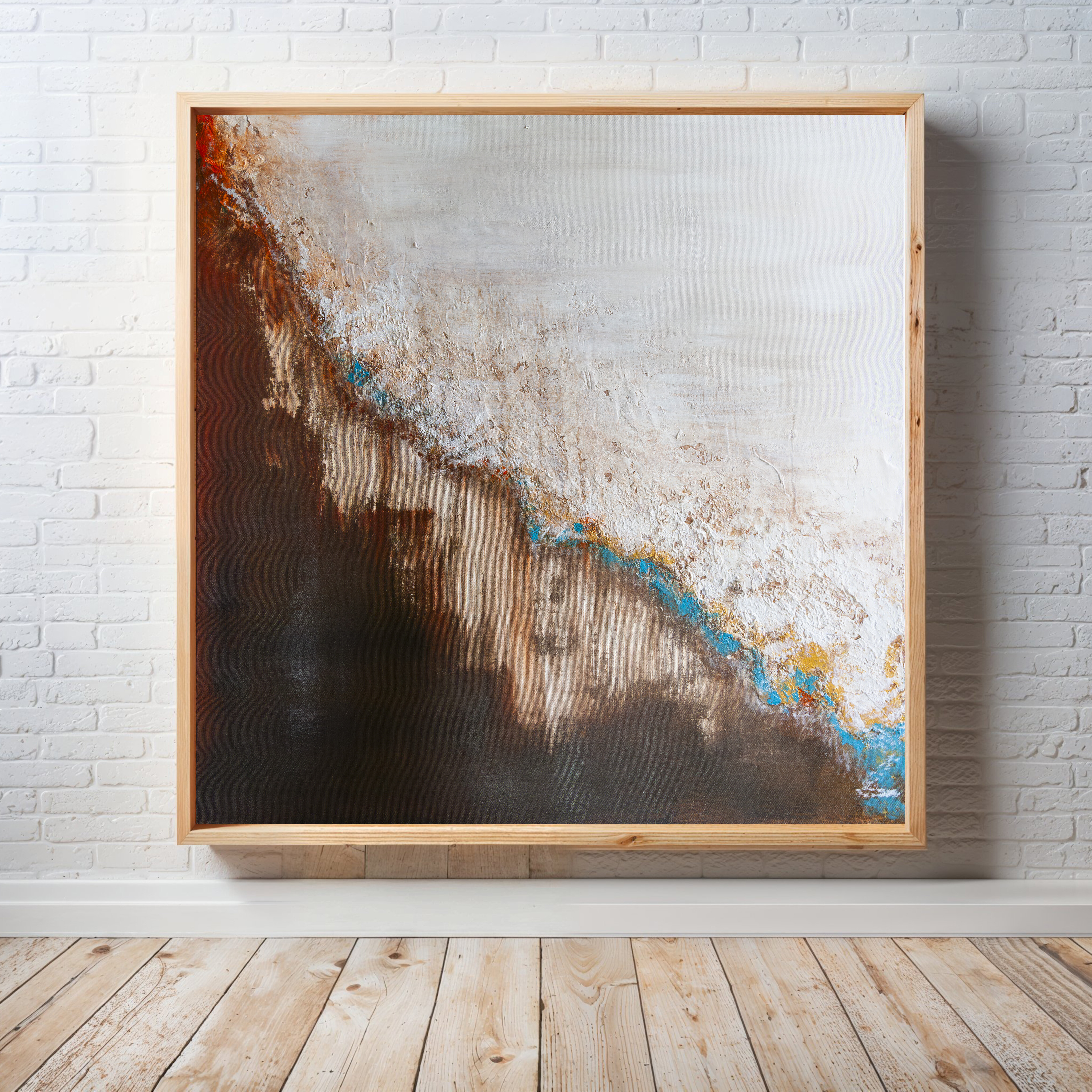Obraz abstrakcyjny utrzymany w stonowanej kolorystyce ziemi - ciepłych brązów, rudości, kremowej bieli, pomarańczy i turkusu. Ten niezwykle stonowany obraz nie krzyczy, bije z niego harmonia kolorów, równowaga detali a kolorowe dodatki są niczym wisienka na torcie.