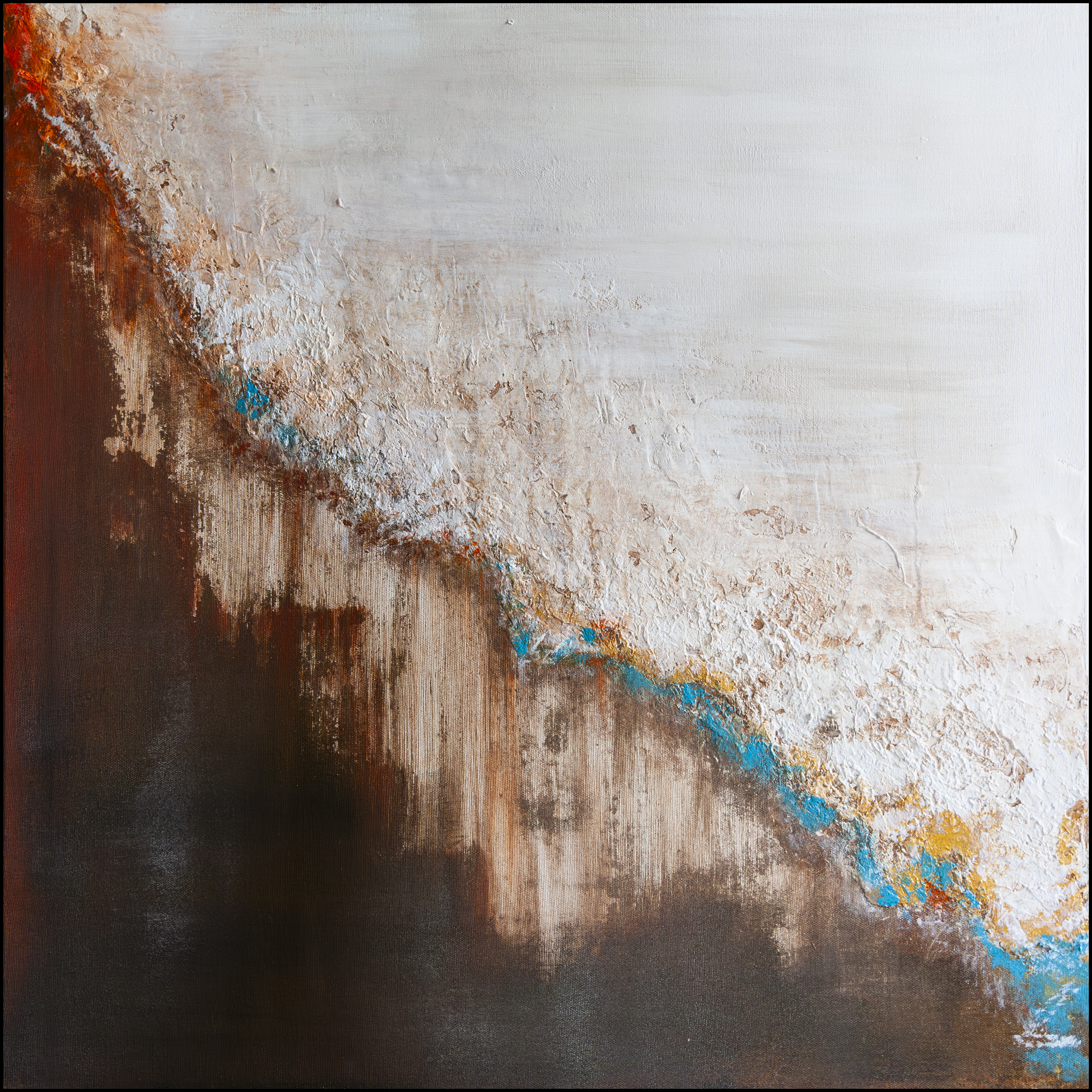 Obraz abstrakcyjny wykonany techniką mieszaną - akryl, olej oraz faktura. Zabezpieczony błyszczącym werniksem, boki pracy zamalowane.