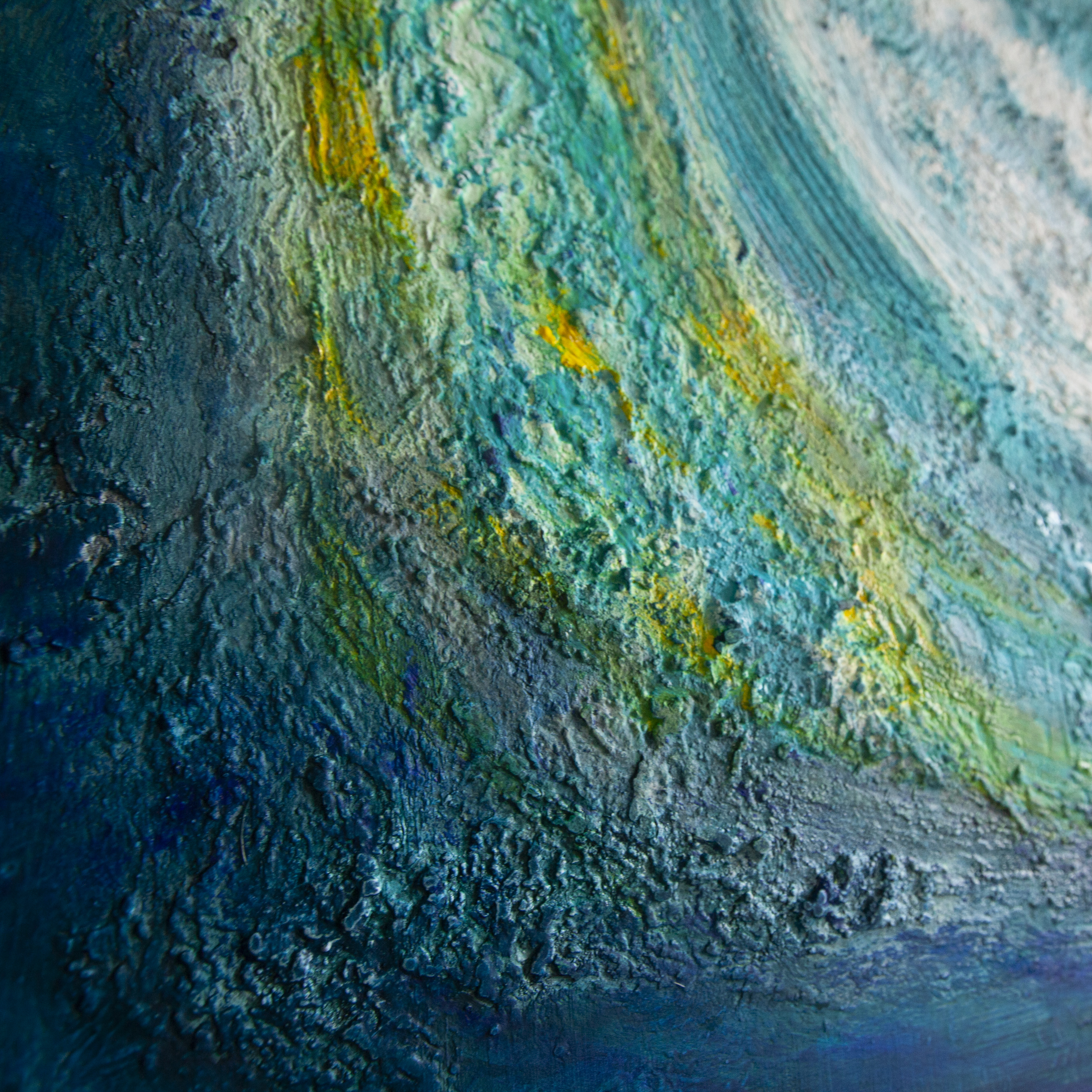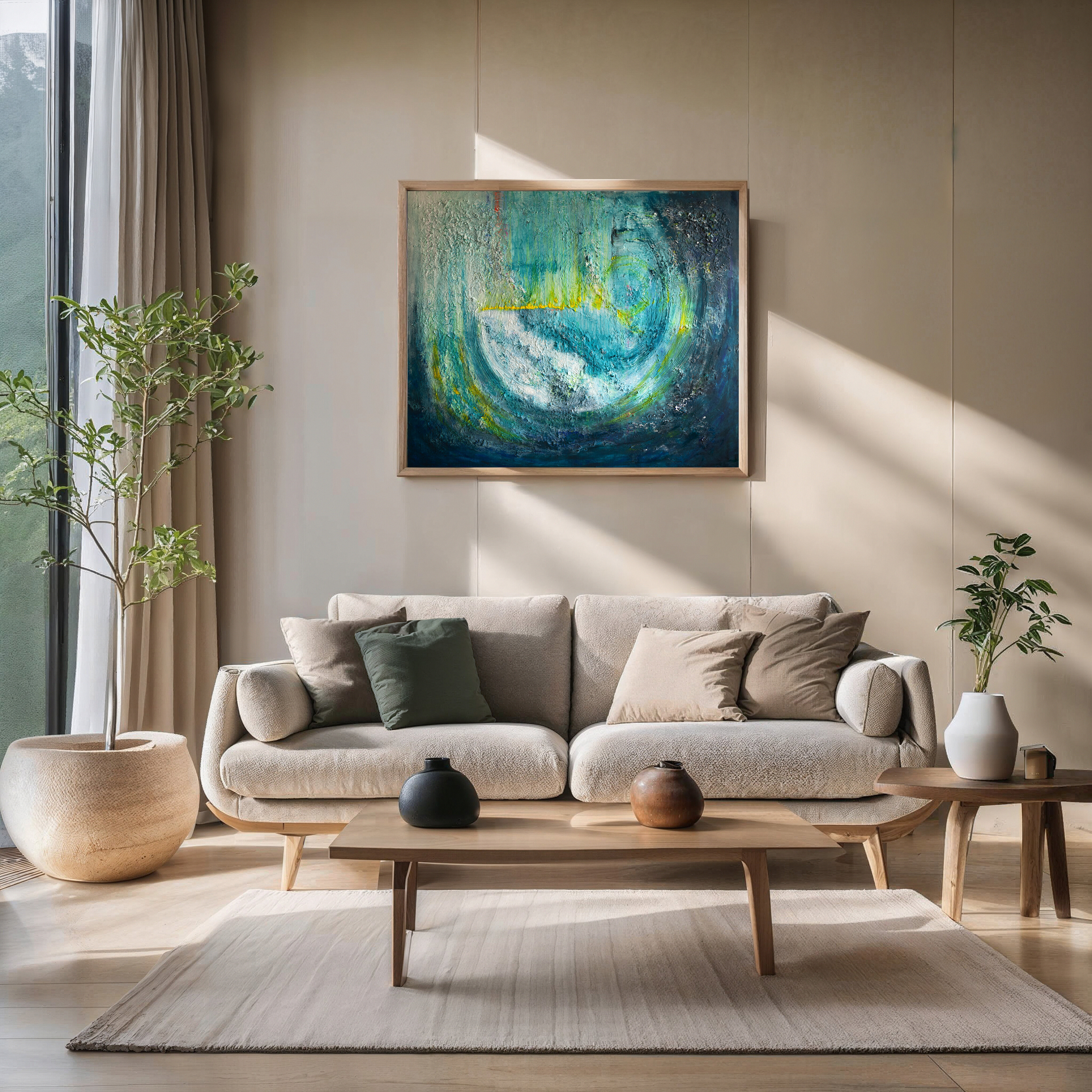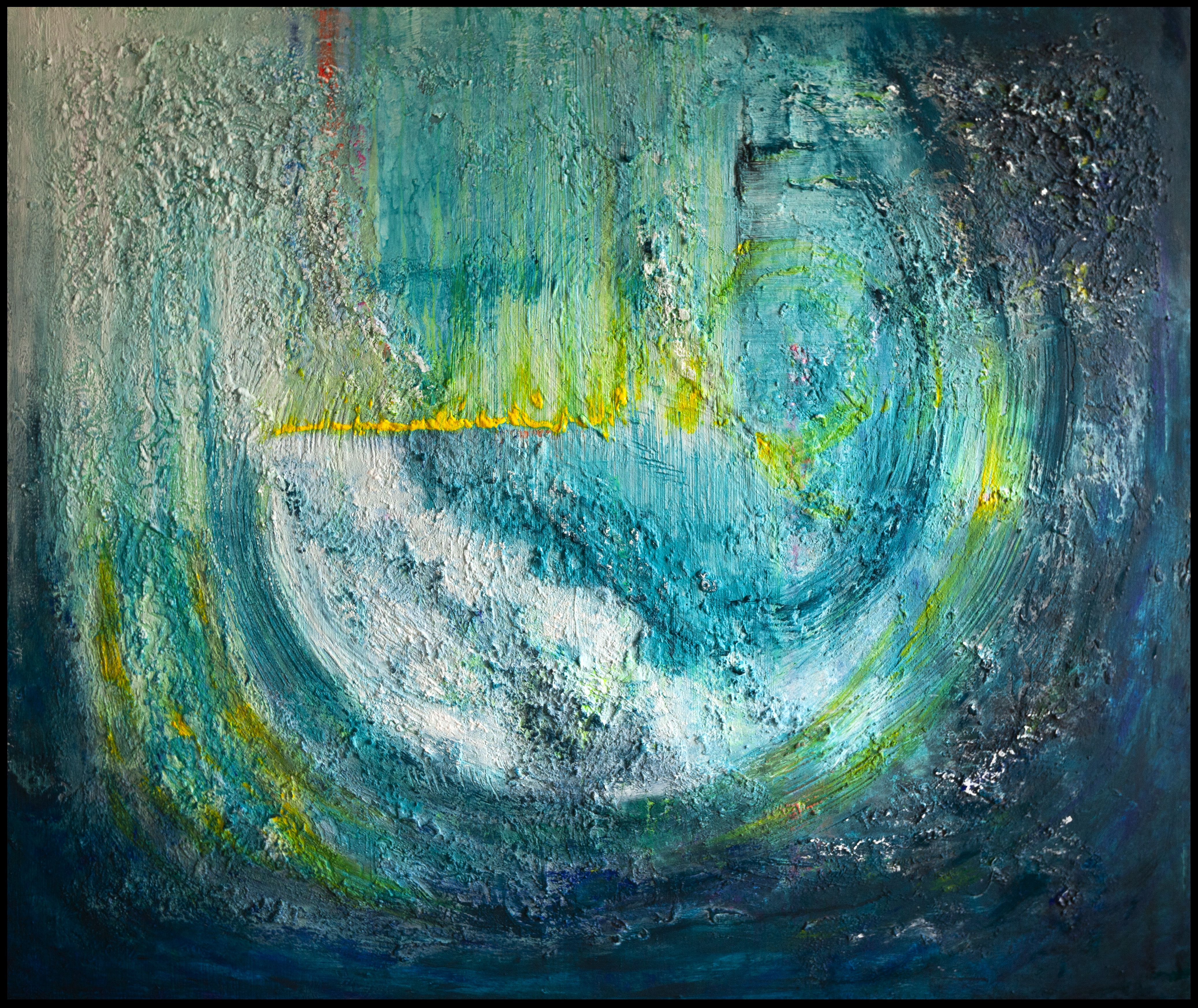 Abstrakcyjny obraz o wymiarach 120 x 100 cm, wykonany techniką mixed media i zabezpieczony błyszczącym werniksem.