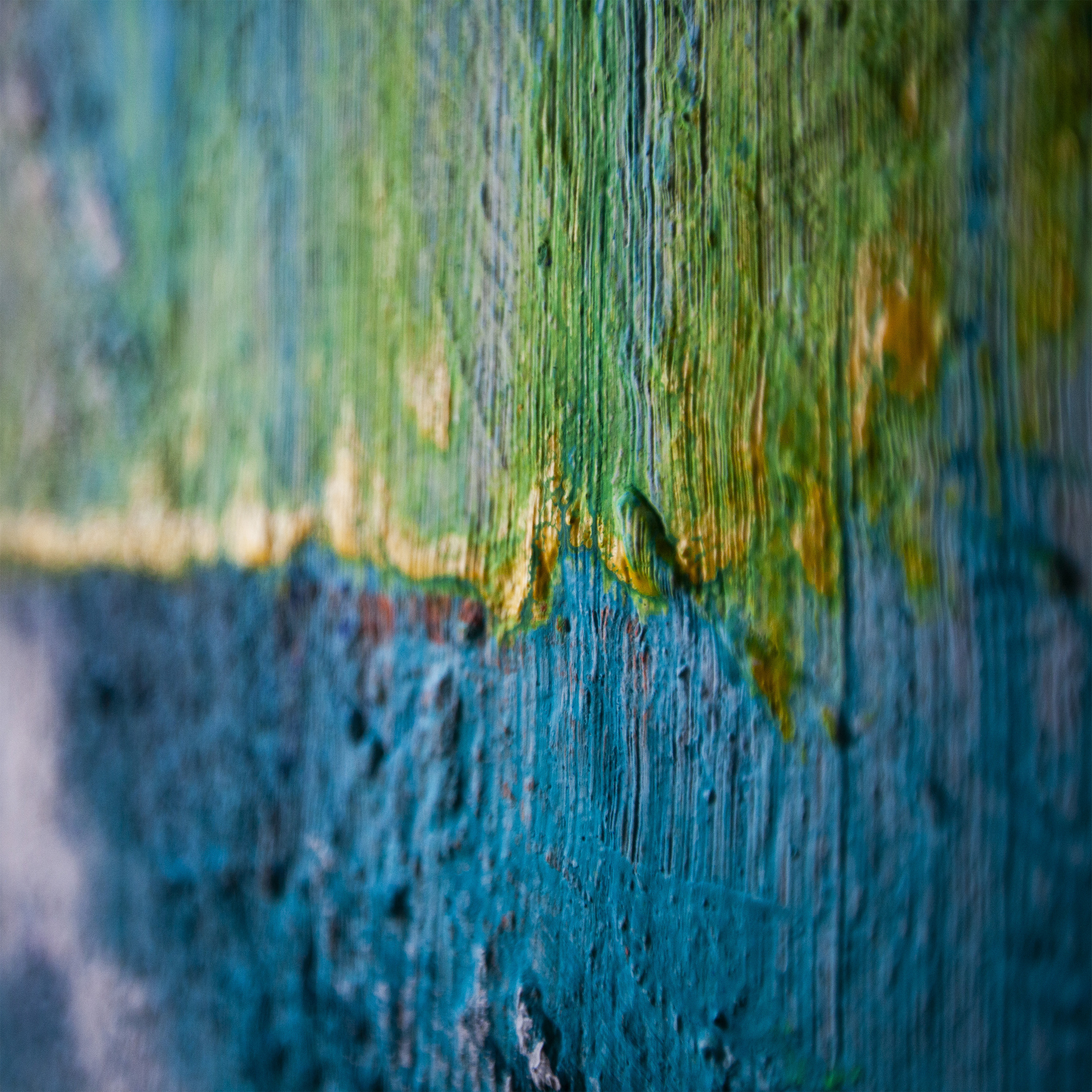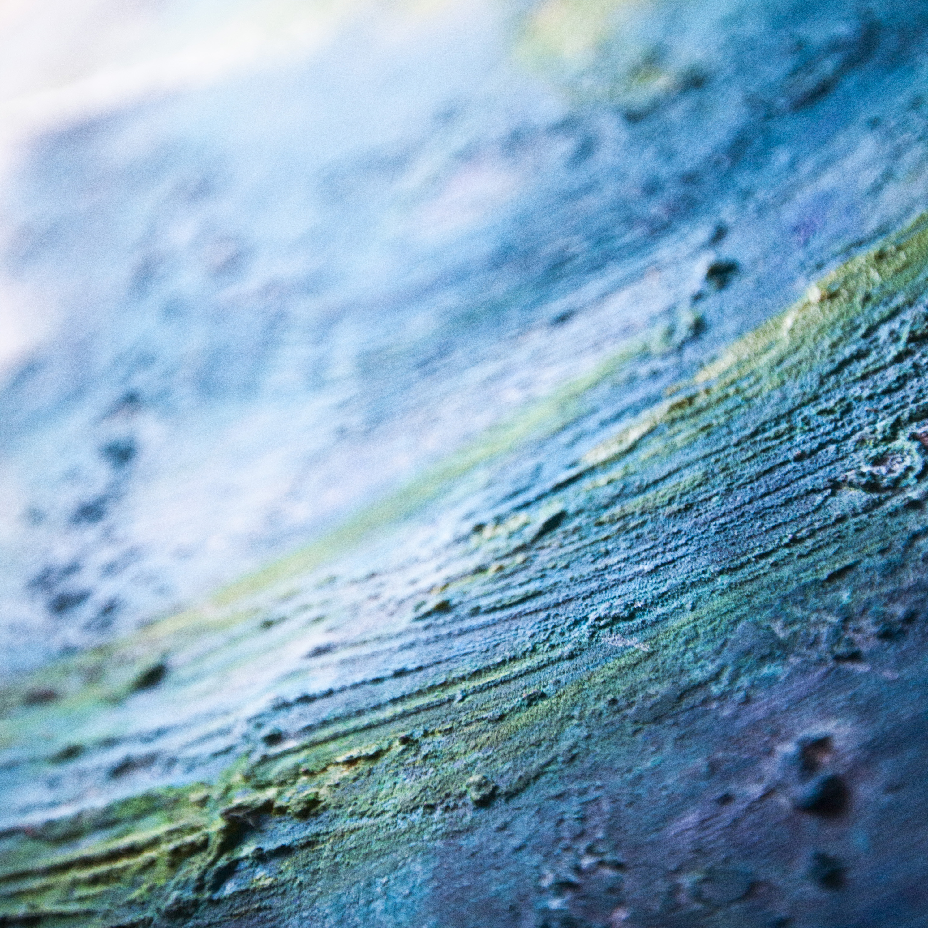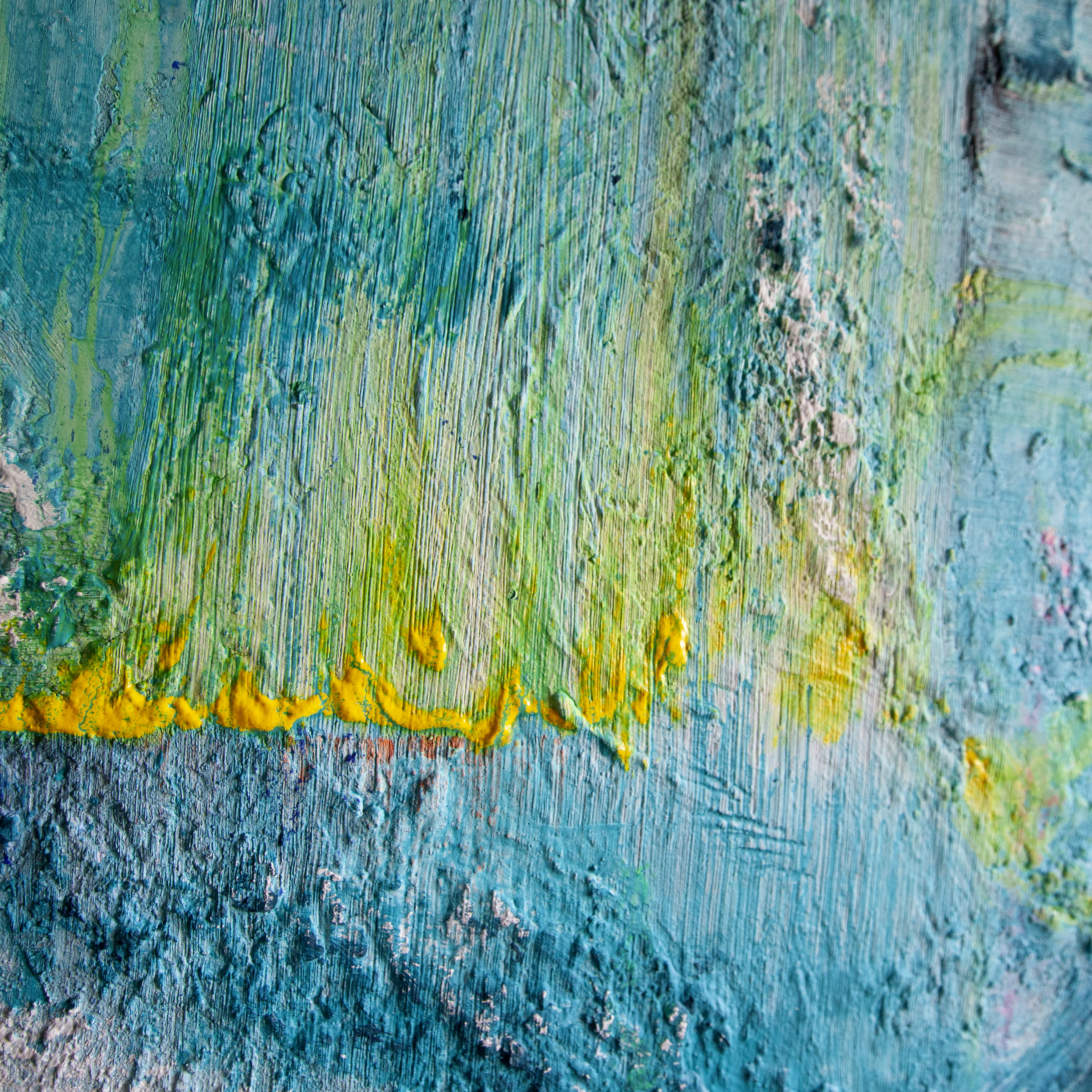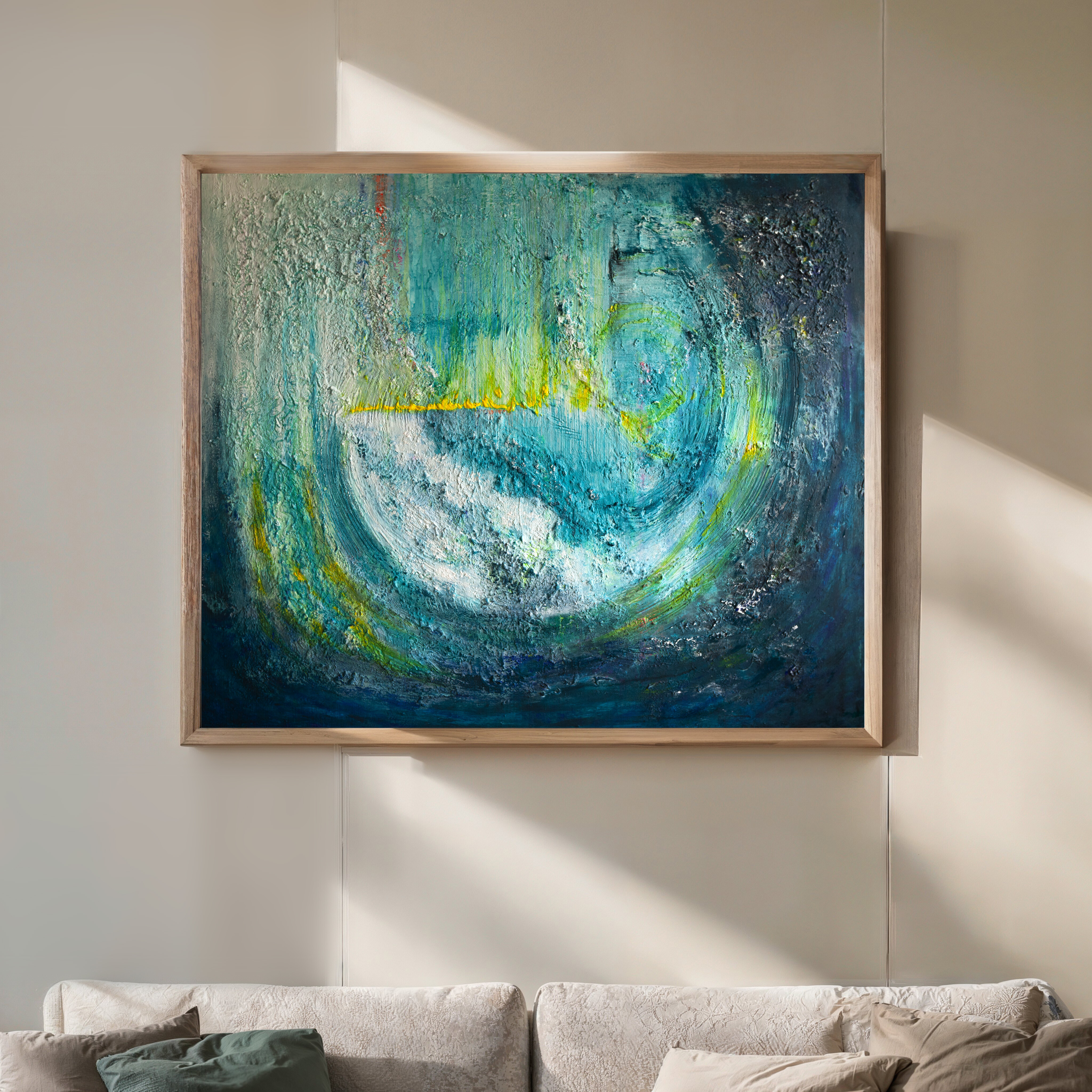 Obraz abstrakcyjny "Constellation Lyra" o magnetycznych i soczystych kolorach butelkowej zieleni połączonej z błękitem i żółcią. Jest to bardzo oryginalna propozycja inspirowana kosmosem, ziemią z oddali, rozkwitem trawy i bielą chmur.