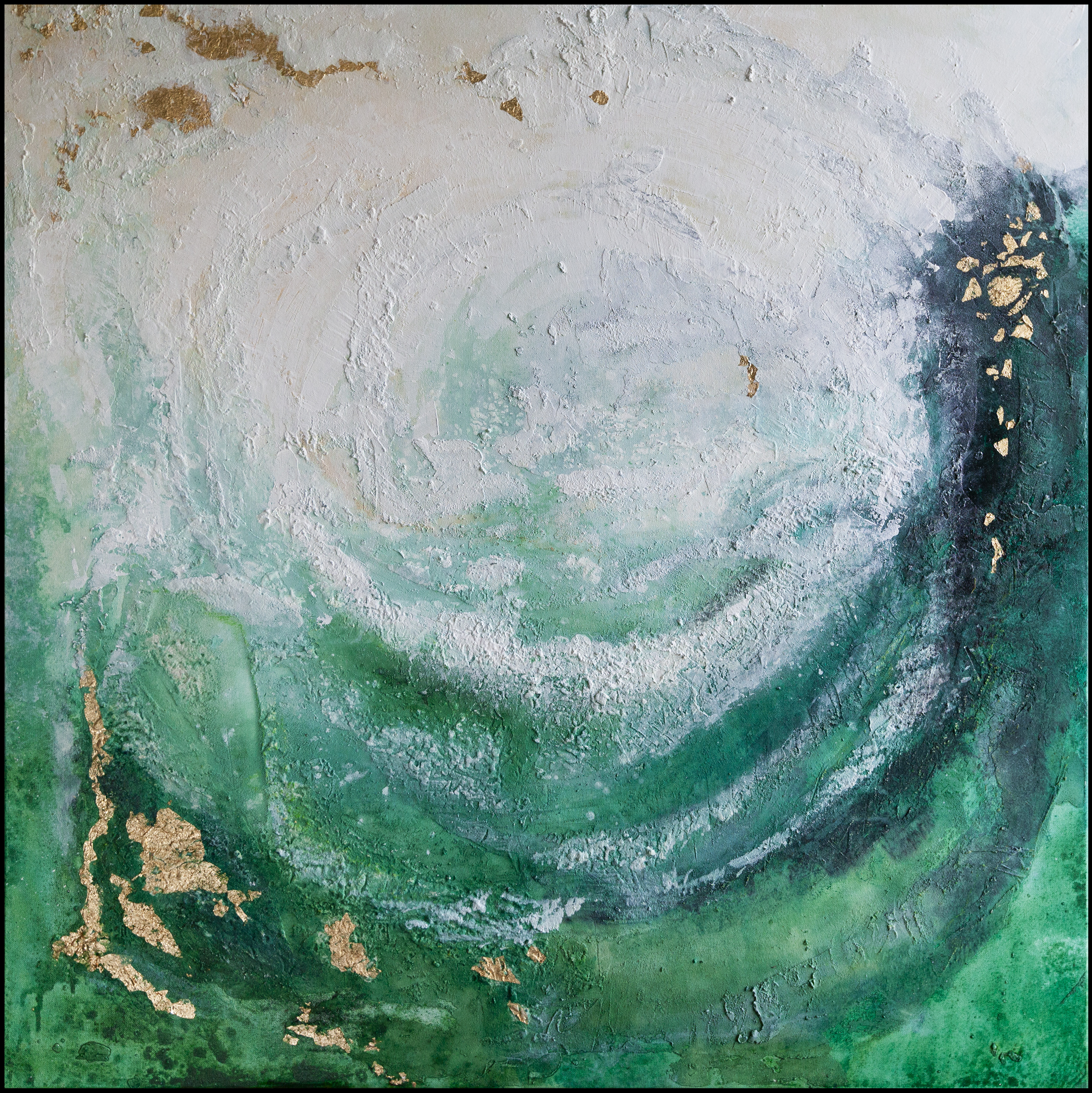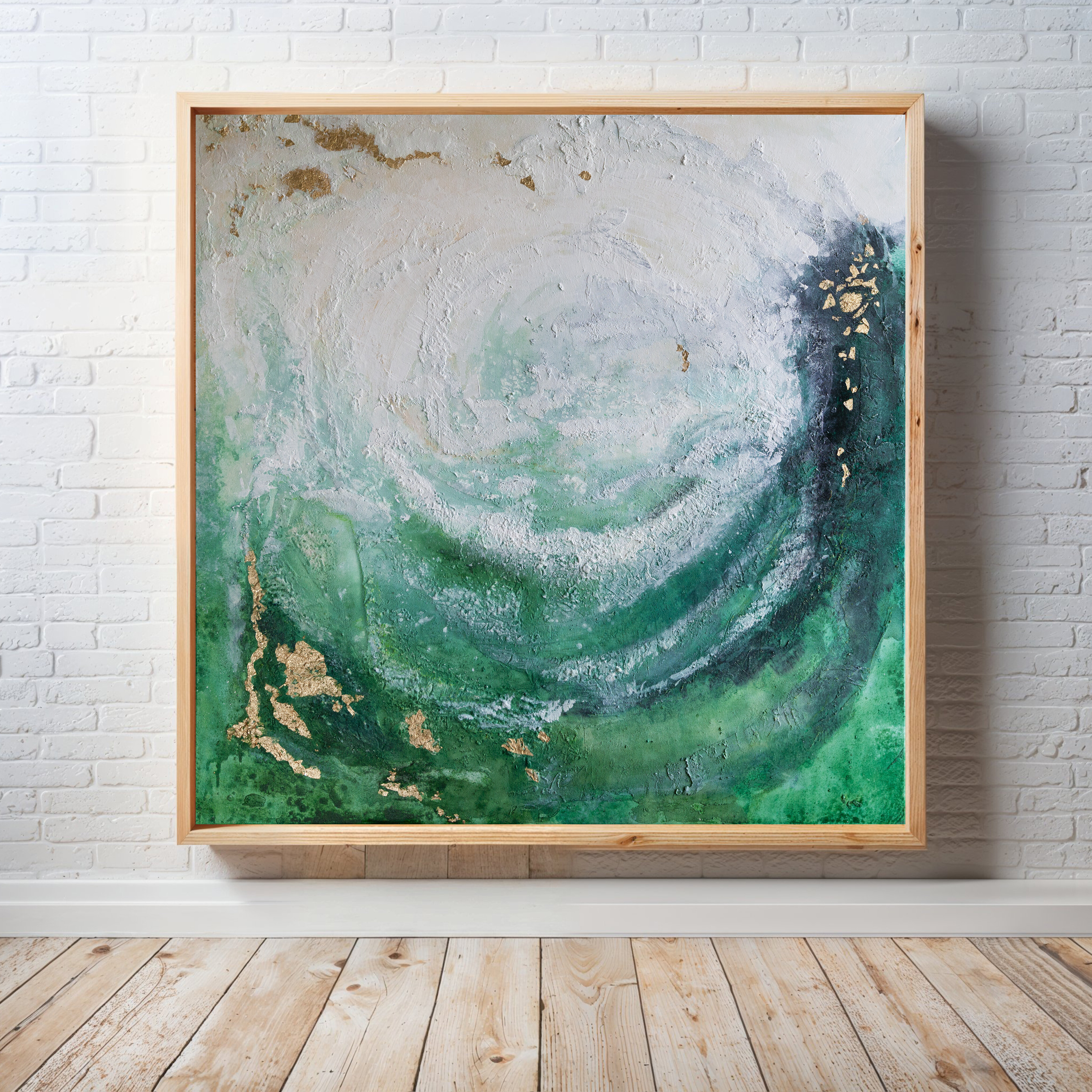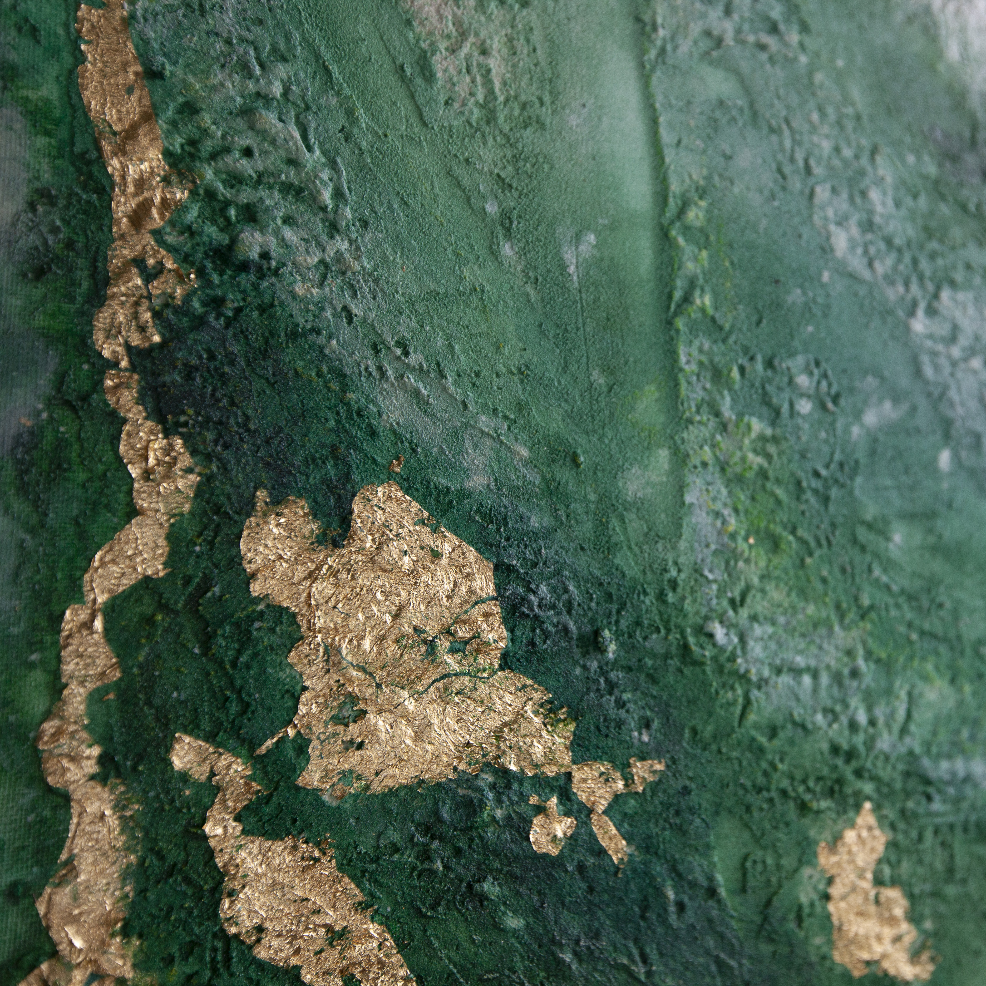 Piękny szafirowy obraz abstrakcyjny Emerald Island jest z pewnością jednym z tych obrazów, obok których nie sposób przejść obojętnie. Obraz posiada bardzo bogatą strukturę, która niczym wir unosi soczystą zieleń połączoną z bielą. Oba kolory spotykają się i nawzajem uzupełniają tworząc niesamowicie energetyczne połączenie. Dodatkowym walorem obrazu są złocenia wykonane szlagmetalem, które mienią się podkreślając kolorystykę obrazu i współgrają z nią.