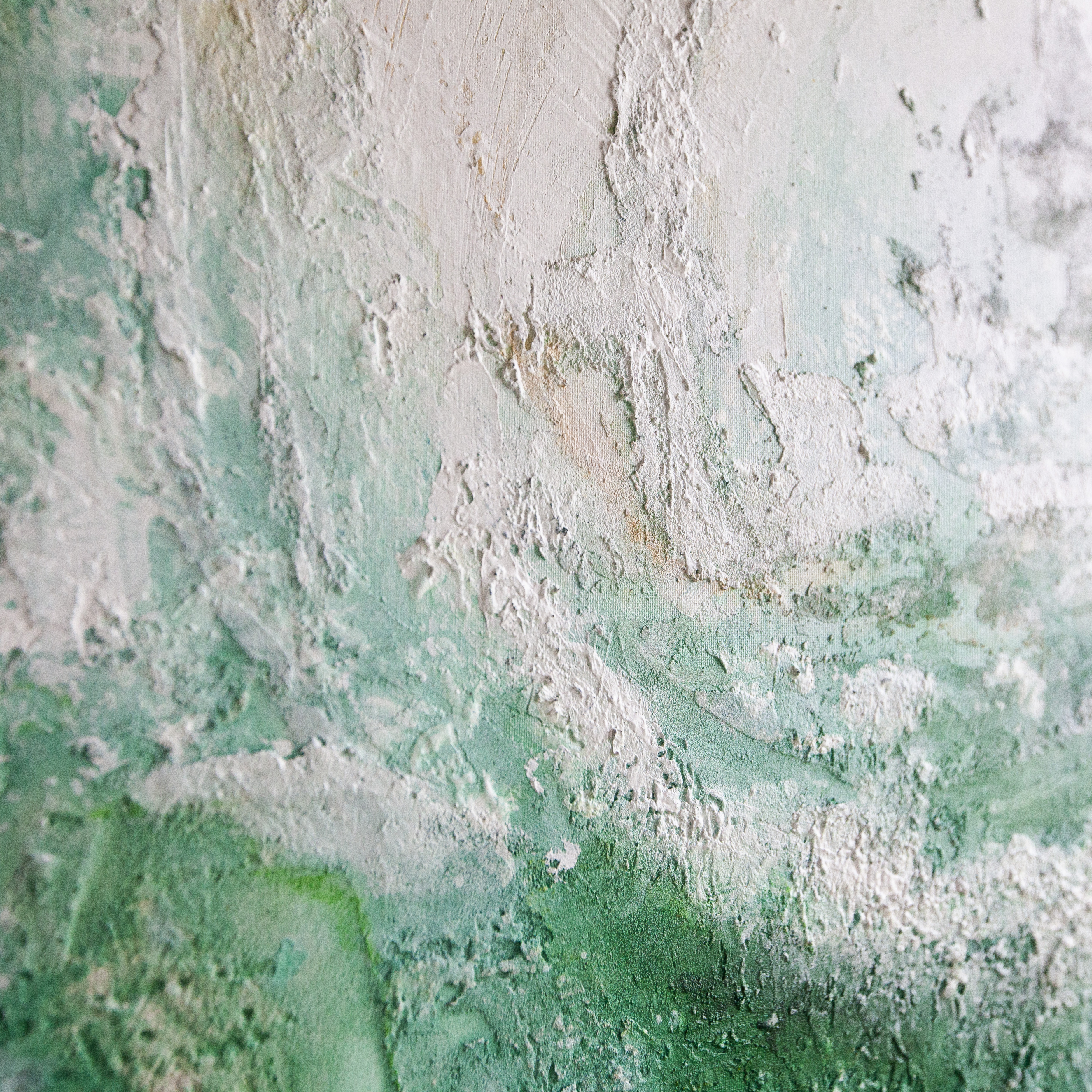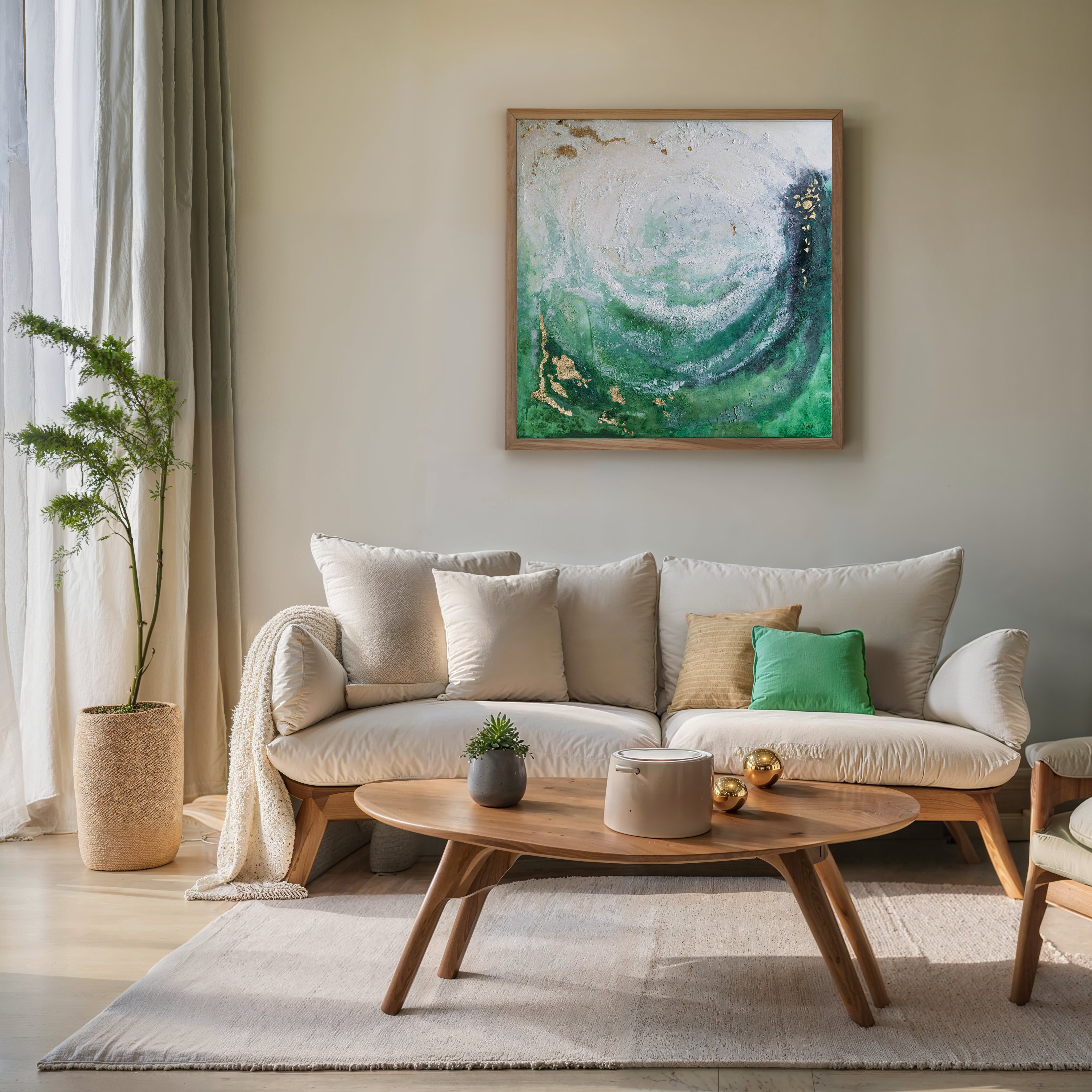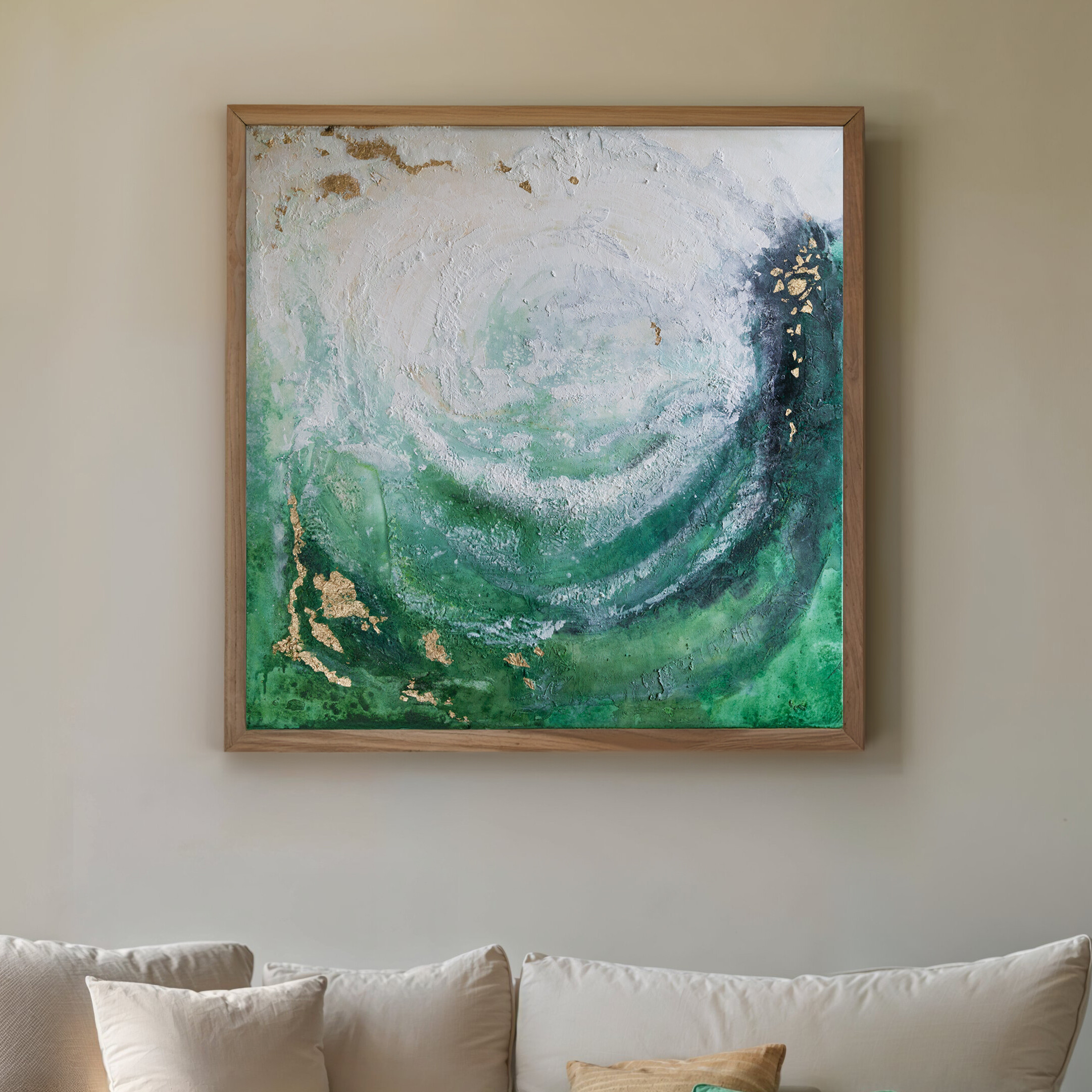 Piękny szafirowy obraz abstrakcyjny Emerald Island jest z pewnością jednym z tych obrazów, obok których nie sposób przejść obojętnie. Obraz posiada bardzo bogatą strukturę, która niczym wir unosi soczystą zieleń połączoną z bielą. Oba kolory spotykają się i nawzajem uzupełniają tworząc niesamowicie energetyczne połączenie. Dodatkowym walorem obrazu są złocenia wykonane szlagmetalem, które mienią się podkreślając kolorystykę obrazu i współgrają z nią.