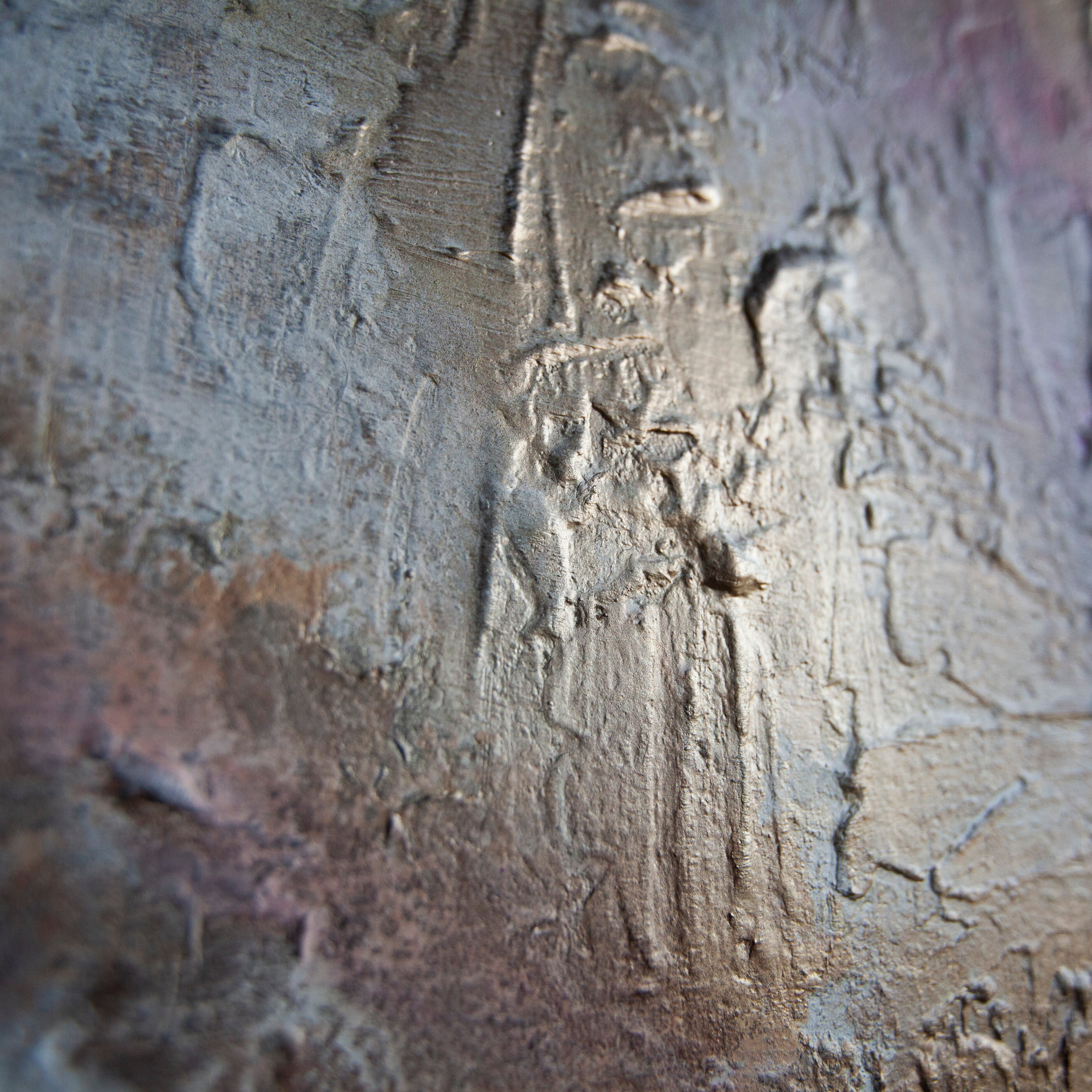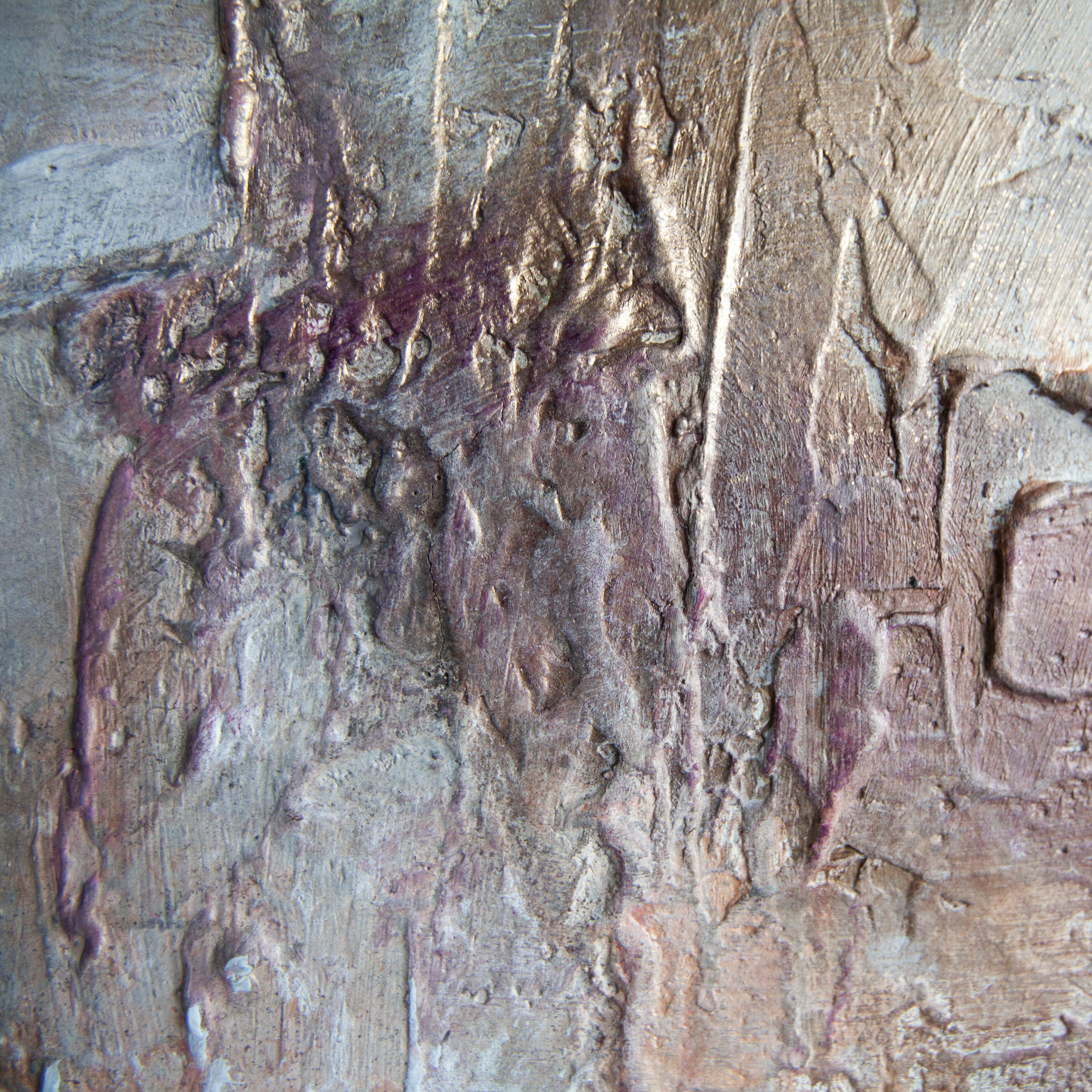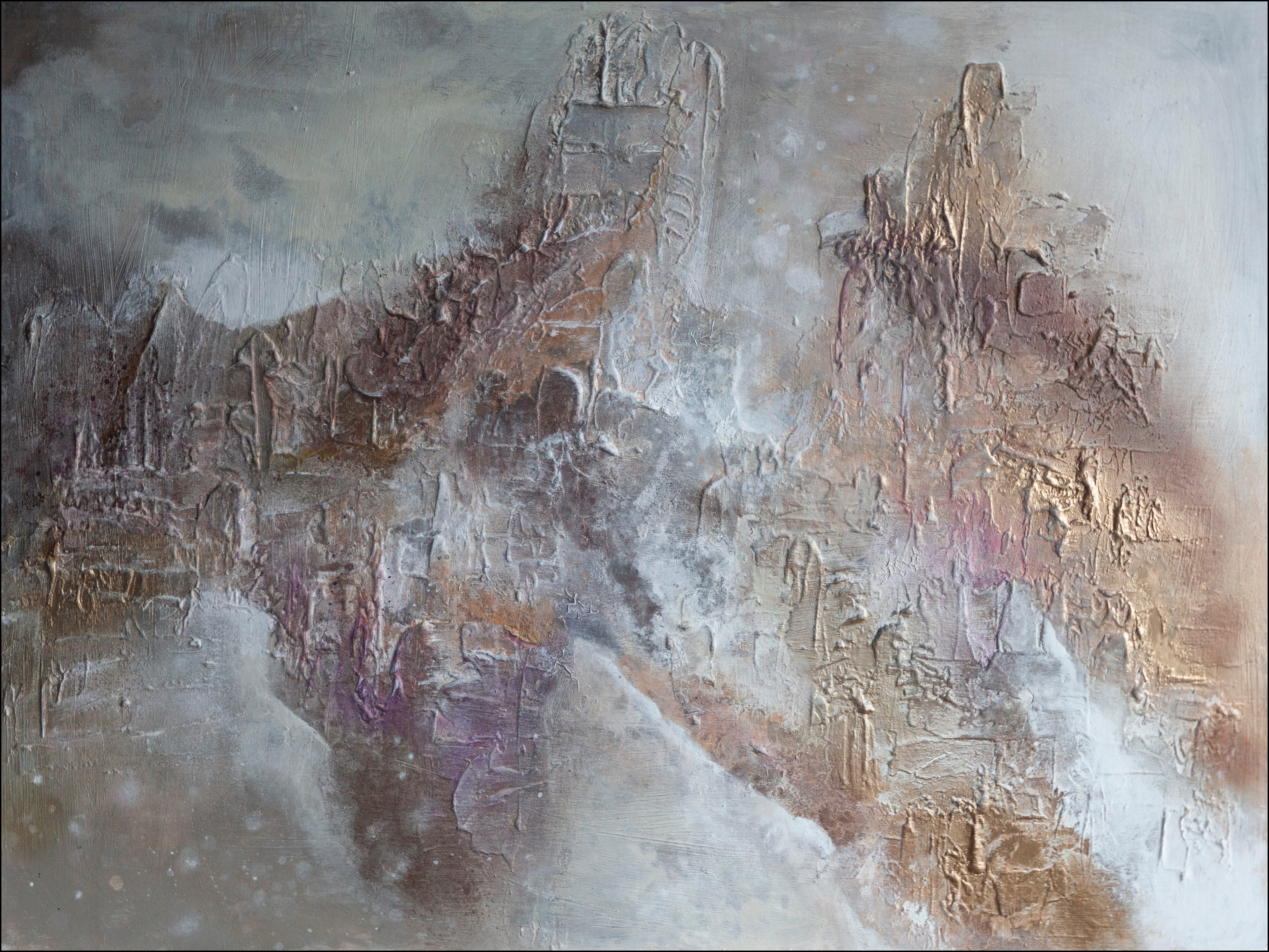 Obraz abstrakcyjny wykonany techniką mieszaną - olej, akryl, pasta strukturalna, spray złoty i miedziane drobinki.