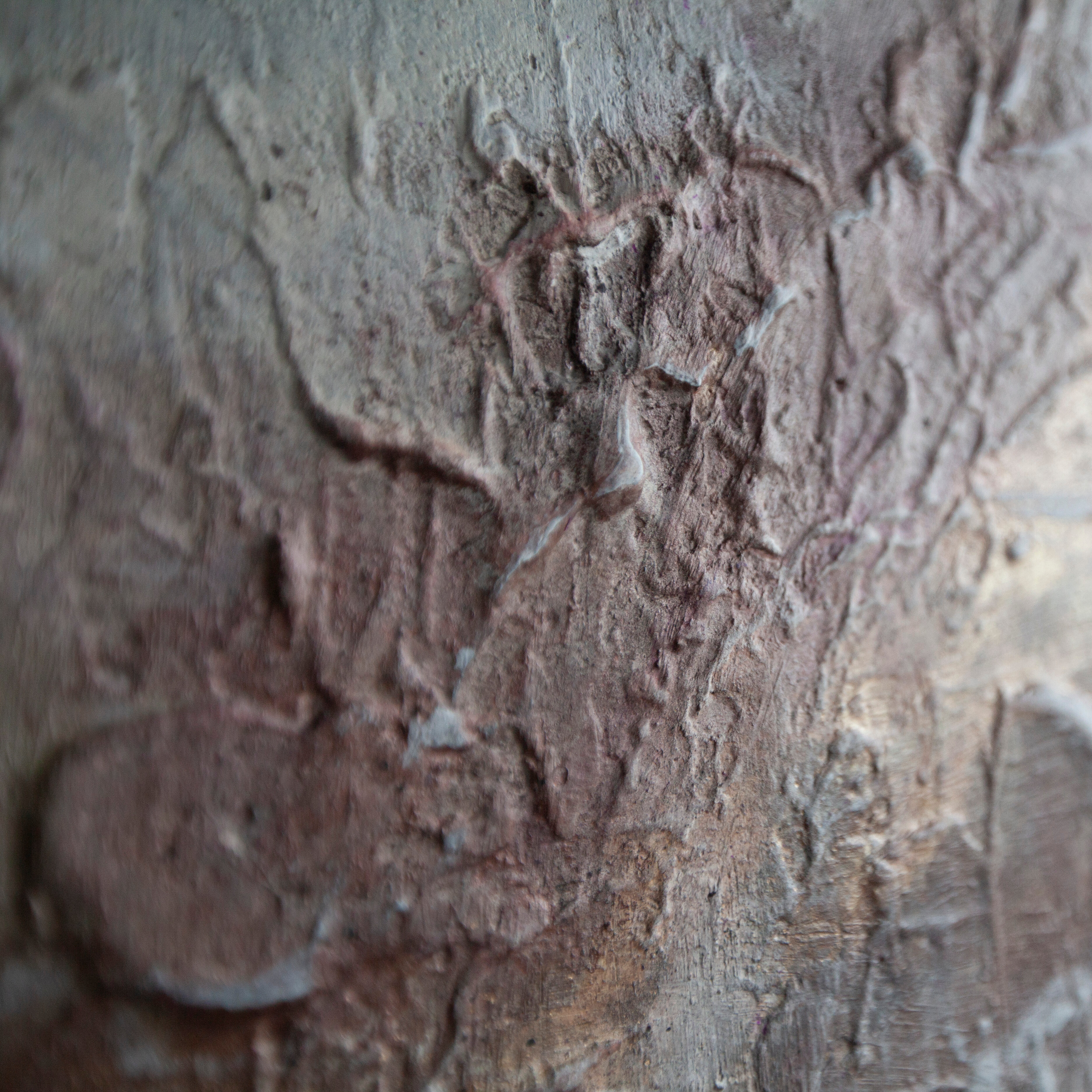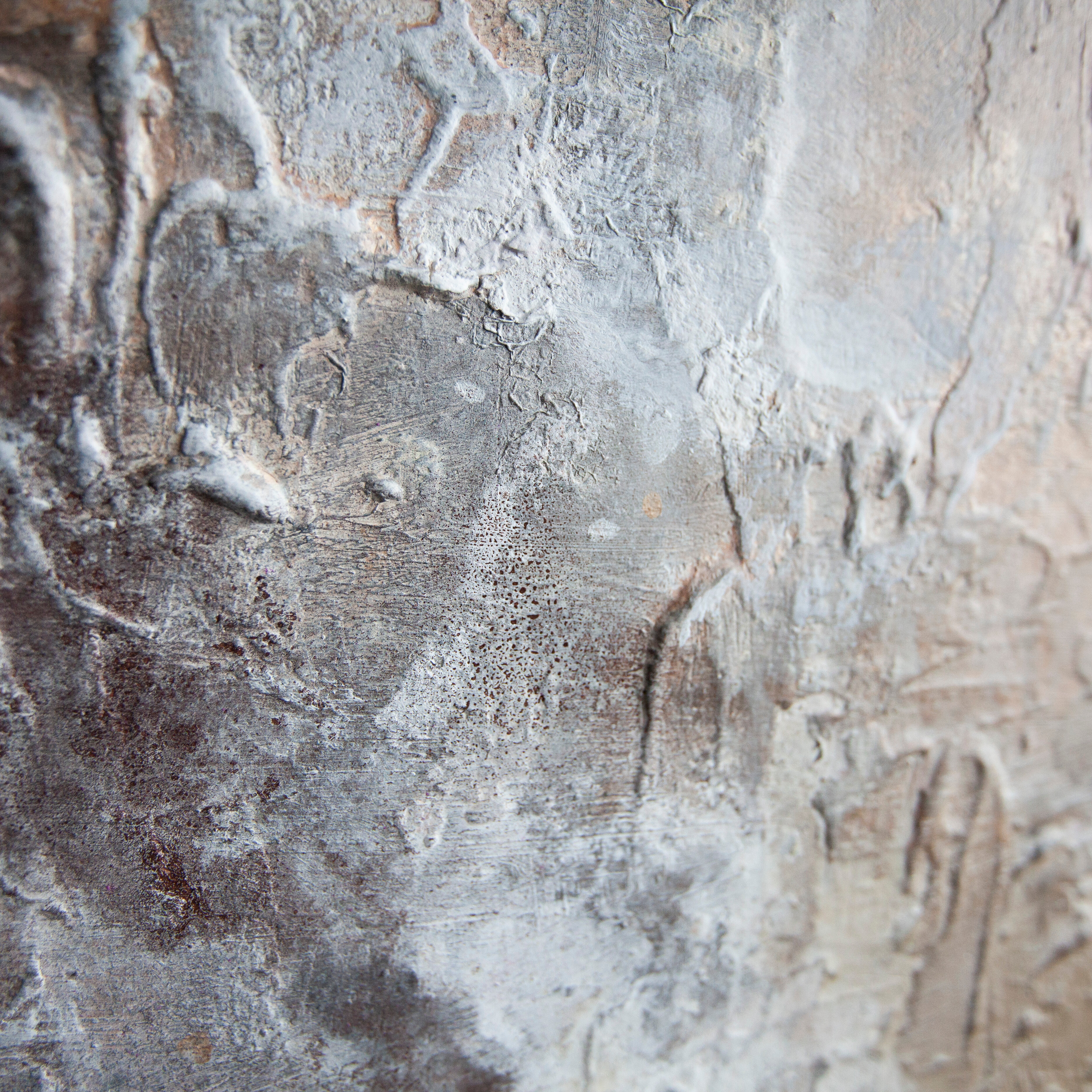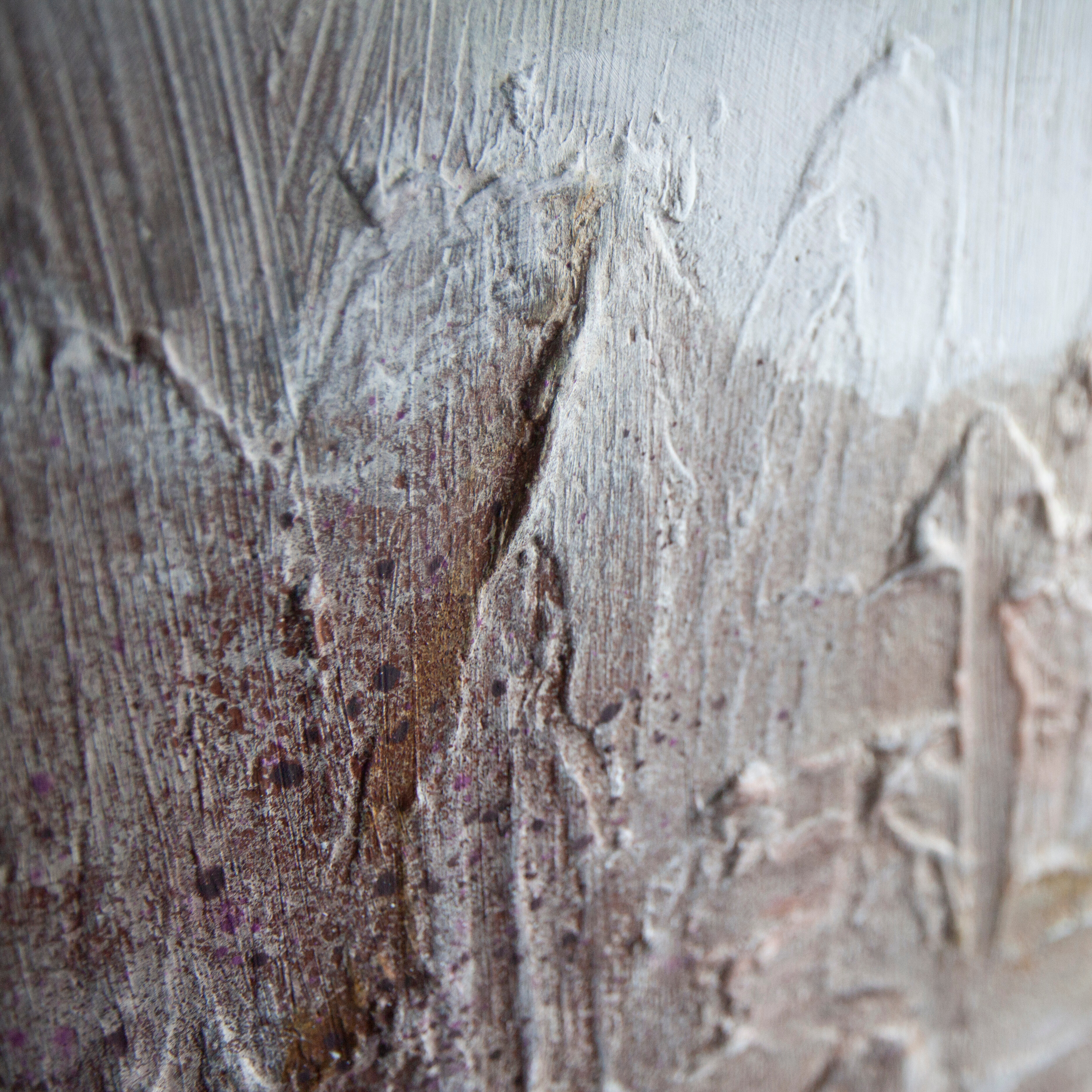 Obraz abstrakcyjny wykonany techniką mieszaną - olej, akryl, pasta strukturalna, spray złoty i miedziane drobinki.