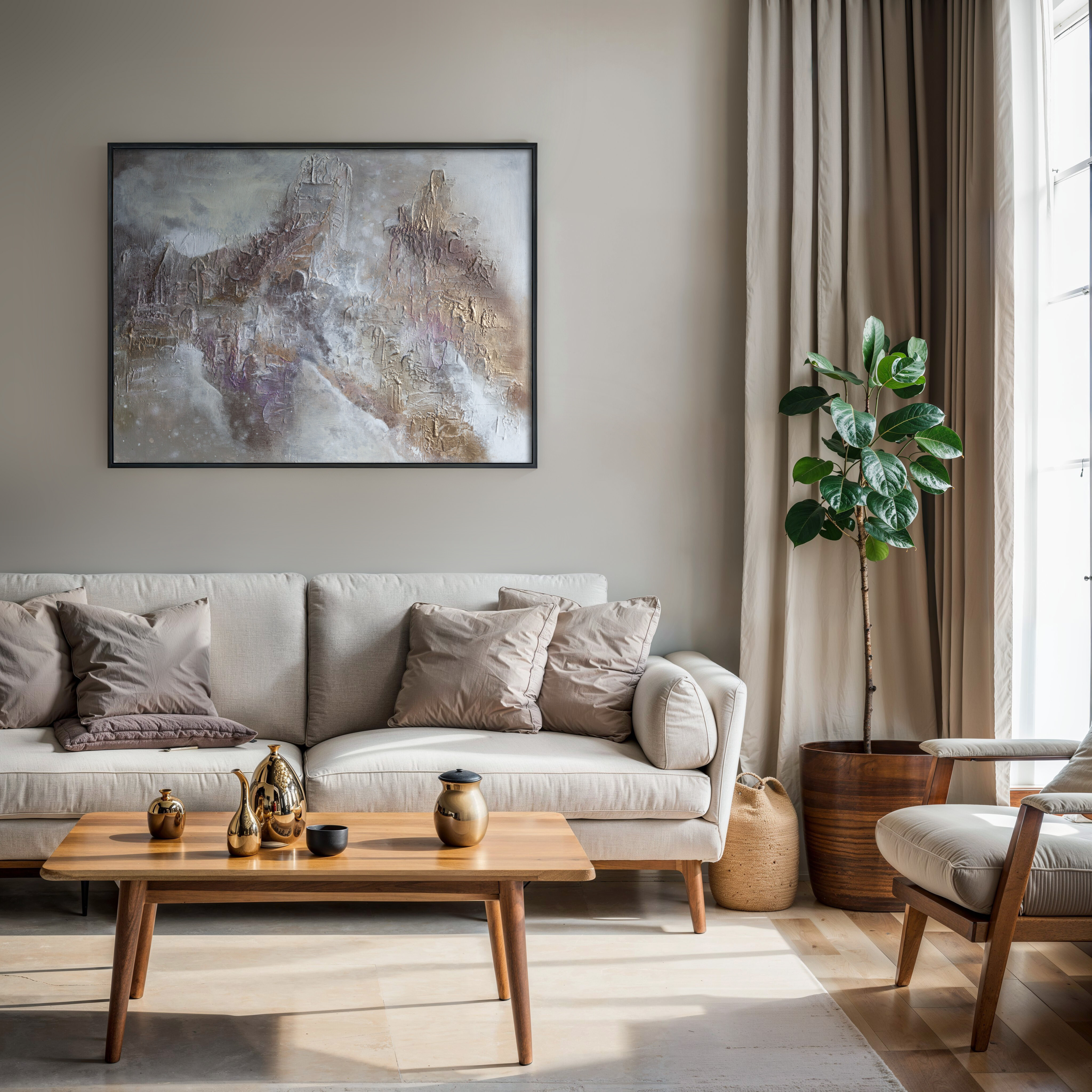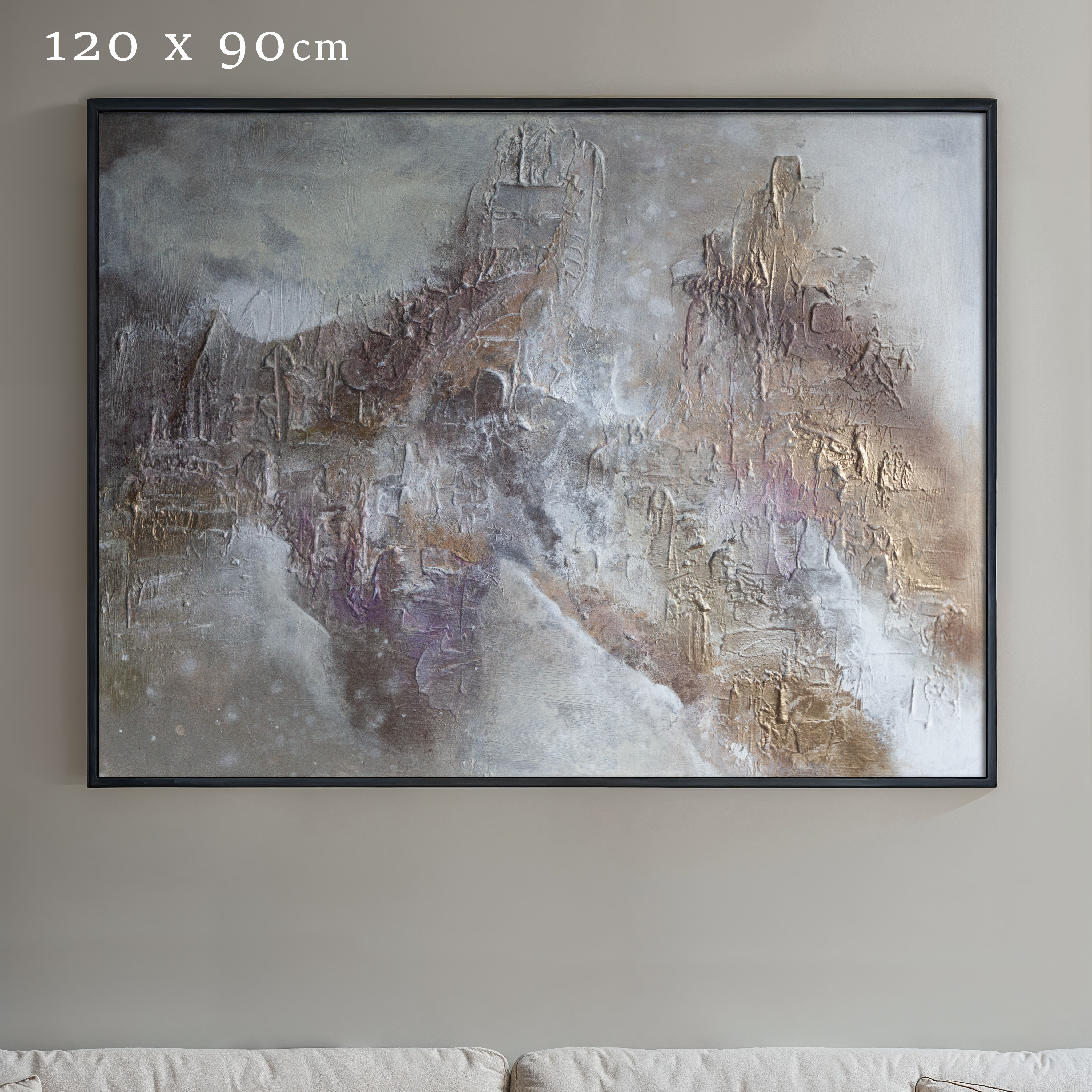 Obraz "Golden Dust" jest inspirowany tym, co ulotne i nieoczywiste - złotą pustynią, monumentalnymi górami, które spowija biała mgła - niech będzie dla Ciebie tym - Drogi widzu, co Ci w duszy gra.