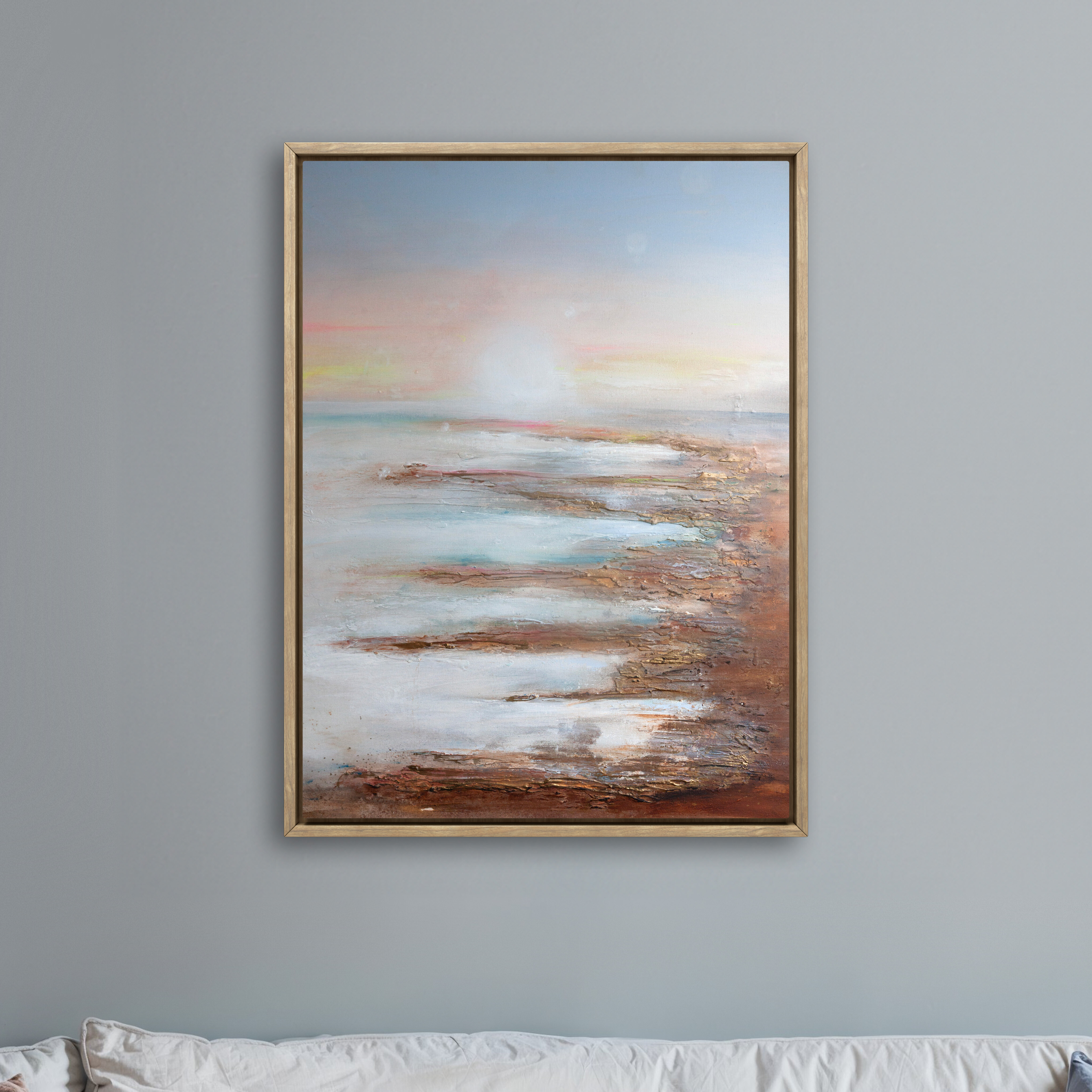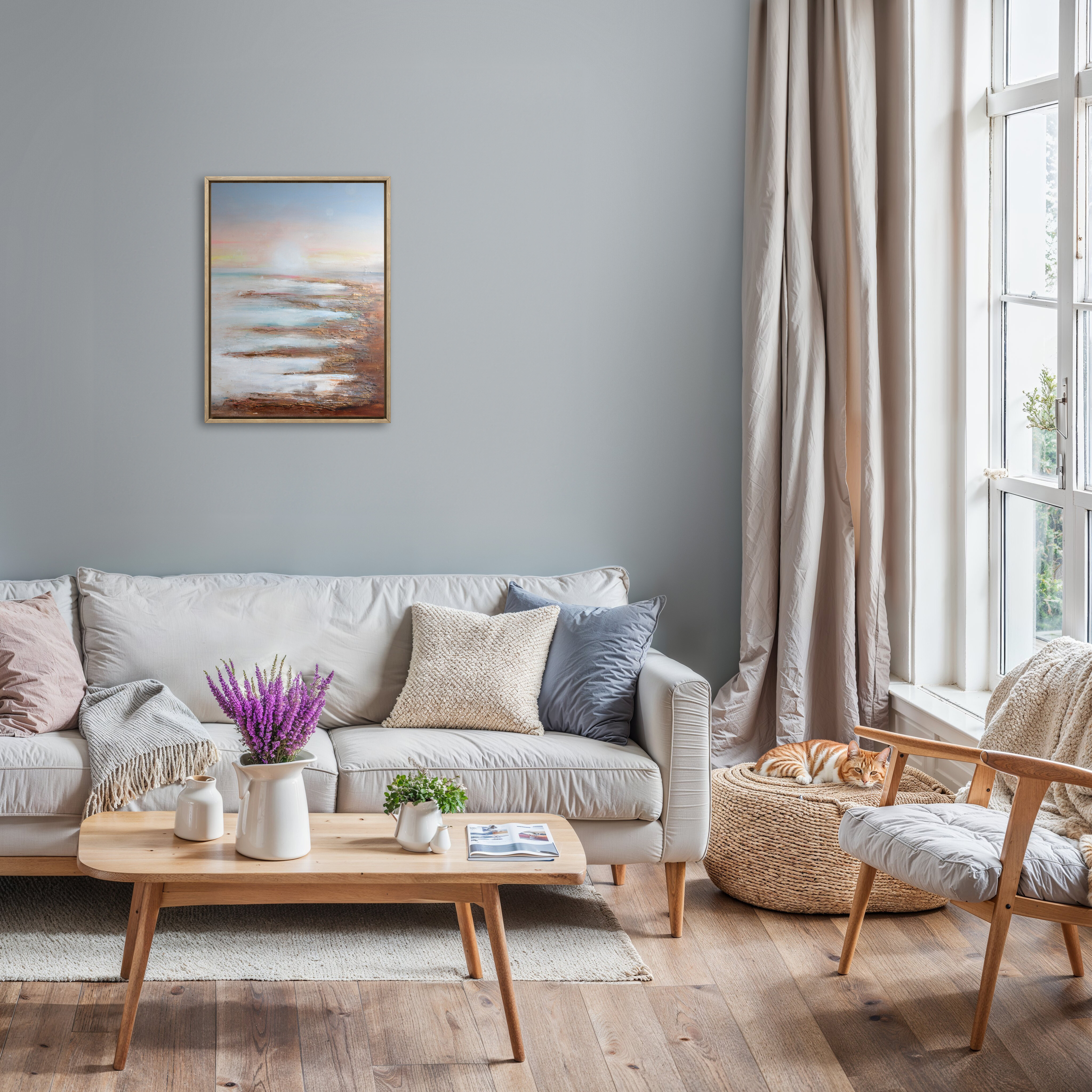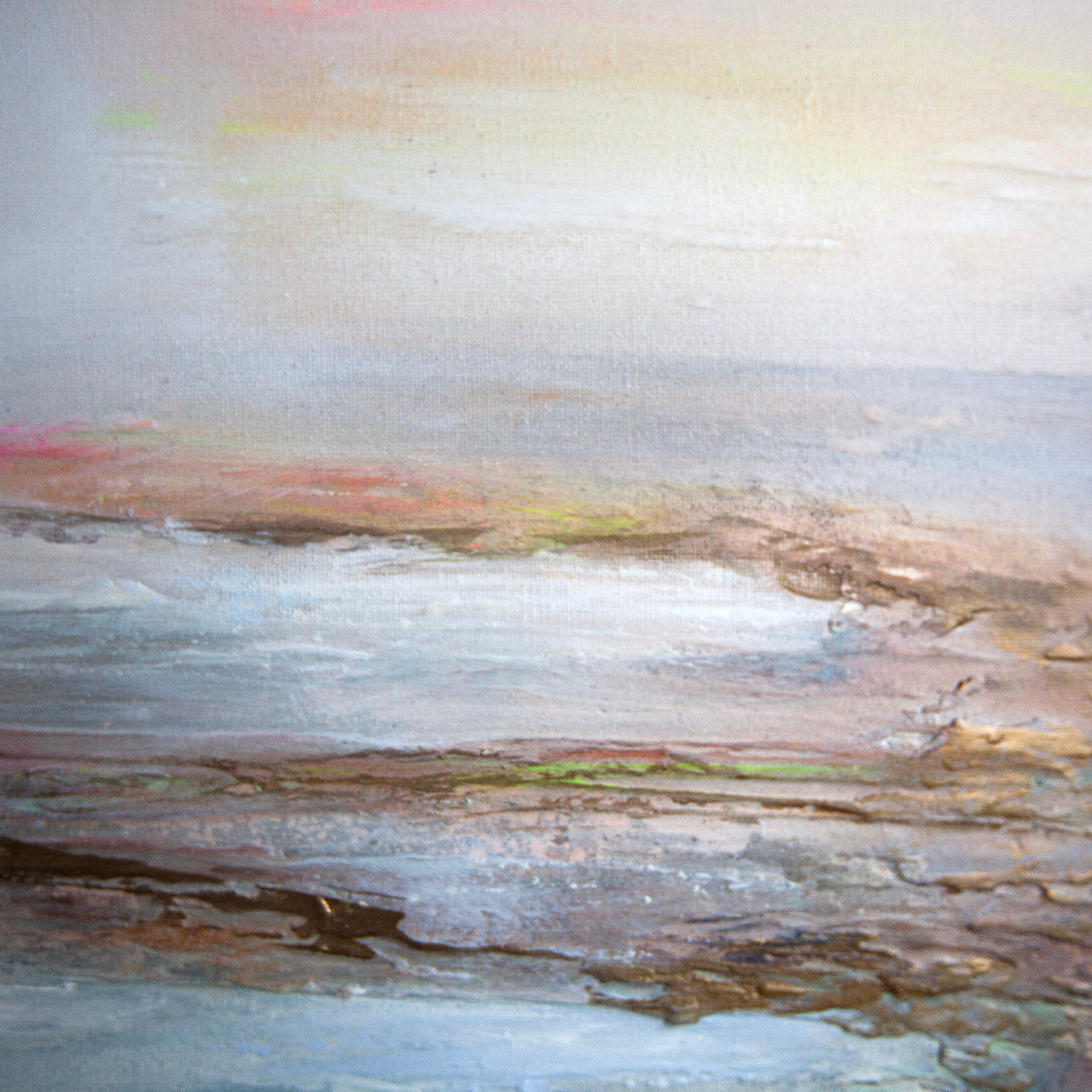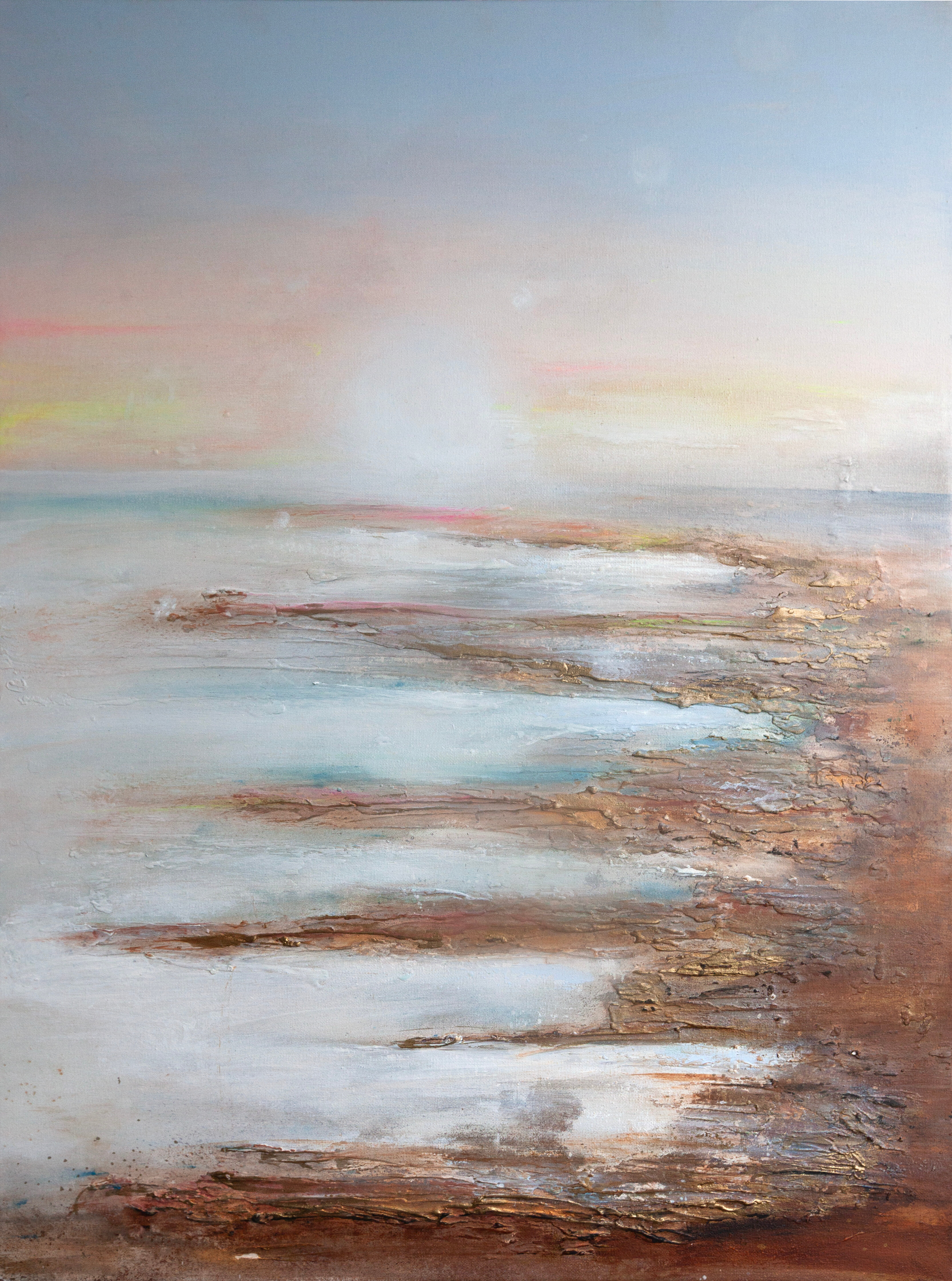Na granicy lądu i morza rozlewa się cisza. Pastelowe odcienie różu, błękitu i piasku stapiają się w miękką mgłę, którą co chwilę muska promień złotego światła. Woda oddycha powoli, niosąc ze sobą połyskujące refleksy, a horyzont zdaje się rozmywać w bezczasie. To pejzaż, w którym każdy kolor jest szeptem, a każdy błysk złota staje się obietnicą spokoju.