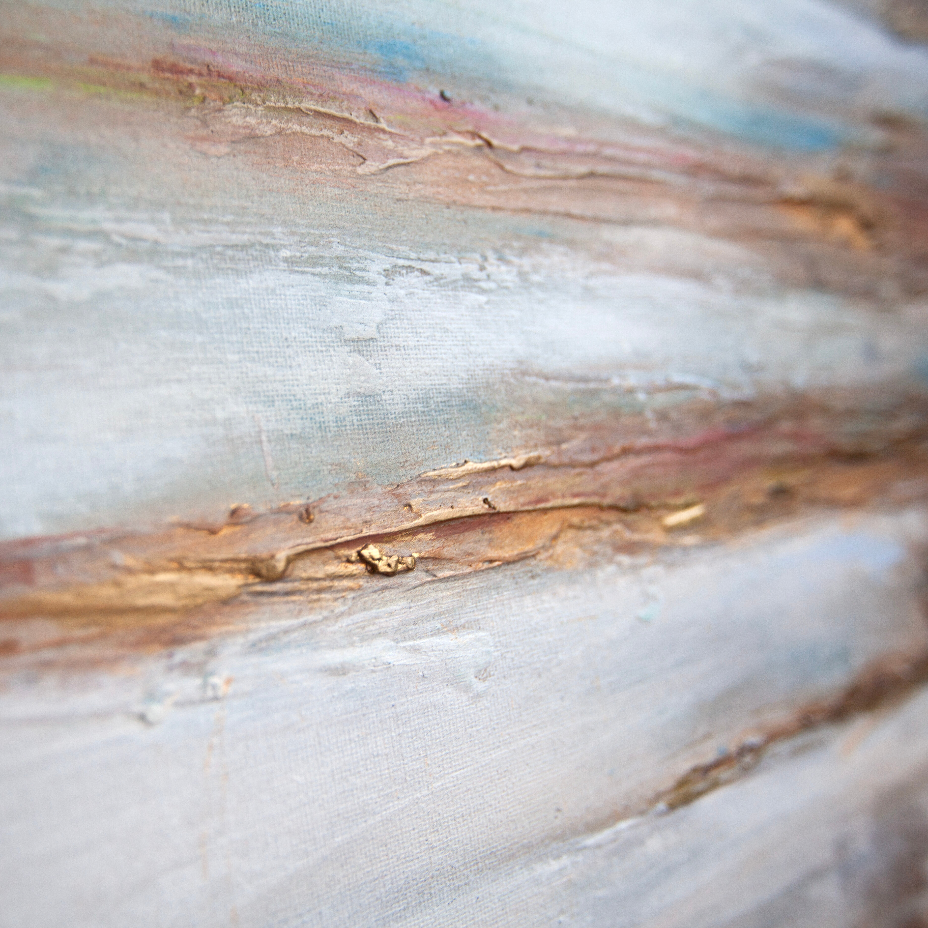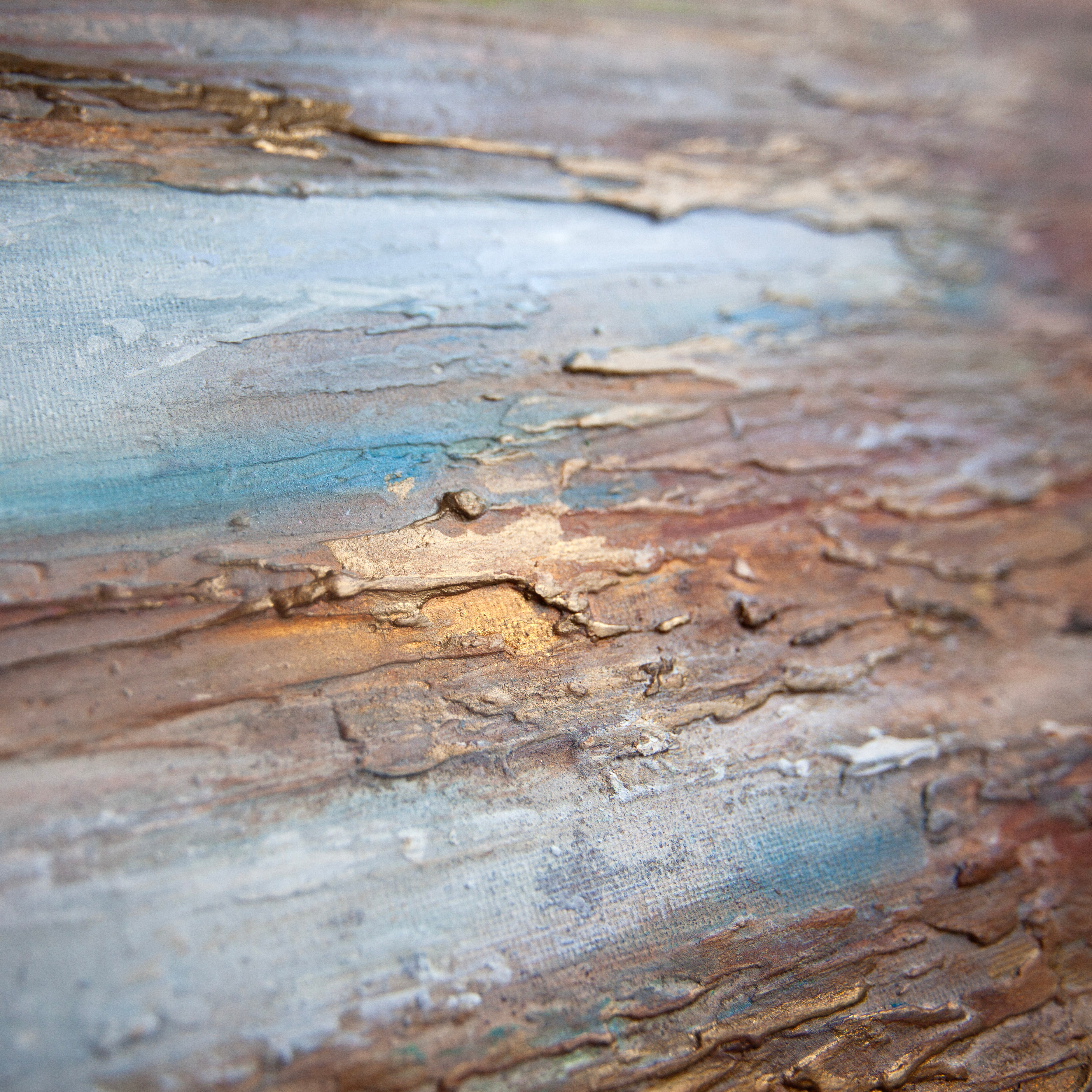 Obraz "Golden Shore" ma delikatną ale wyrazistą strukturę, która jest pokryta złotem, dzięki czemu pięknie odbija słońce i rozjaśnia wnętrze o każdej porze dnia.