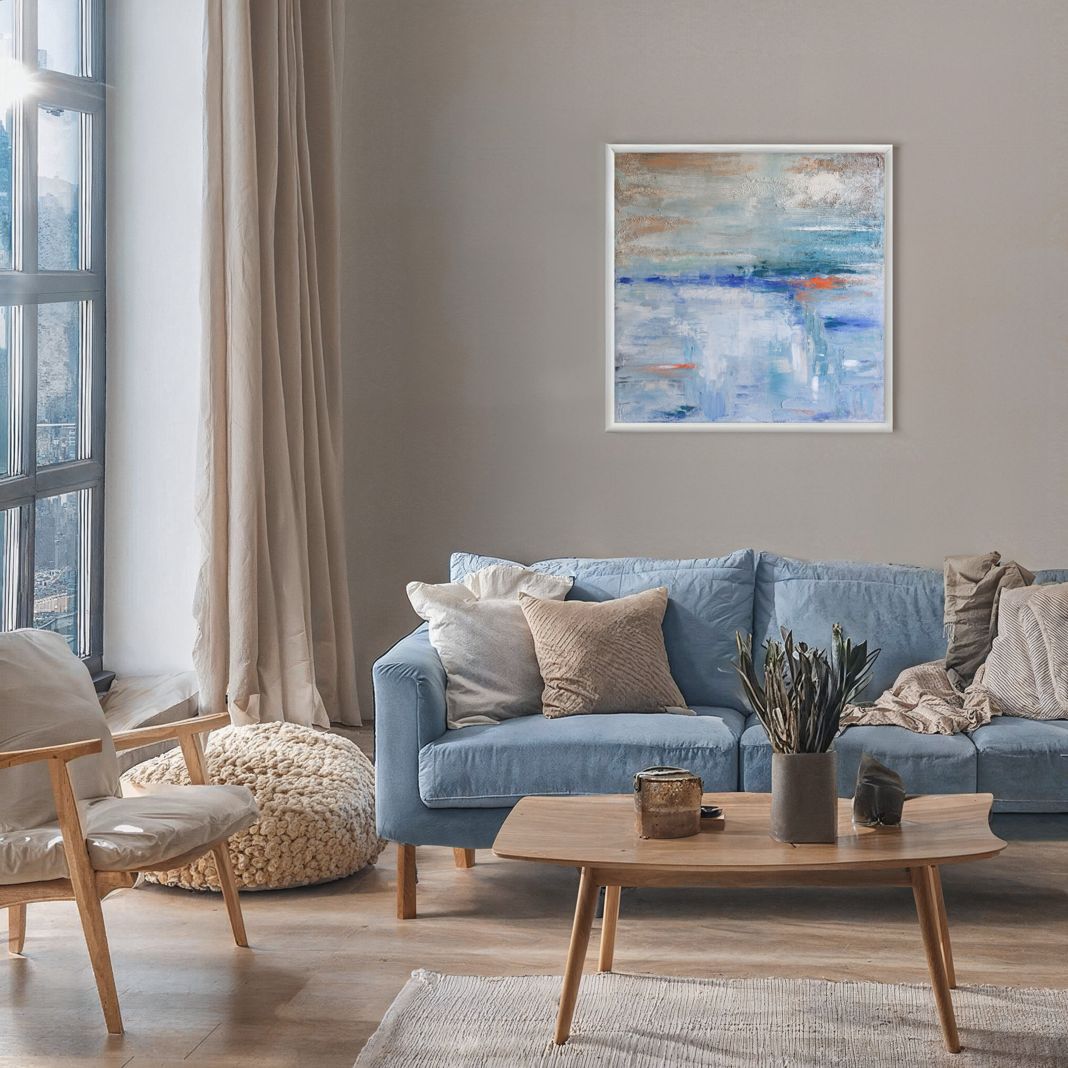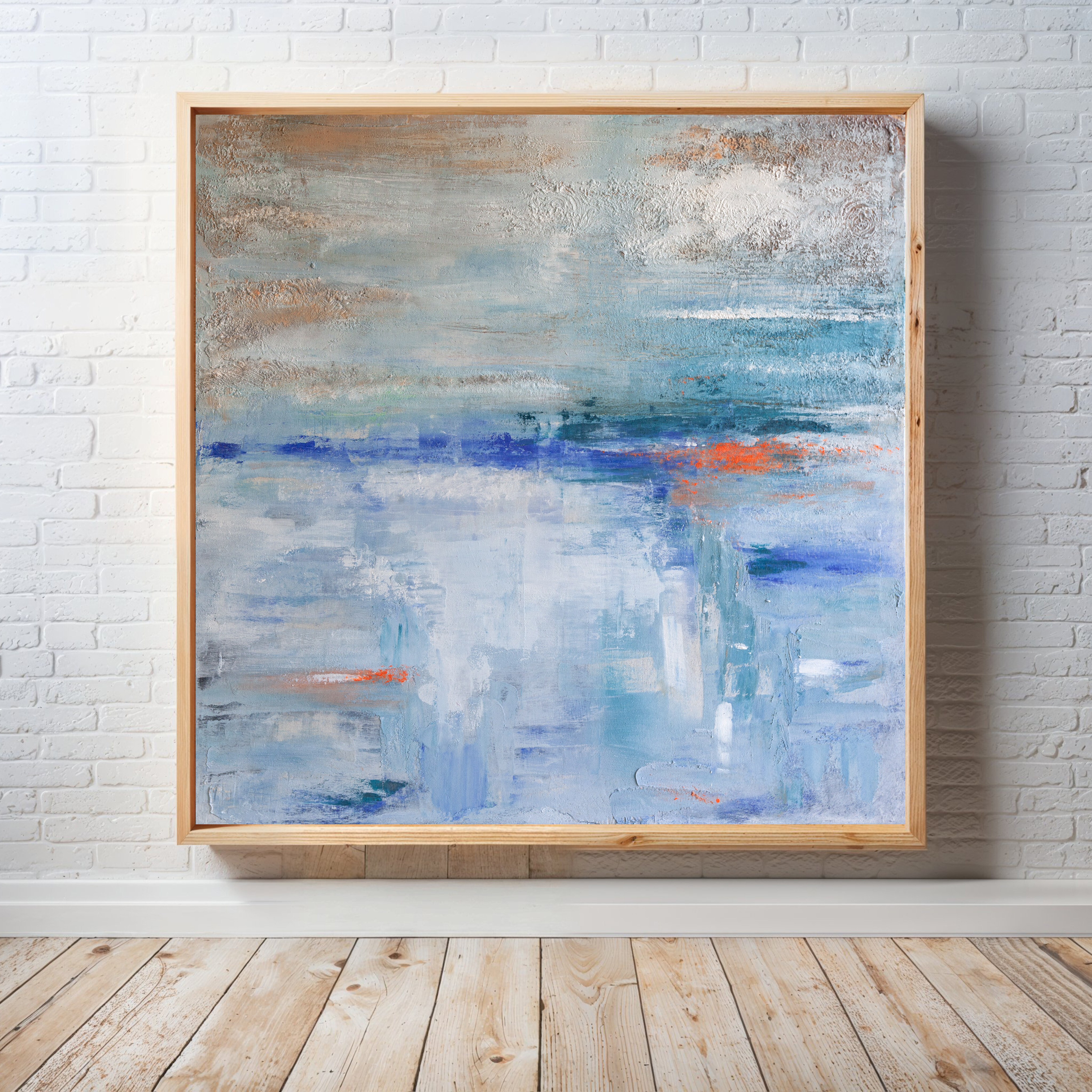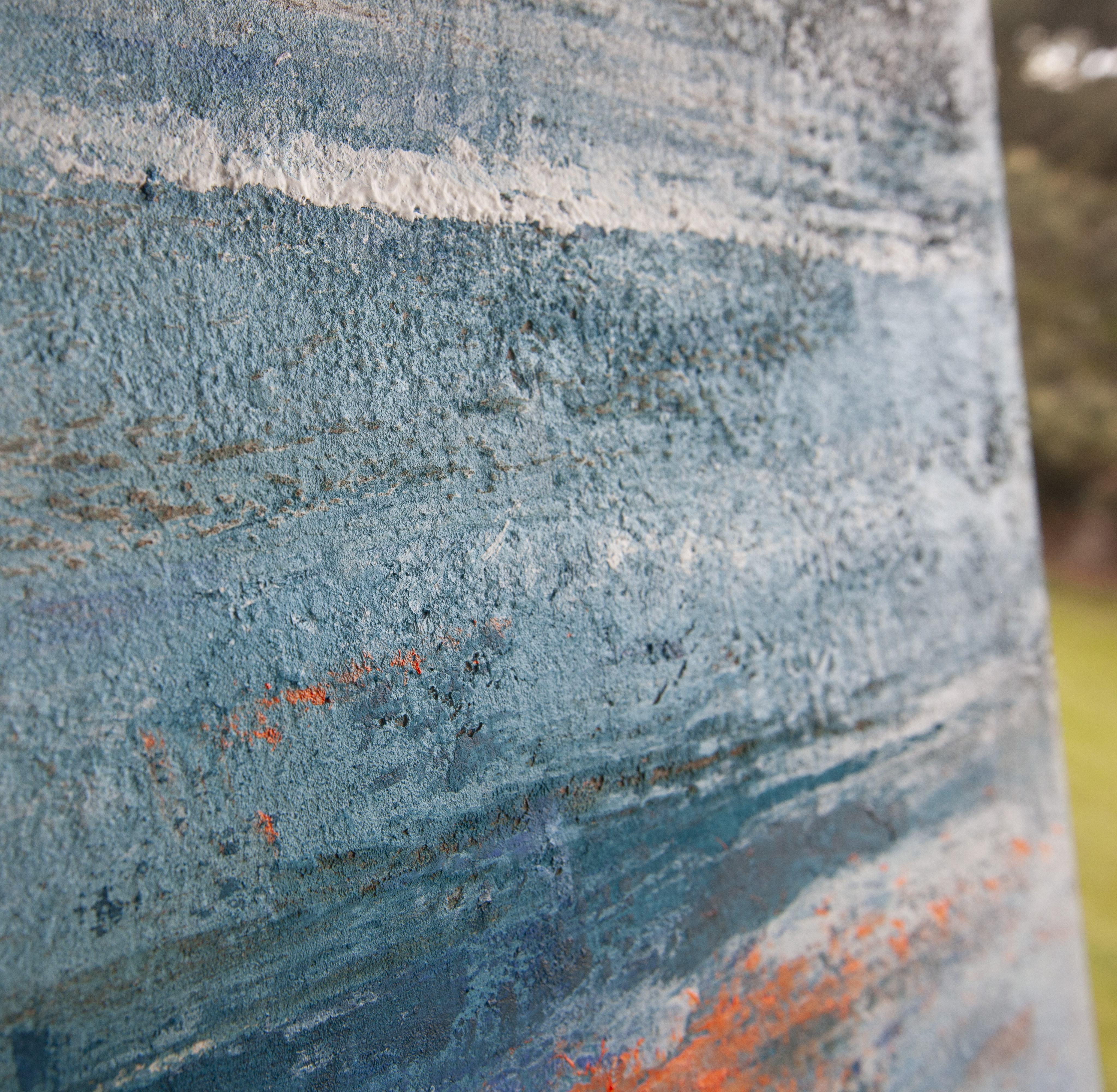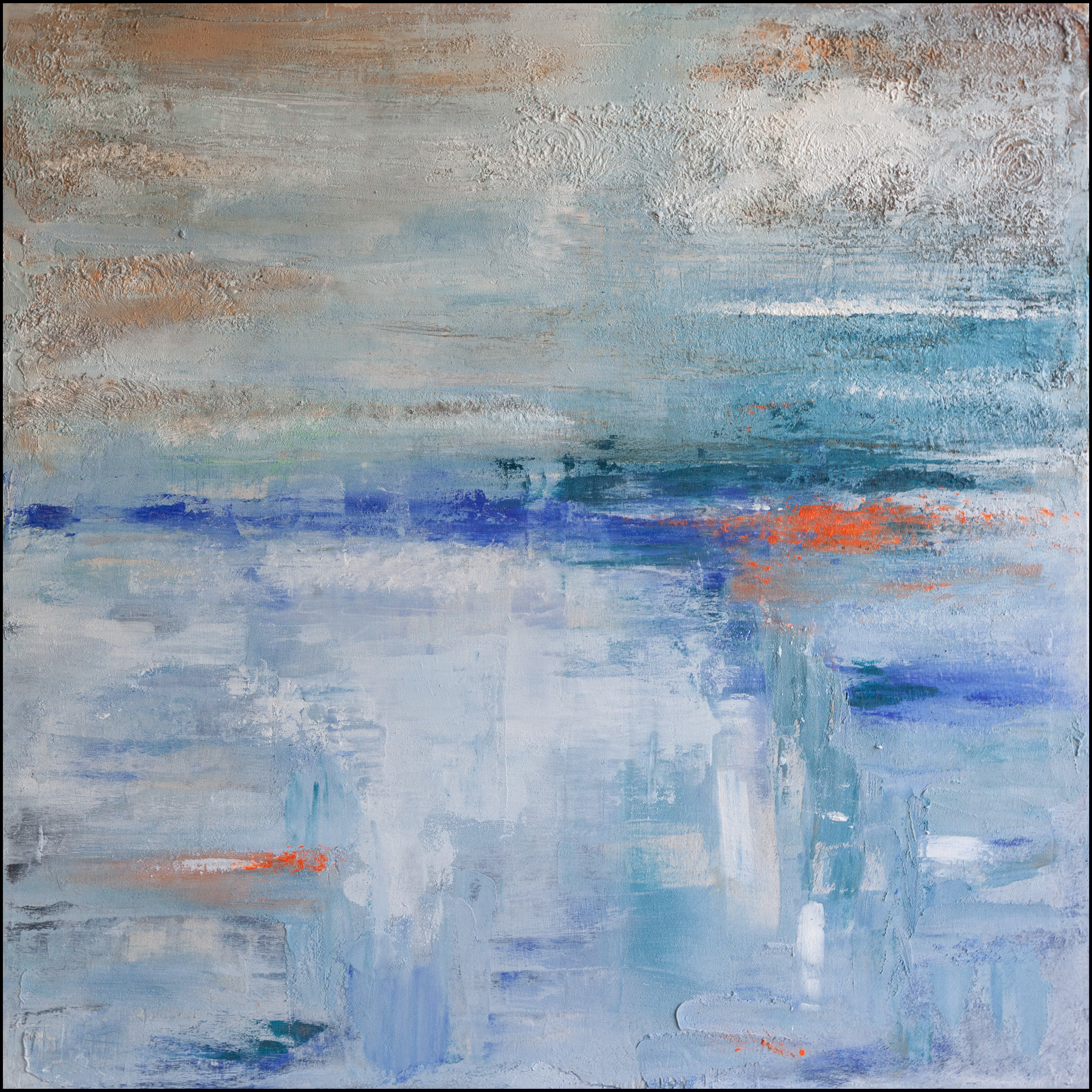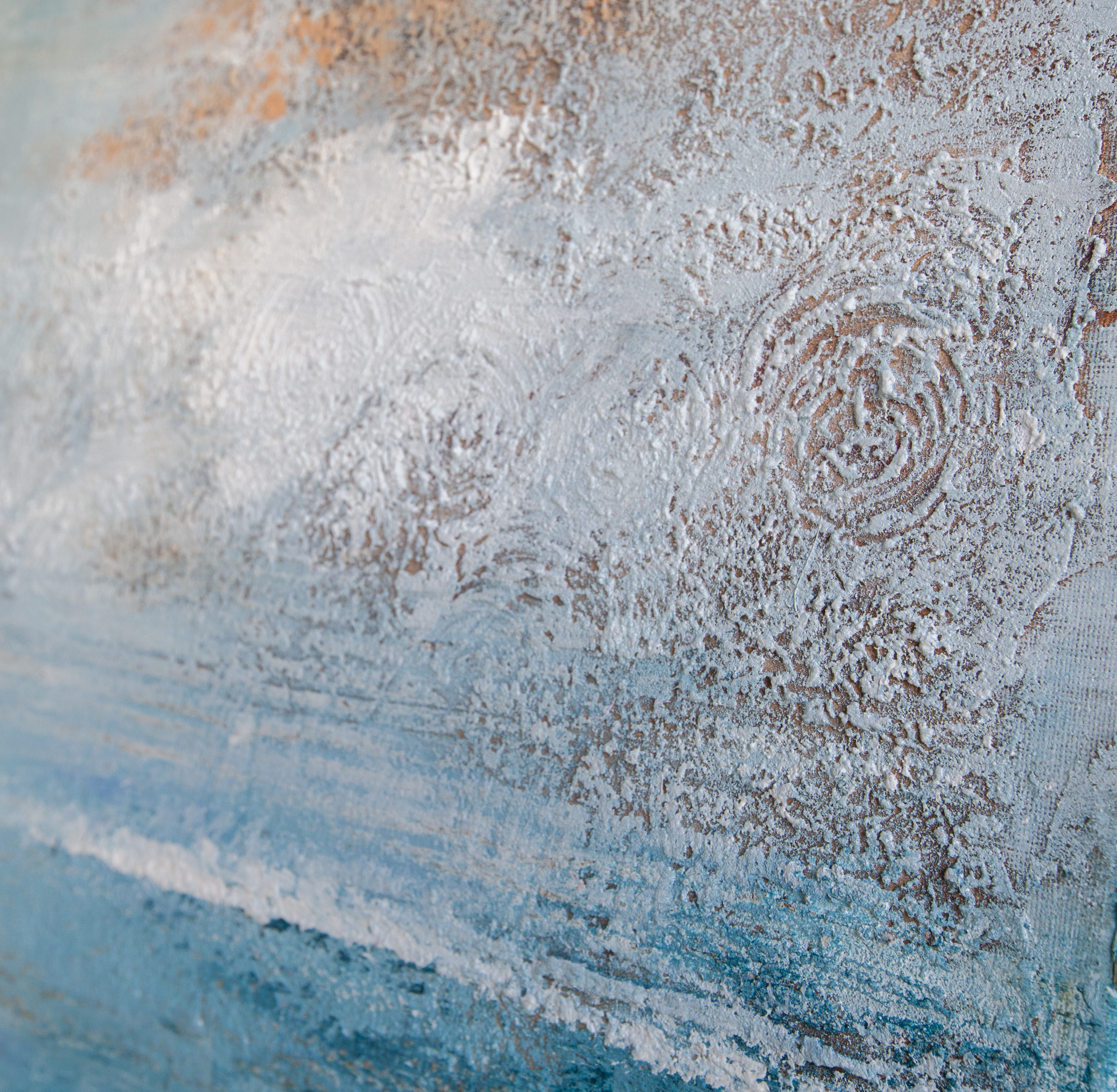 Abstrakcyjny obraz "Into the blue" jest odą do błekitu i złąmanej zieleni. Obraz jest utrzymany w zimnej, stonowanej kolorystyce która jest ocieplona neonowym pomarańczem. Kolory przeplatają się ze sobą, uzupełniają, przechodzą i nachodzą tworząc idealną kompozycję. Jednym może to przypominać odległy lodowiec, innym mokrą szybą o świcie.