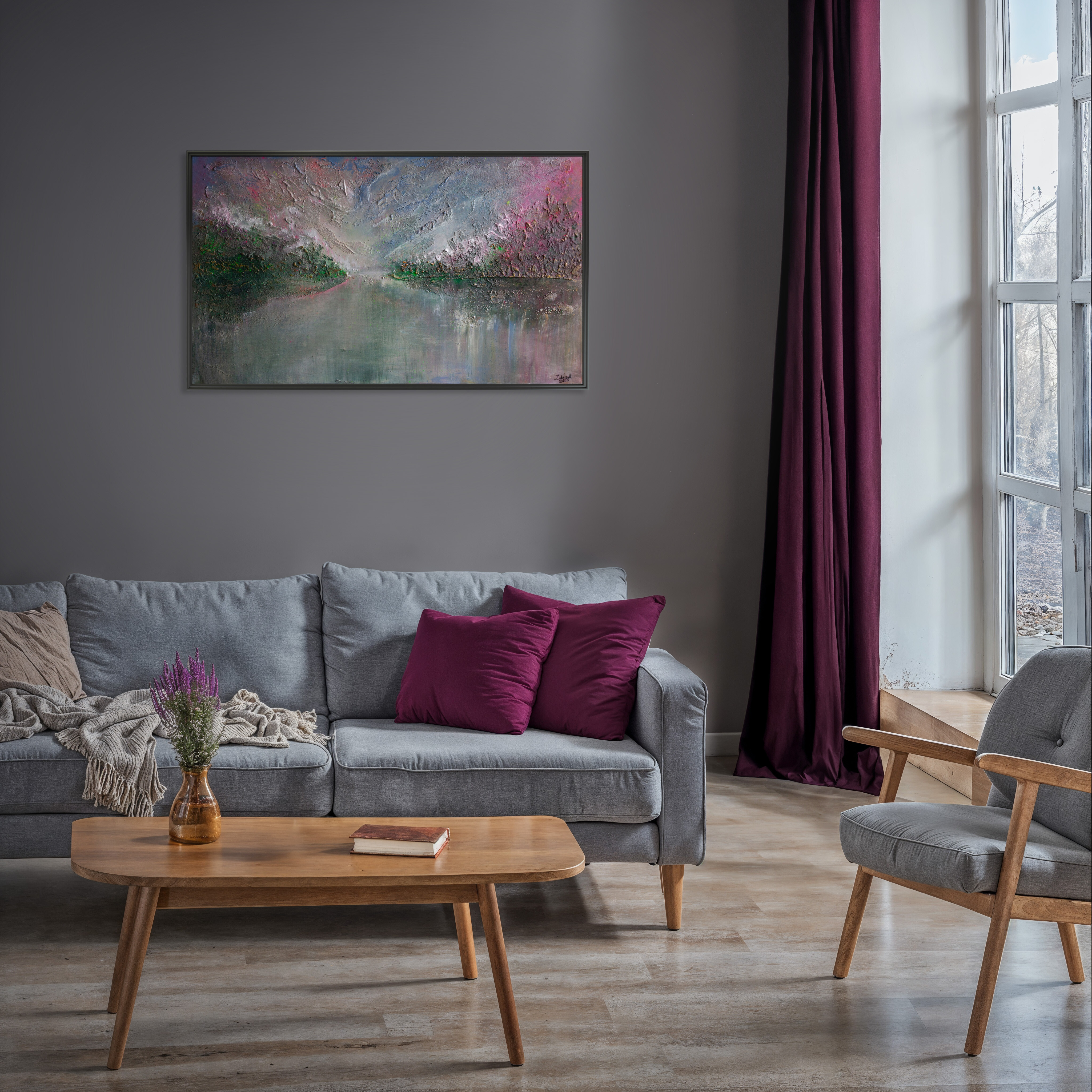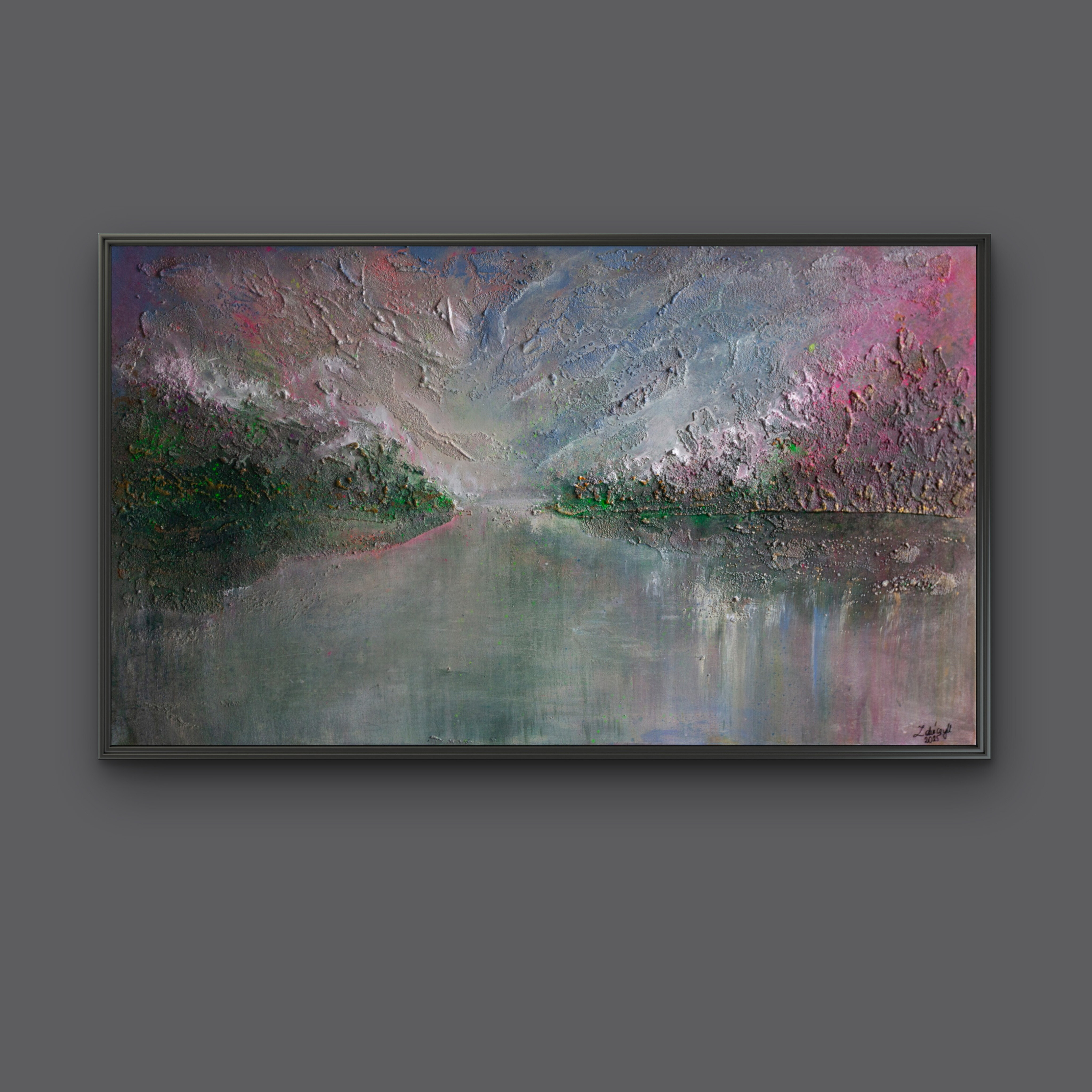 Midnight Summer to abstrakcyjny pejzaż ukazujący tajemniczy, nocny krajobraz z jeziorem, utrzymany w poetyckiej palecie błękitów, zieleni i subtelnych odcieni różu. Kompozycja obrazu zdaje się pulsować spokojem letniej nocy jezioro, choć nie przedstawione realistycznie, emanuje ciszą i delikatnym światłem odbijającym się od jego powierzchni. Przenikające się plamy koloru tworzą wrażenie głębi i ulotnego ruchu, sugerując obecność wiatru, roślin lub odbić księżycowych. Błękity symbolizują chłód nocy i spokój wody, zielenie przywołują naturę otaczającą jezioro, a róż dodaje zmysłowej miękkości — niczym świetlista mgła lub wspomnienie letniego zmierzchu. Obraz balansuje między snem a rzeczywistością, pozostawiając przestrzeń dla emocji i interpretacji widza