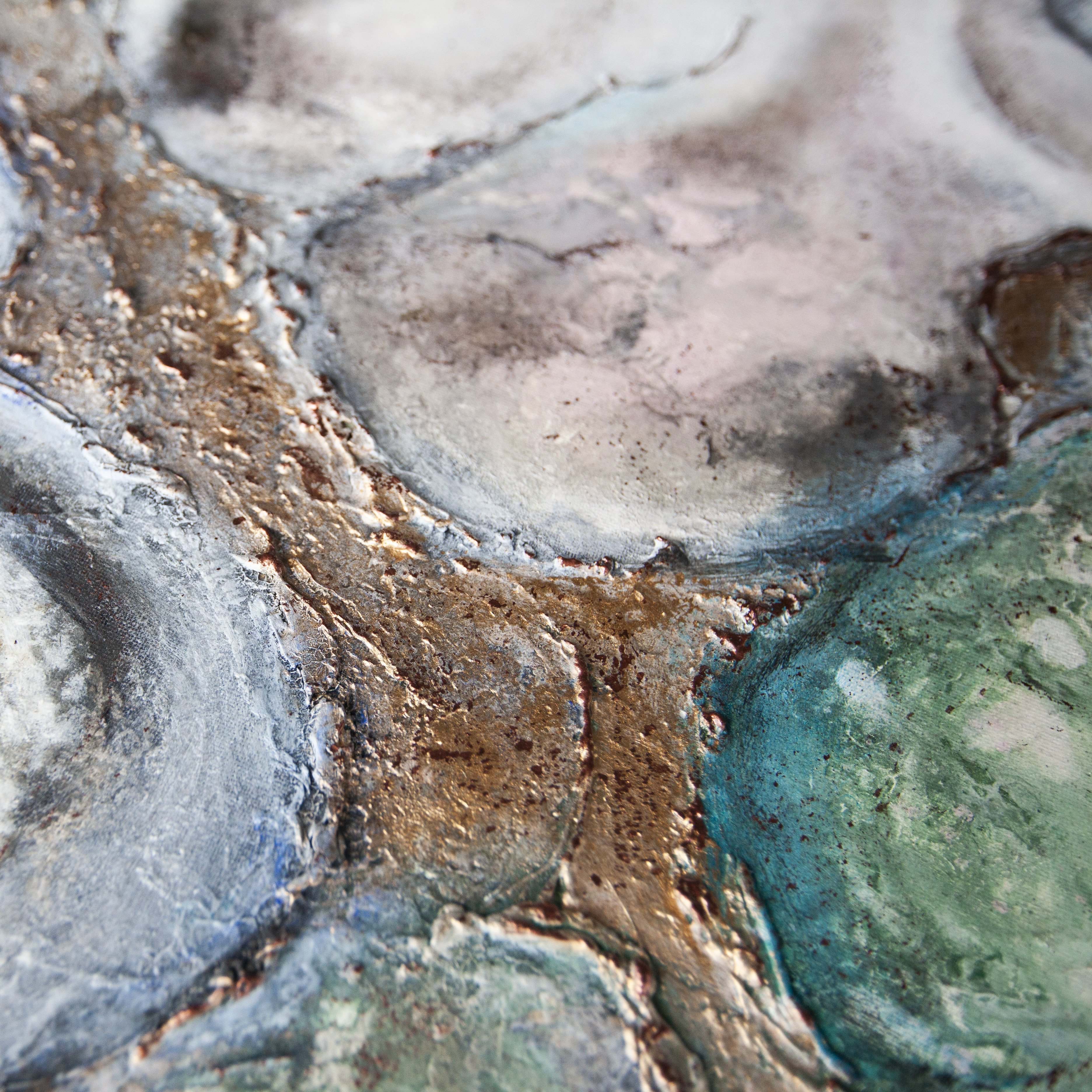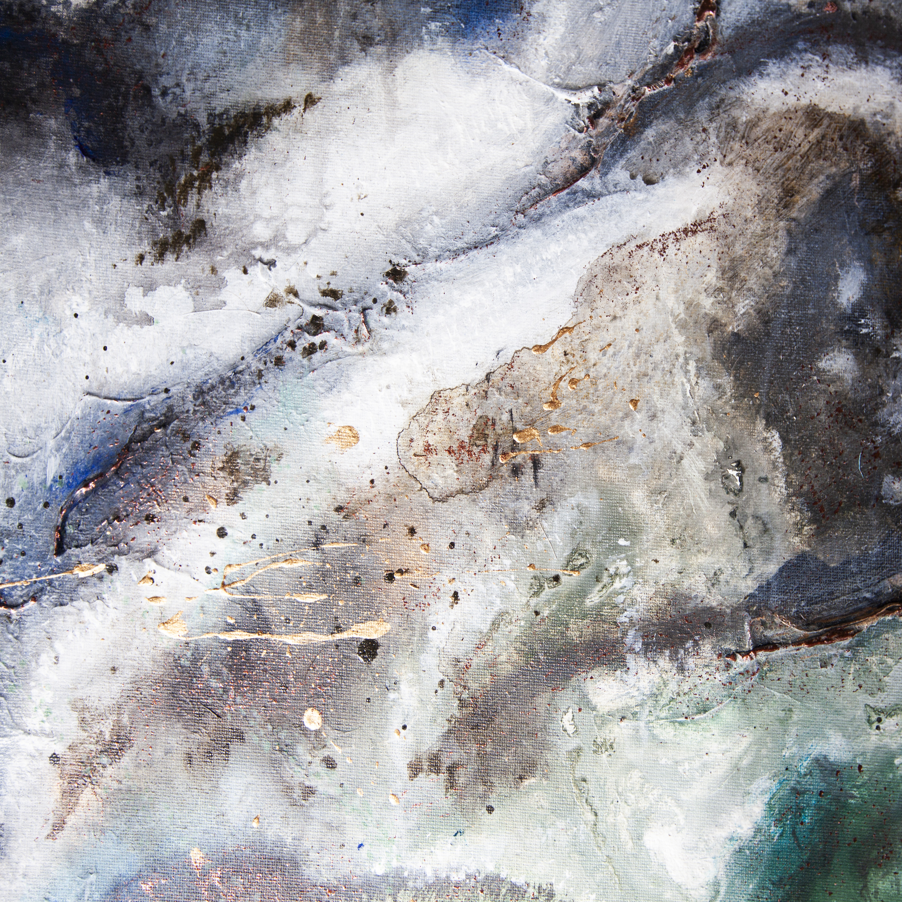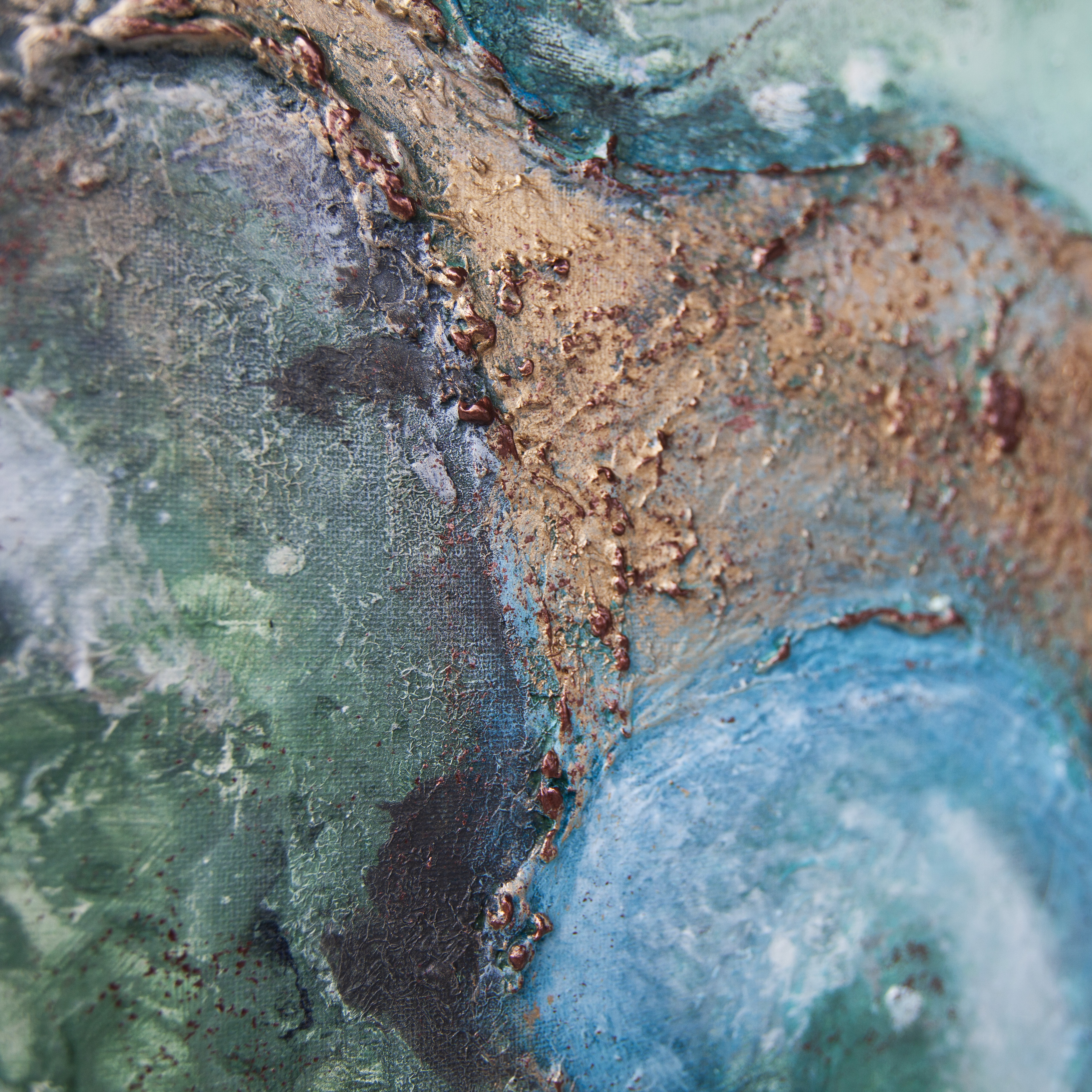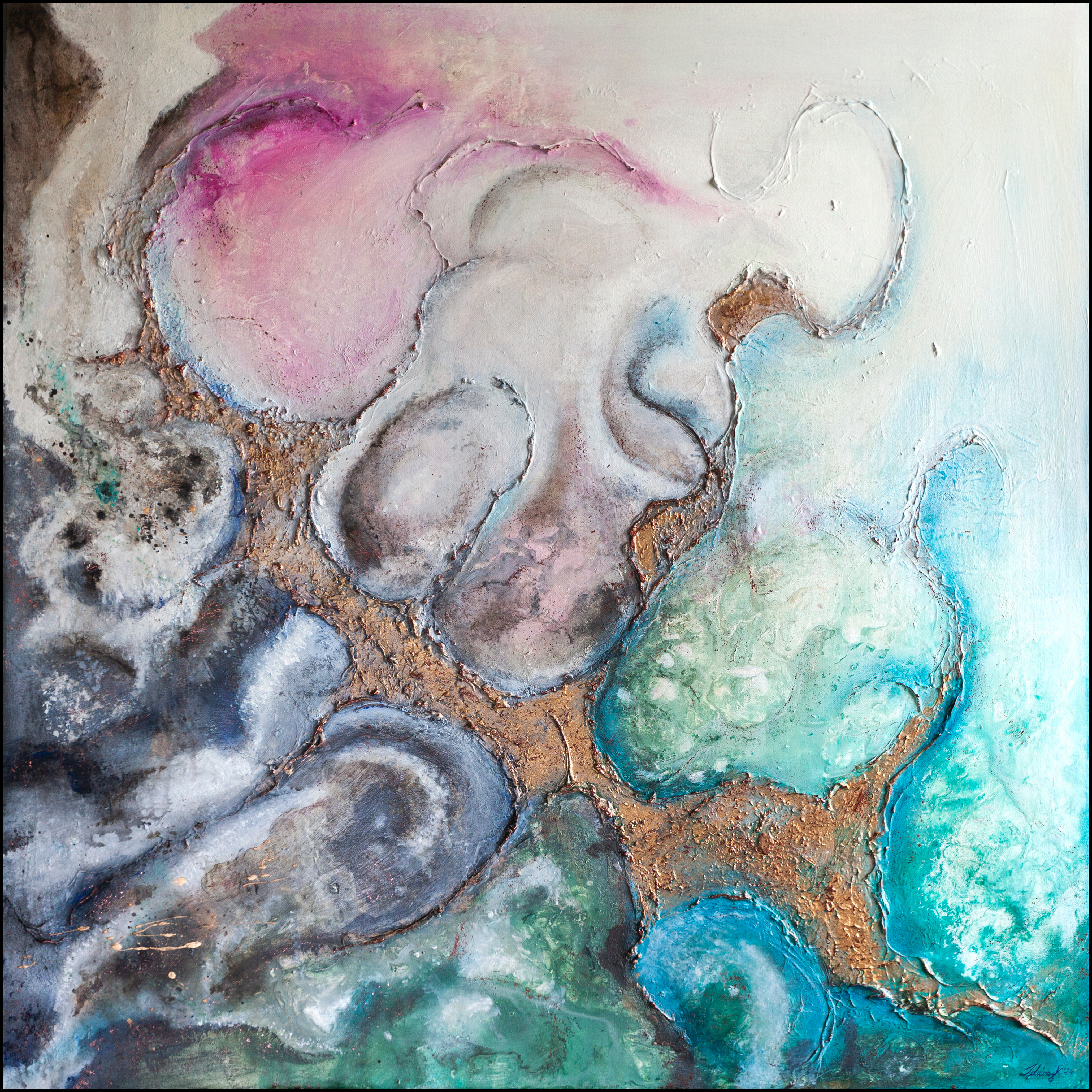 Abstrakcyjny obraz wykonany techniką mieszaną - akryl. olej i struktura z elementami wylanego złota i miedzi. Farby wylewane metodą pouringu. Obraz zawersniksowany z zamalowanymi w tonacji obrazu bokami.