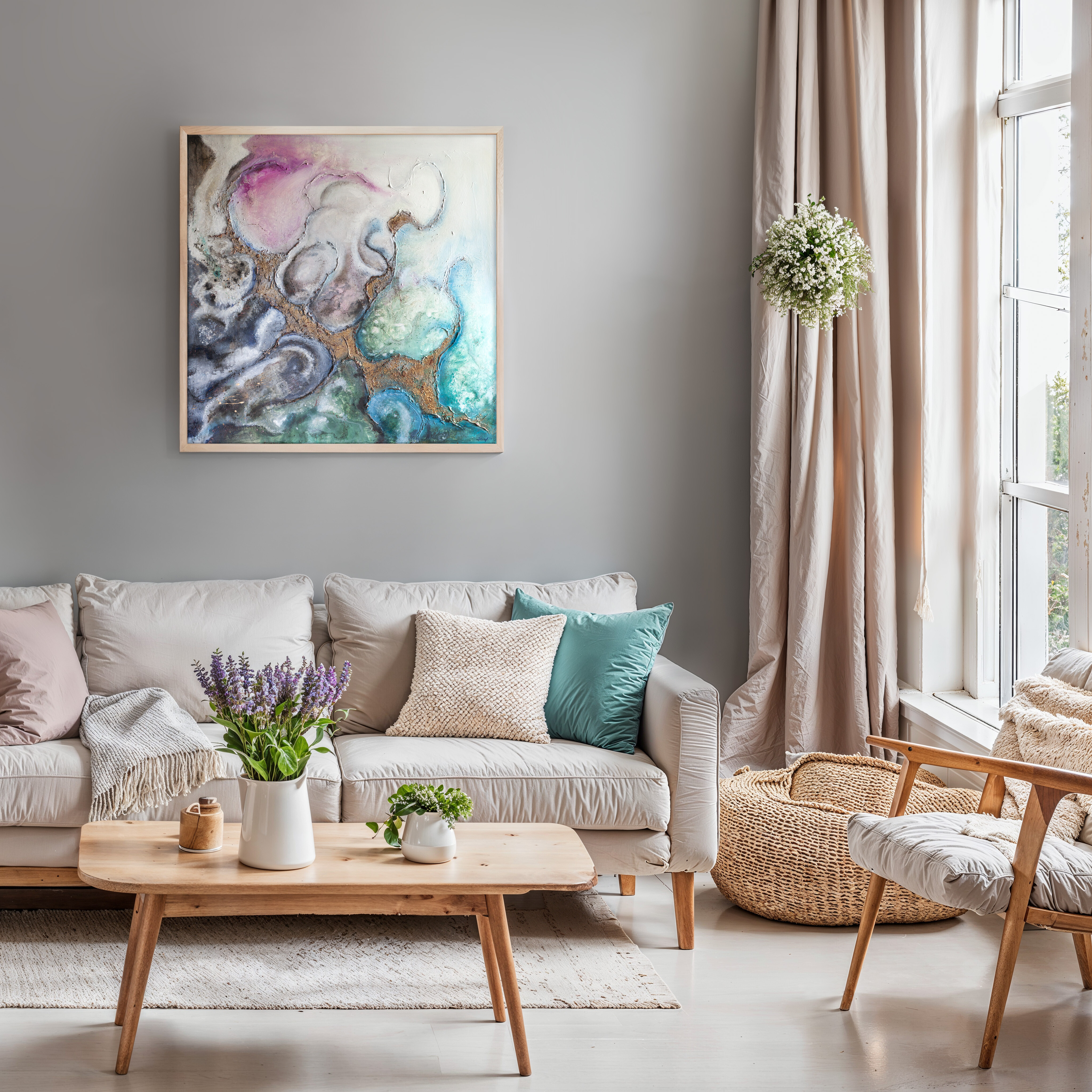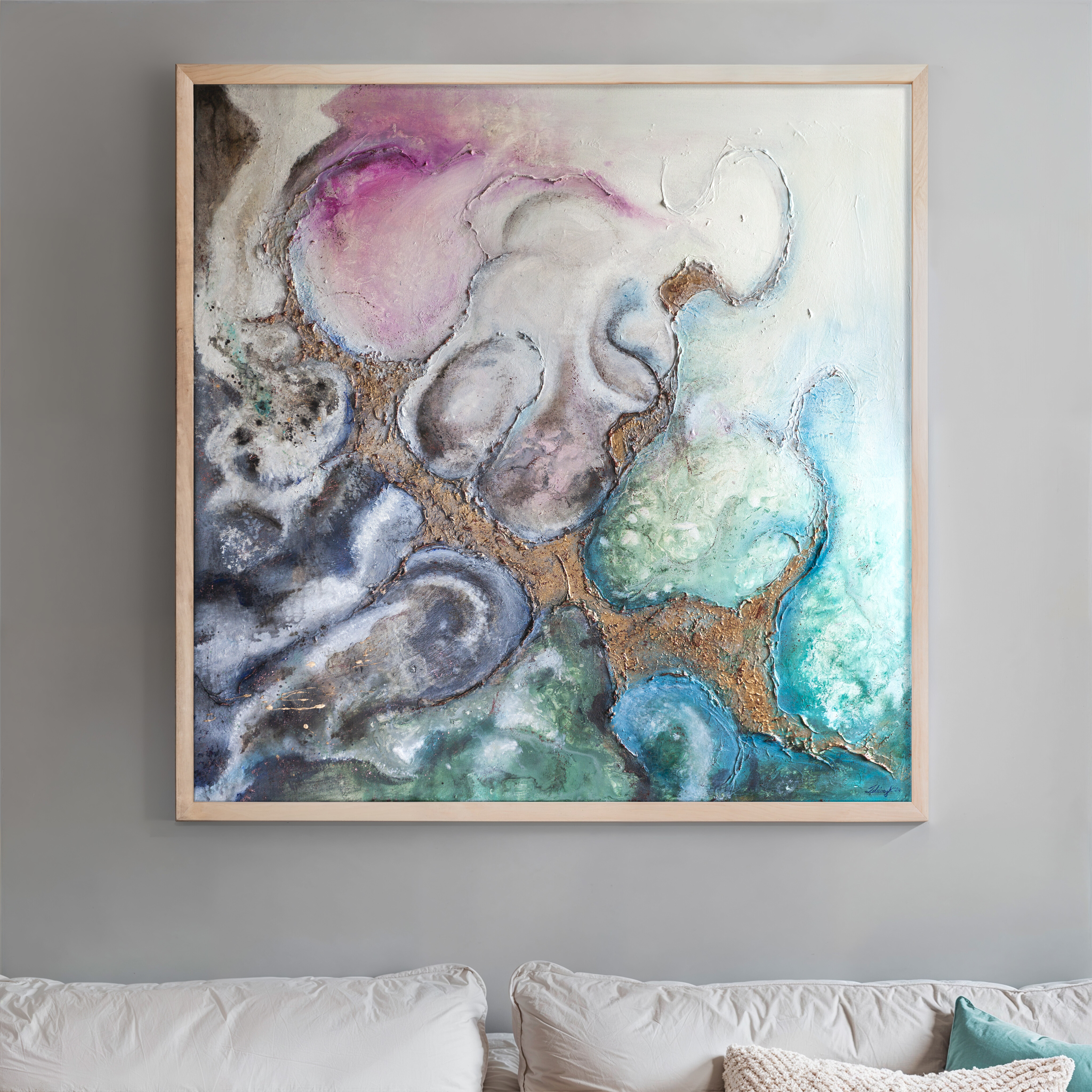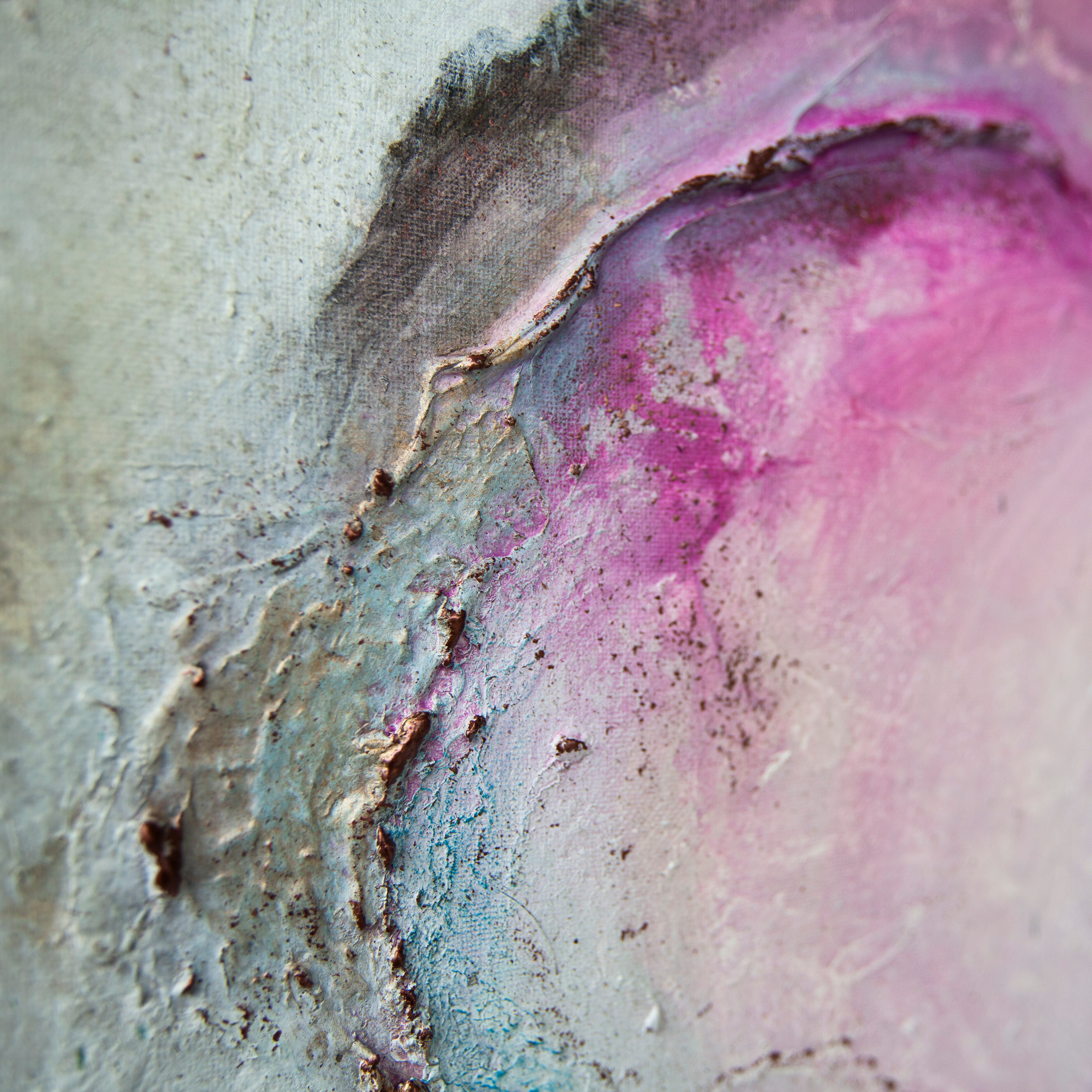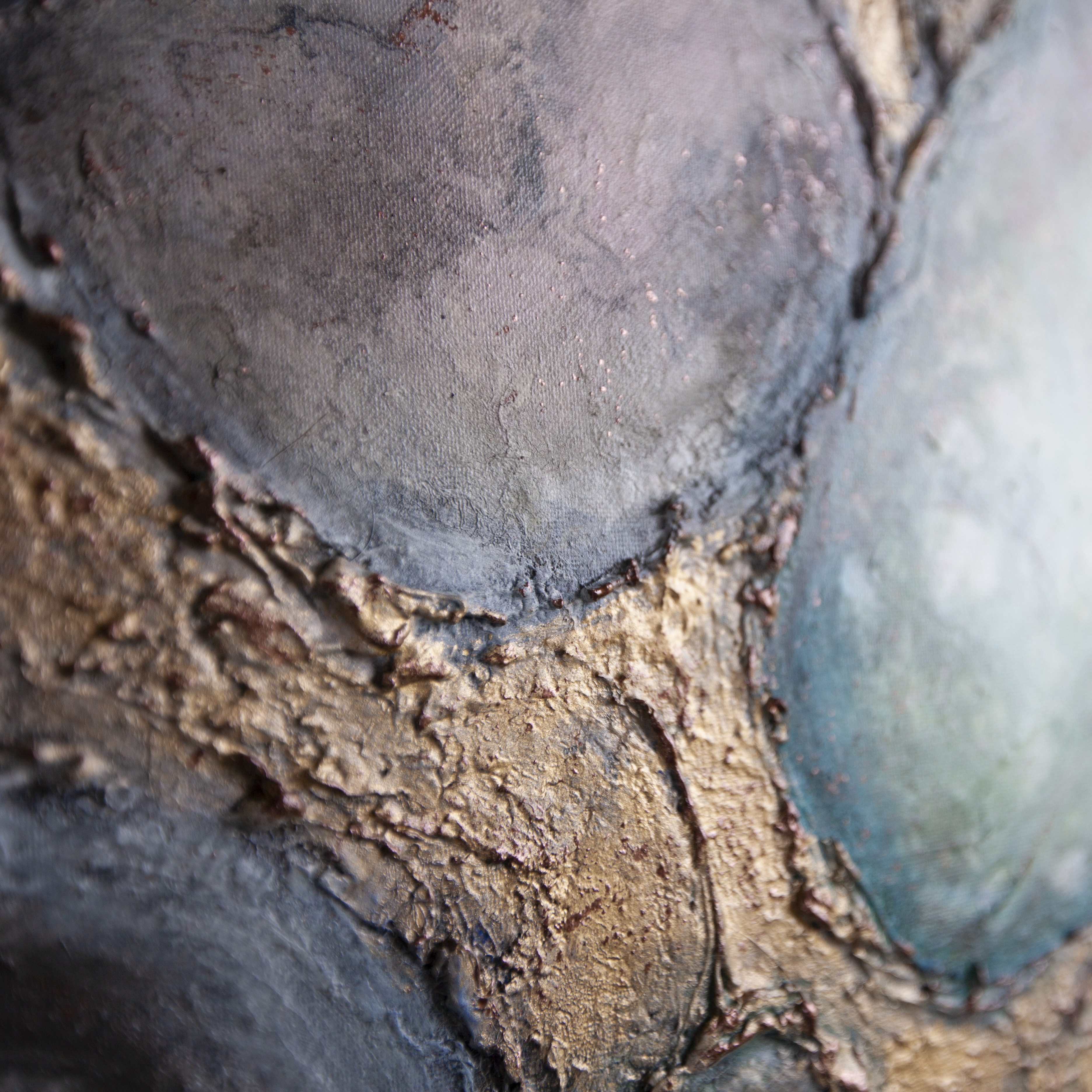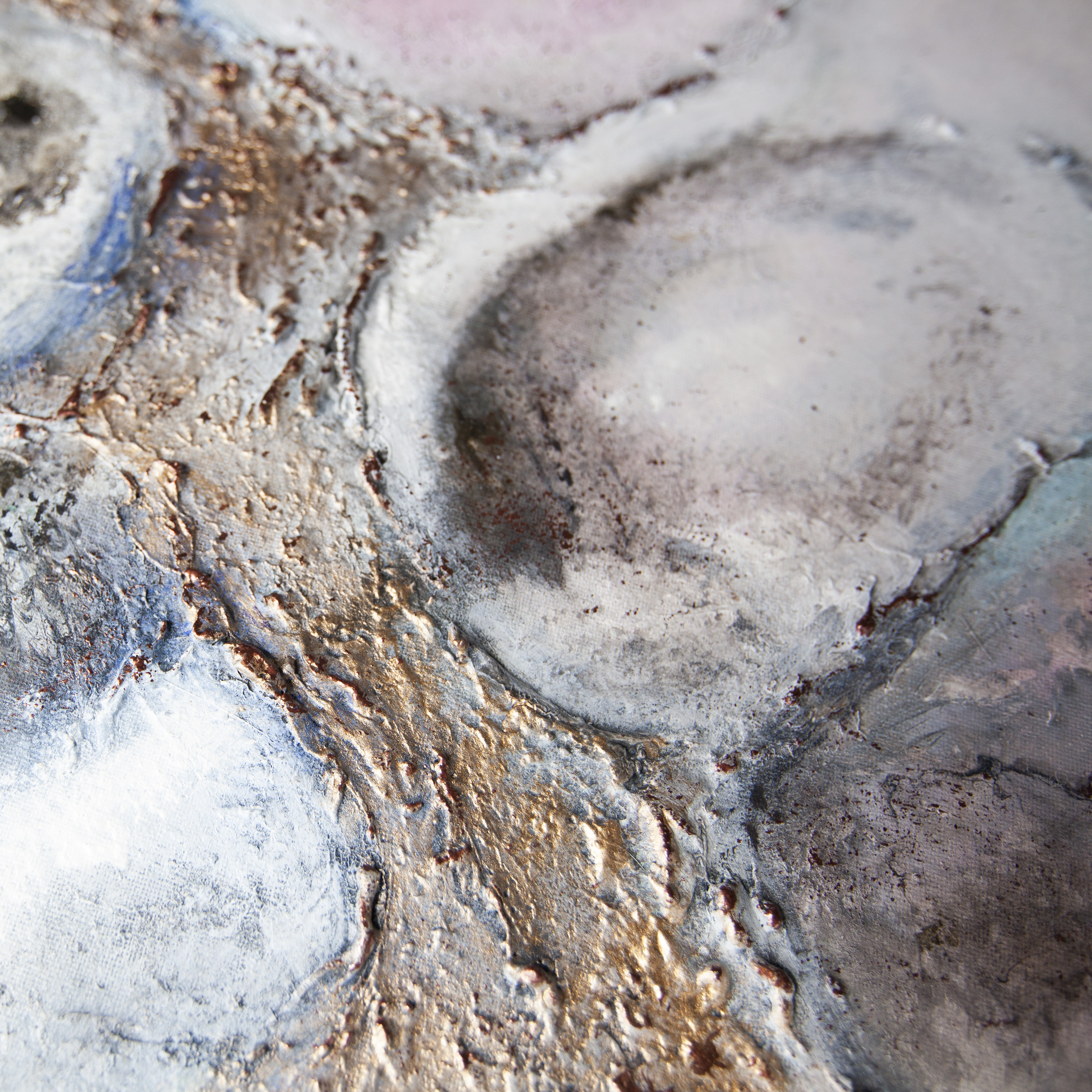Abstrakcyjny obraz wykonany techniką mieszaną - akryl. olej i struktura z elementami wylanego złota i miedzi. Farby wylewane metodą pouringu. Obraz zawersniksowany z zamalowanymi w tonacji obrazu bokami.