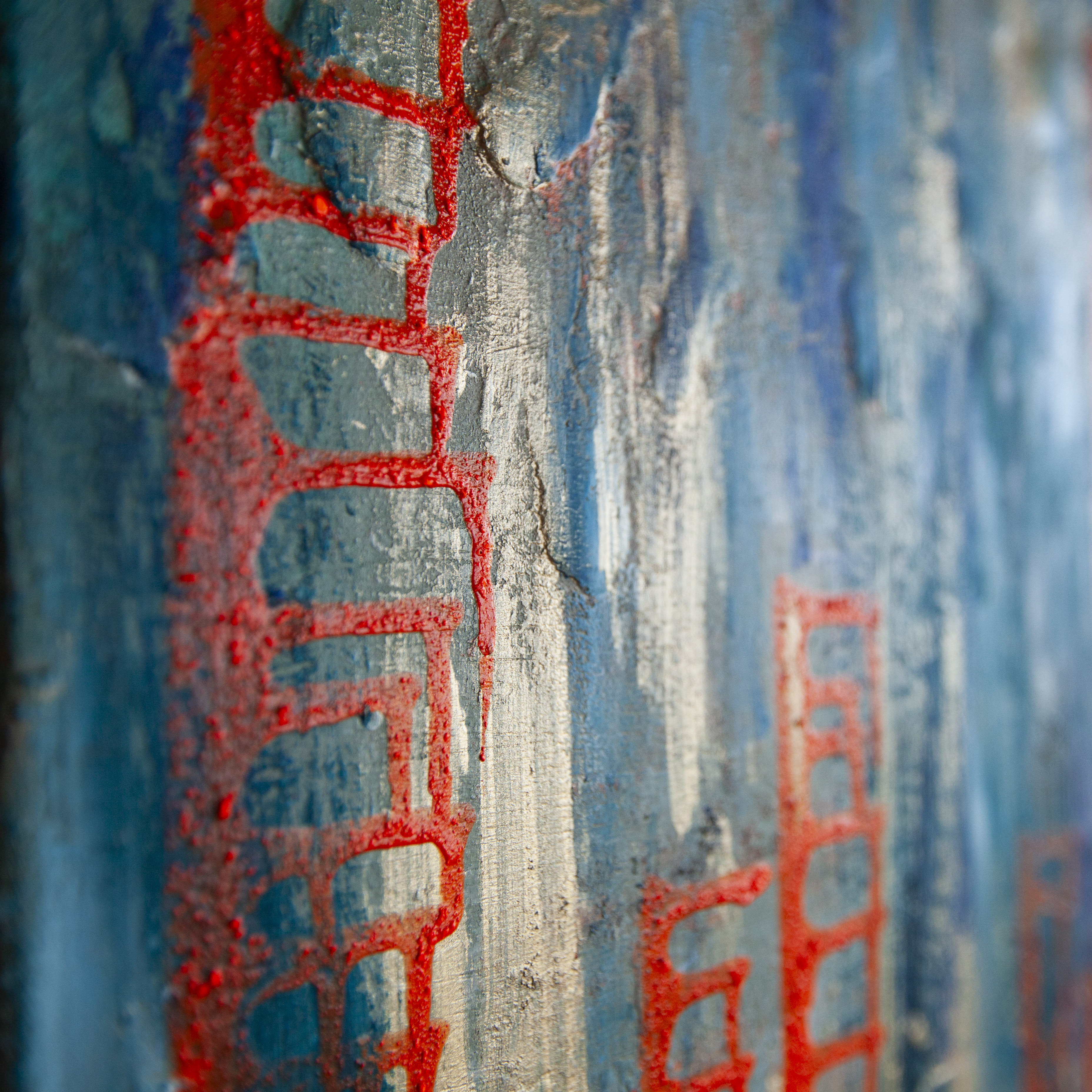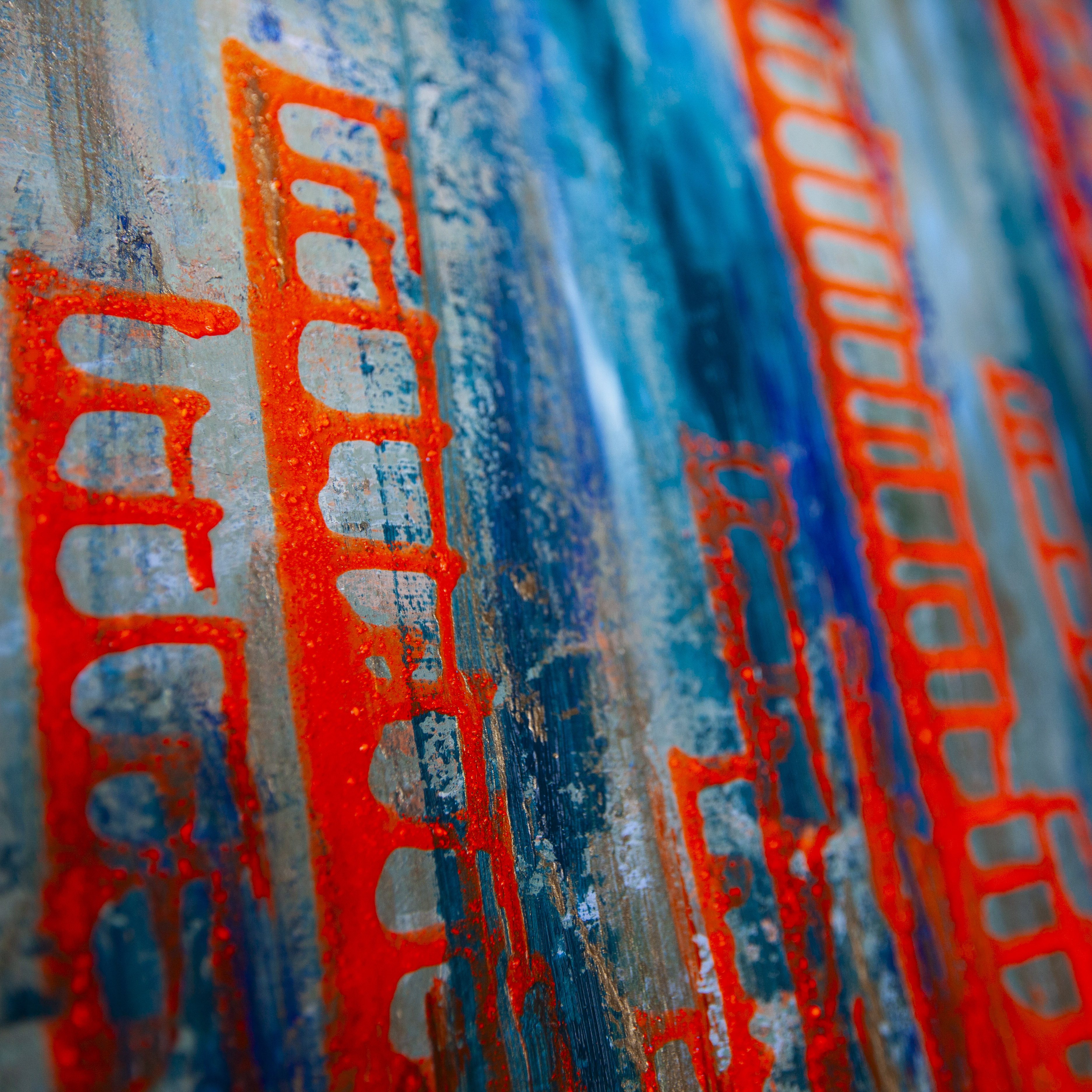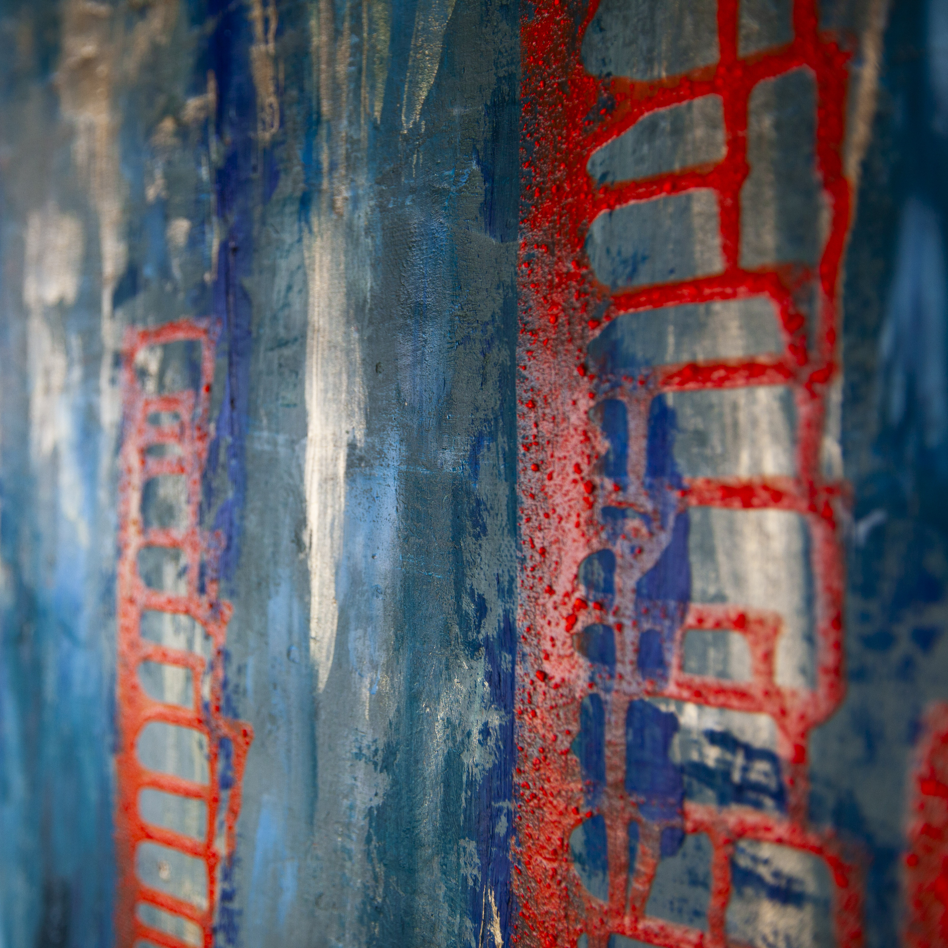Abstrakcyjny obraz wykonany techniką mixed media - olej, akryl i struktura. Obraz jest pokryty werniksem, boki zamalowane.