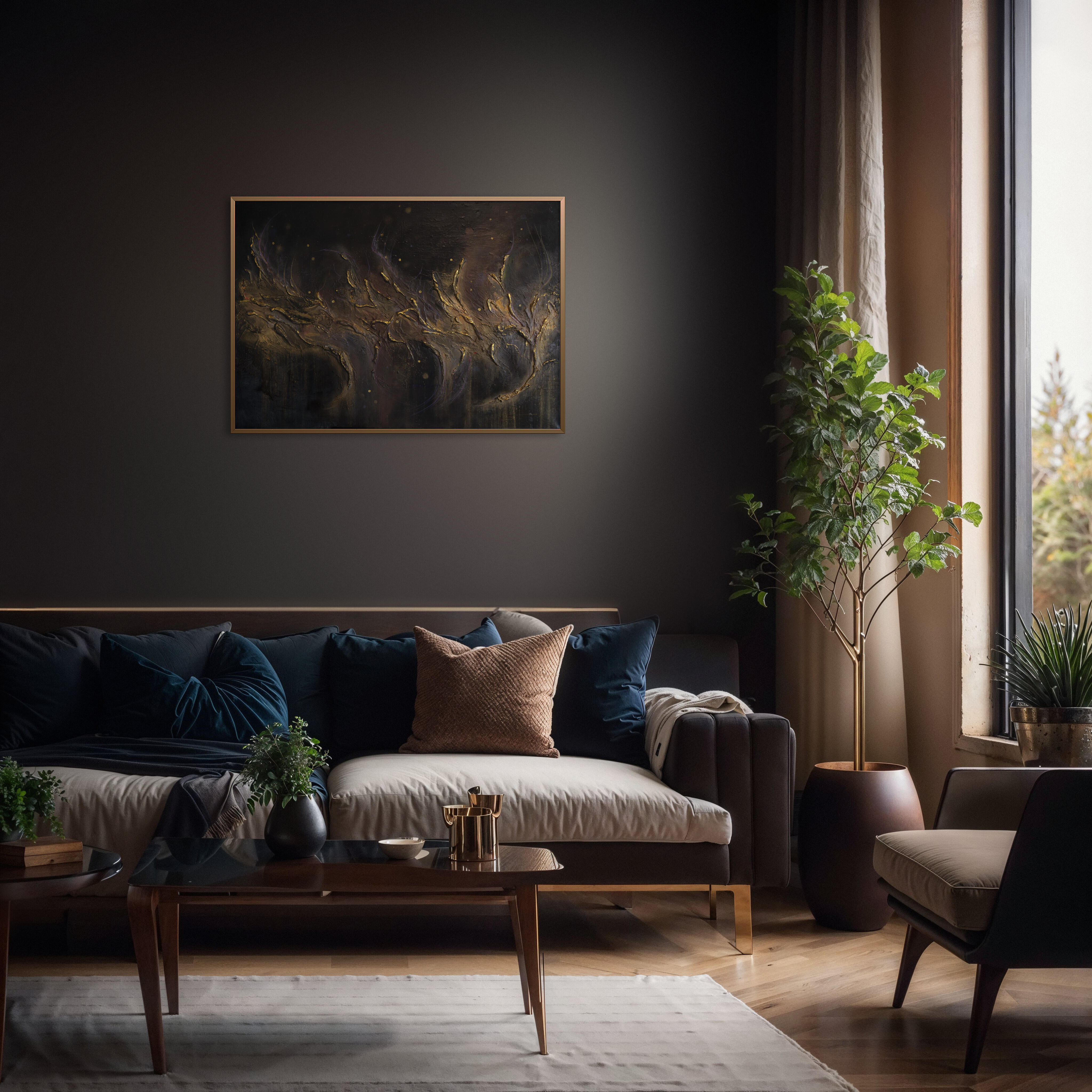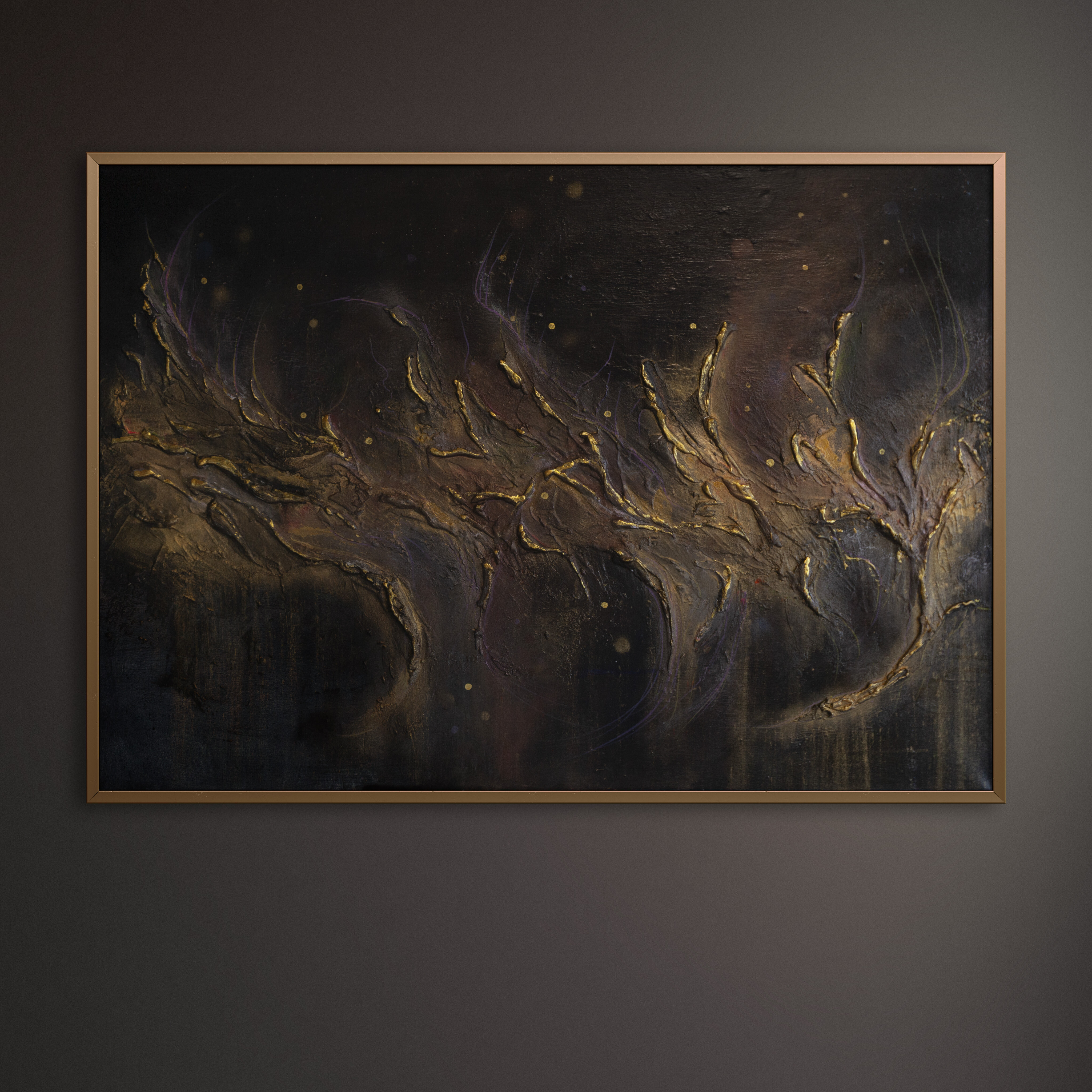 Obraz utrzymany jest w ciemnej, głębokiej tonacji czerni, stanowiącej tło i przestrzeń, z której wyłaniają się świetliste akcenty. Gęsta faktura i wyczuwalna struktura powierzchni budują wrażenie ruchu oraz przemiany. Pośród ciemności rozsypany jest złoty pył, drobne refleksy farby metalicznej tworzą efekt migotania, niczym drobiny światła zawieszone w nocy.