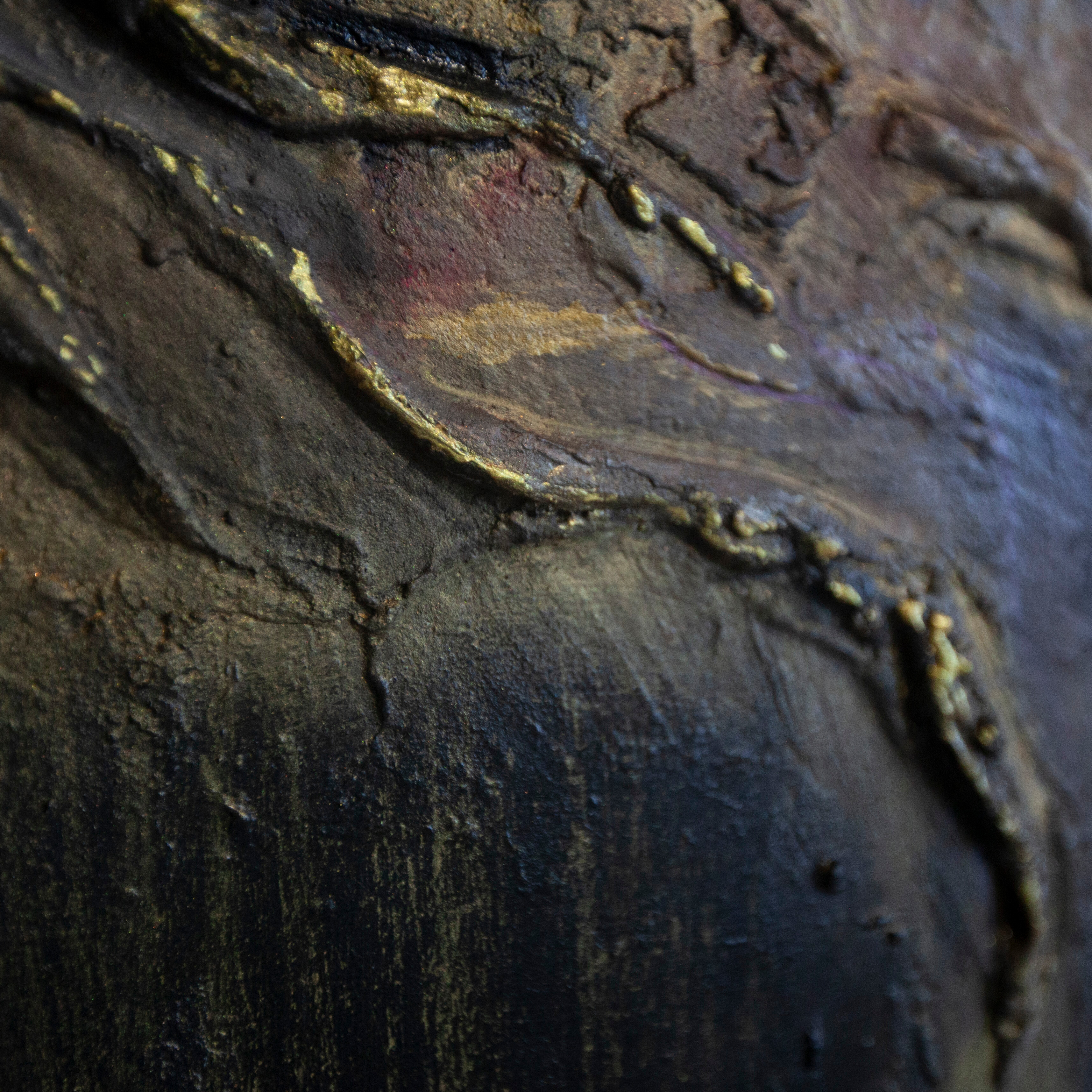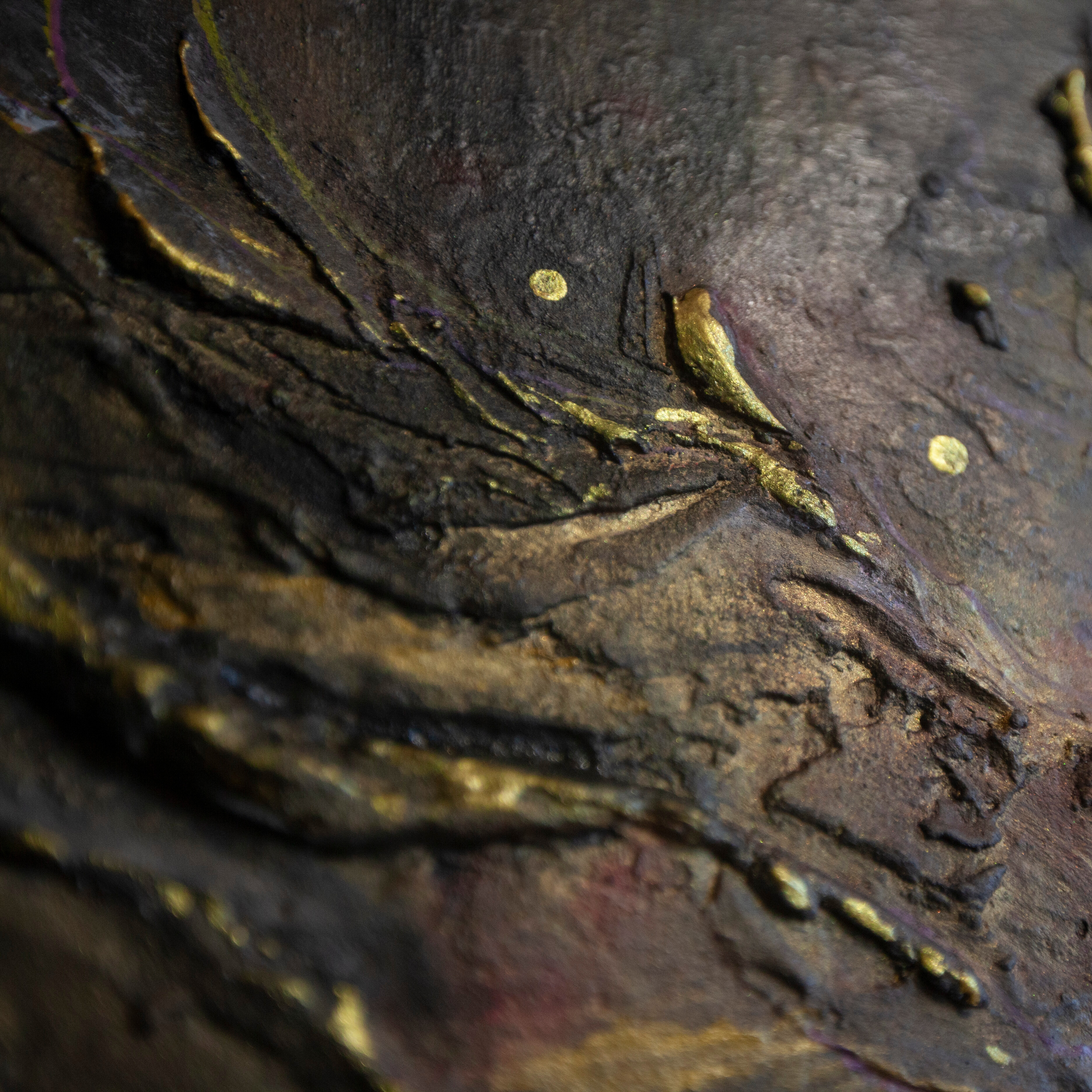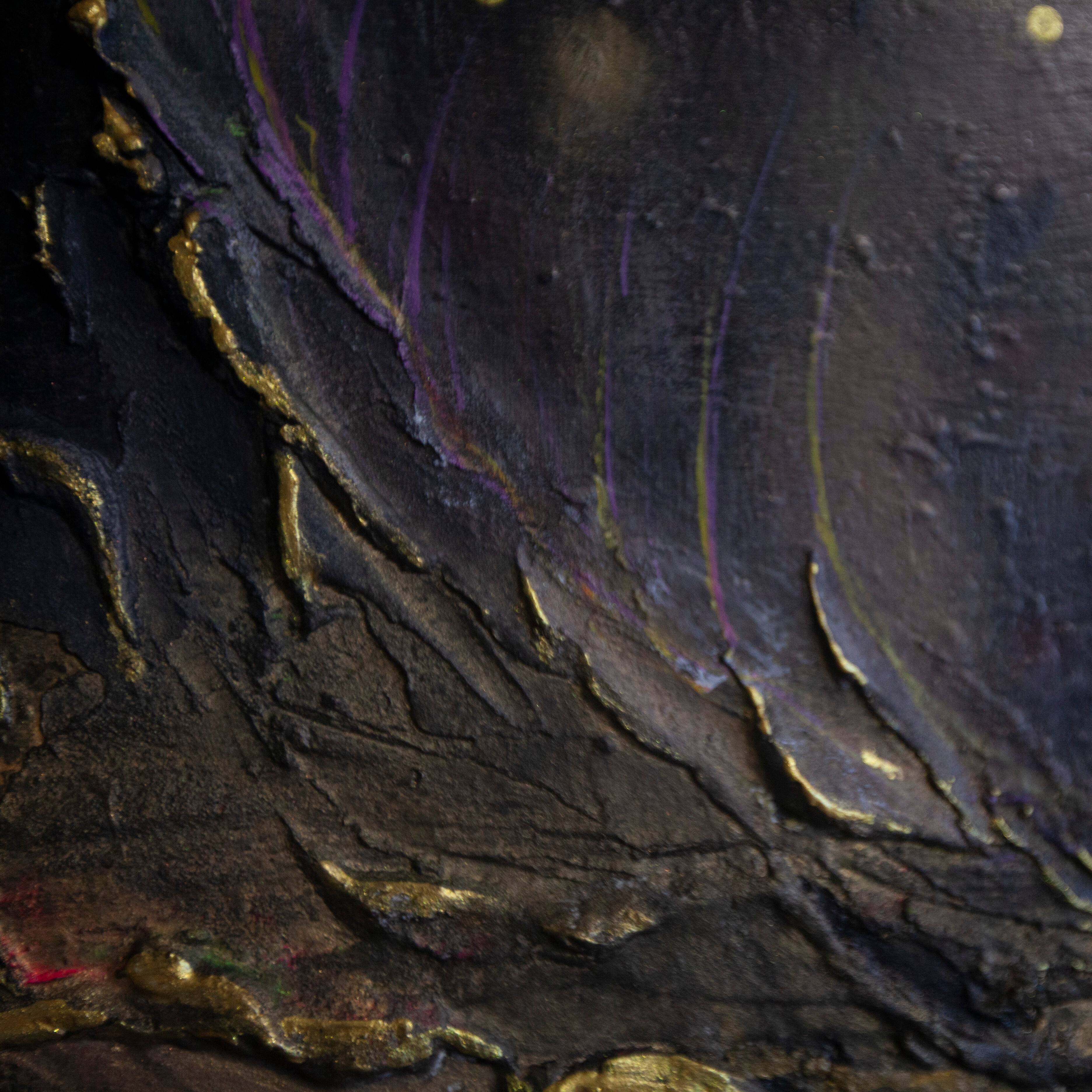 W partiach obrazu pojawiają się przenikające się plamy fioletu, zieleni i rudości — barwy organiczne, pulsujące życiem, przypominające o cykliczności natury. Kolory te subtelnie stapiają się z czernią, a miejscami są rozświetlane przez złote smugi i refleksy, które zdają się wypływać z głębi tła.