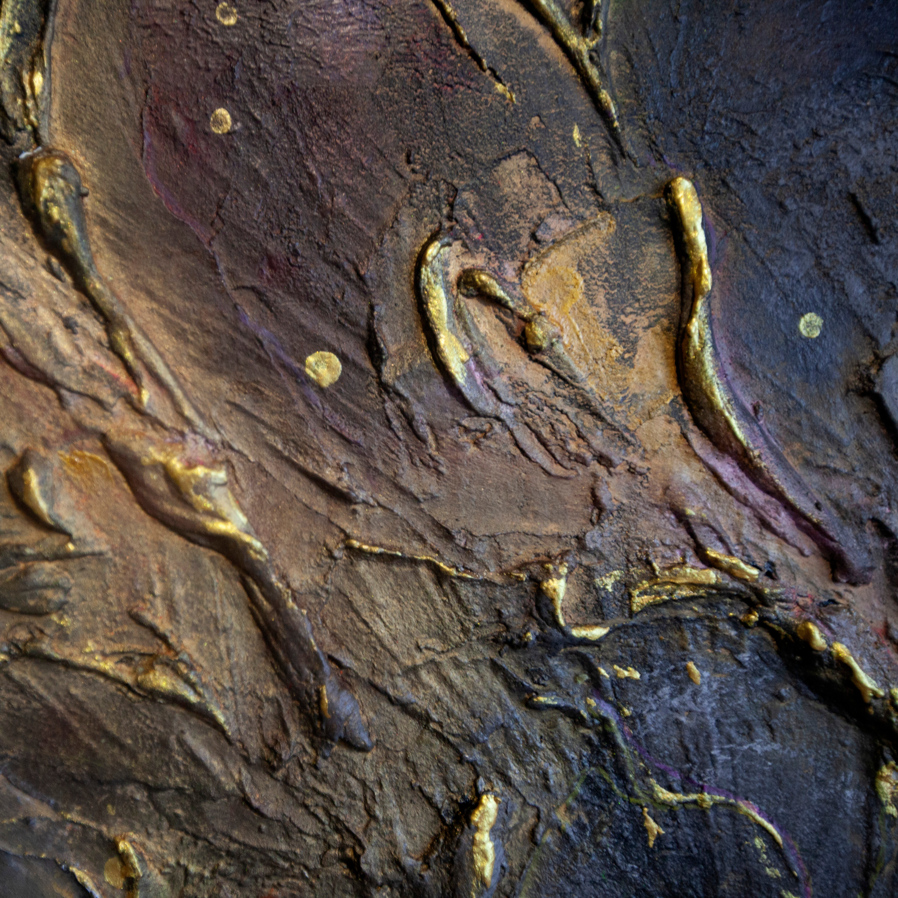 Obraz strukturalny wykonany techniką mieszaną - akryl, pasta strukturalna i pyłki UV, złoto w płynie. Obraz jest zawerniksowany (werniks satynowy) i ma zamalowane w tonacji obrazu boki. Obraz sprzedawany bez ramy.