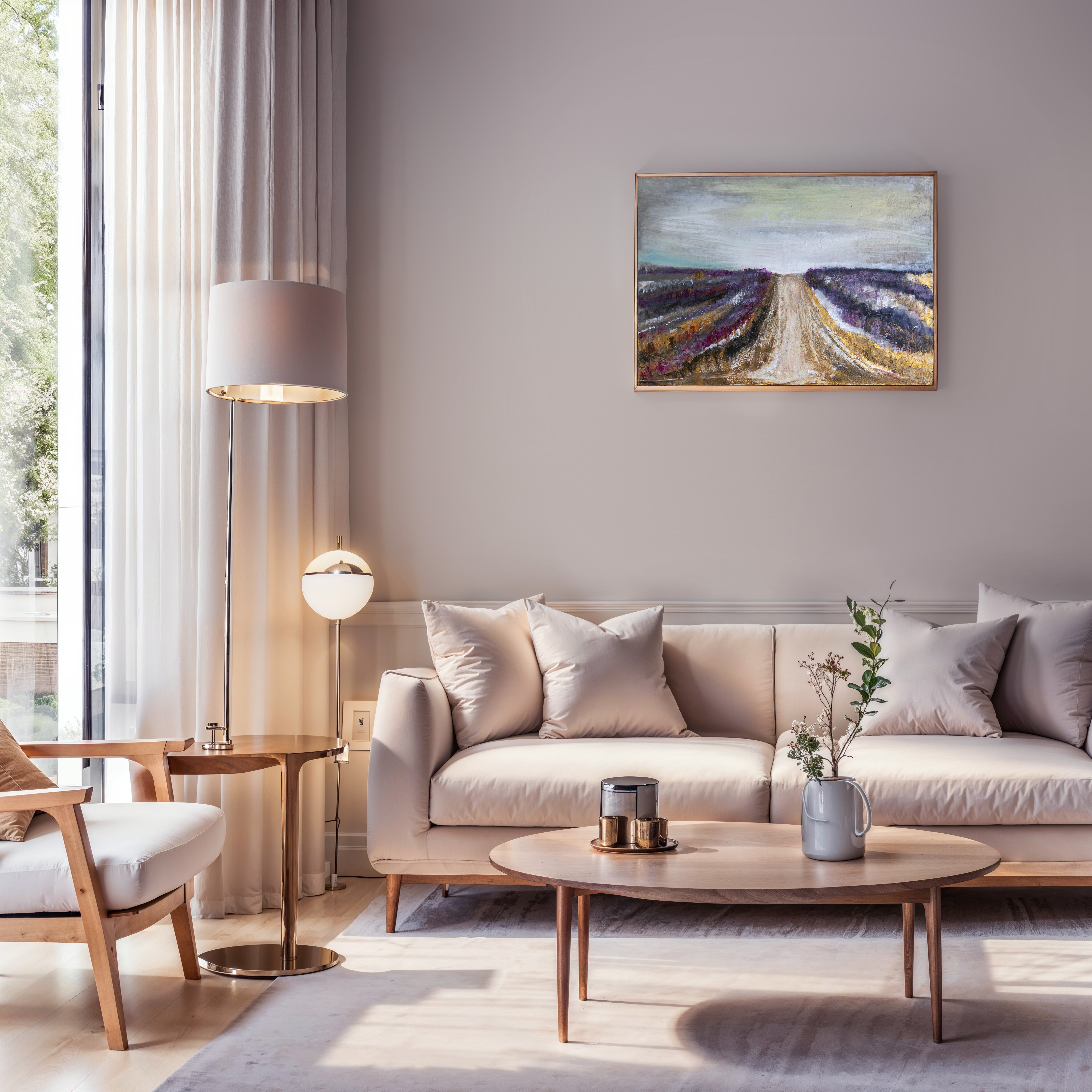 Ten niezwykły akrylowy obraz abstrakcyjny wykonany w 2024 roku posiada dodatkową fakturę uzyskaną techniką szpachli i pięknie wkomponuje się w eleganckie wnętrze salonu czy przedpokoju.