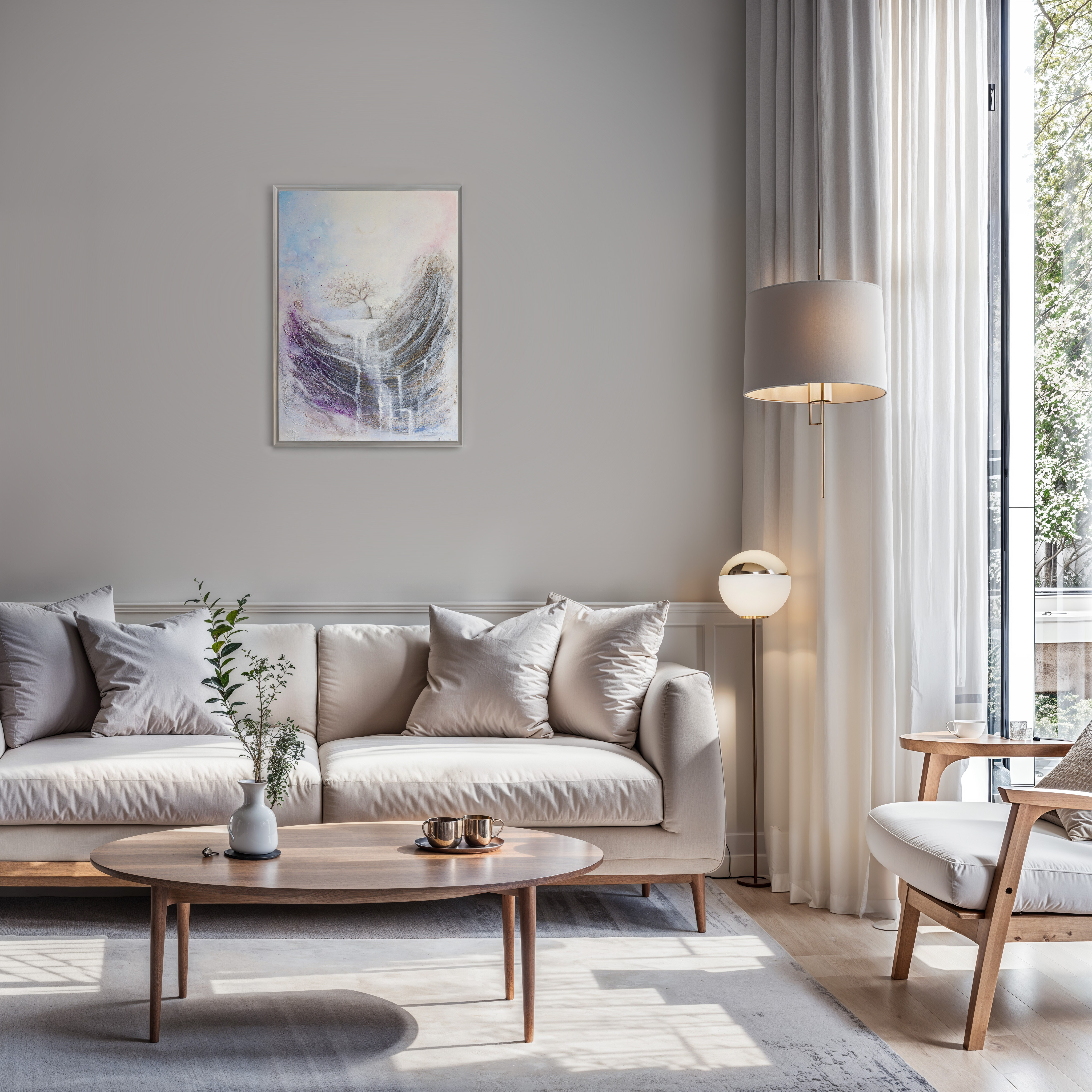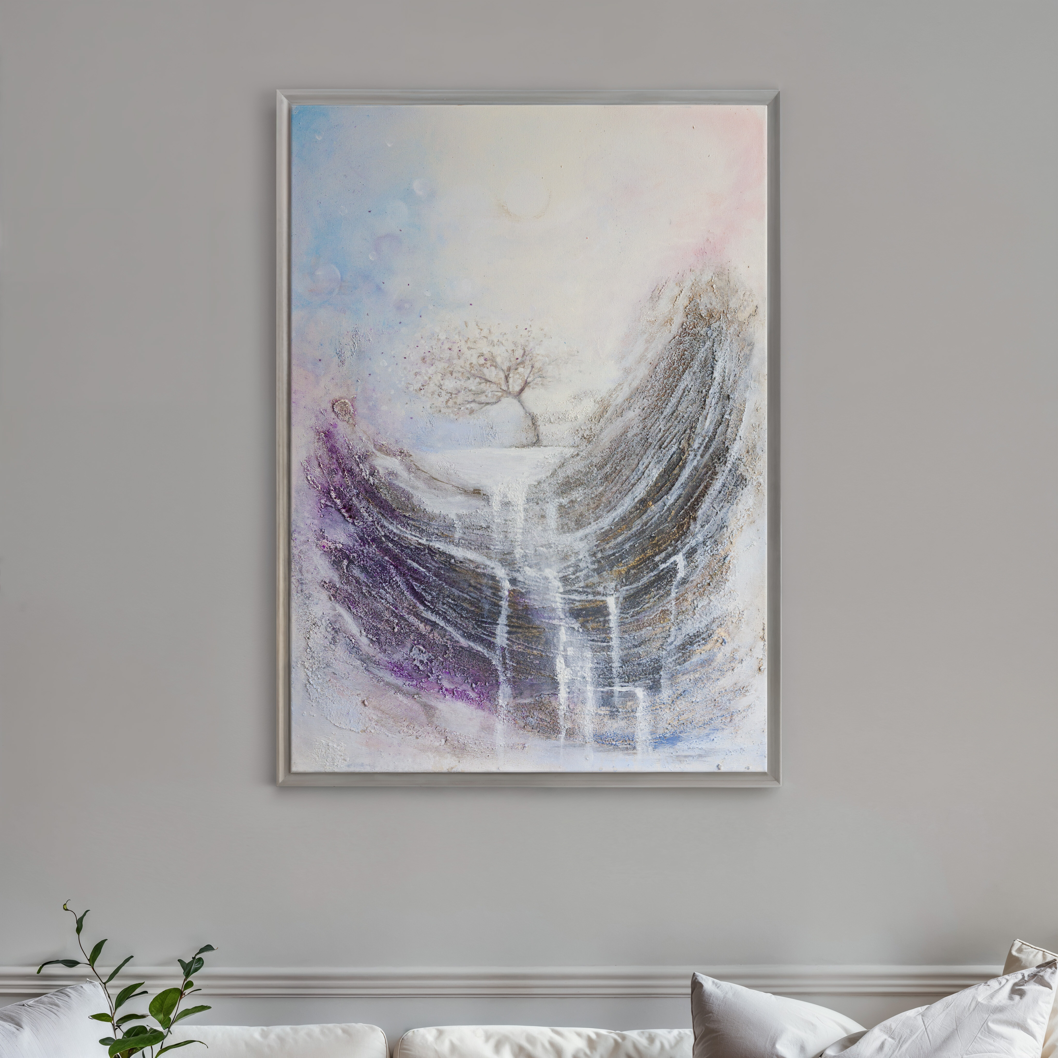 Obraz ukazuje drzewo niezwykłe – jego pień wyrasta z ziemi, lecz konary, zamiast wznosić się ku niebu, rozciągają się i trwają w przestrzeni, jakby zanurzone w żywym źródle, które pamięta początek świata. Powietrze oplata gałęzie niczym pierwotna przestrzeń, w której kryje się tajemnica narodzin i ciągłego odradzania.