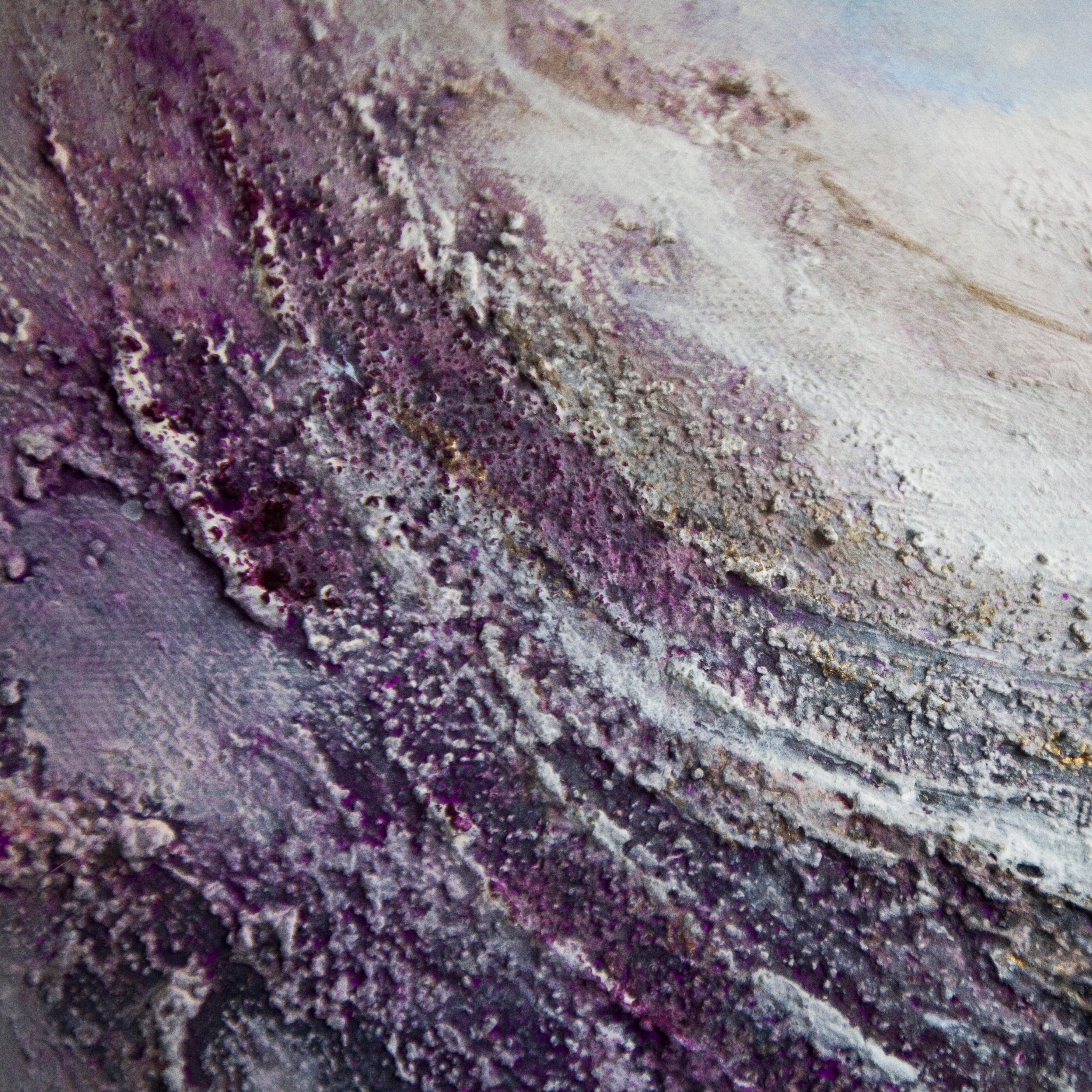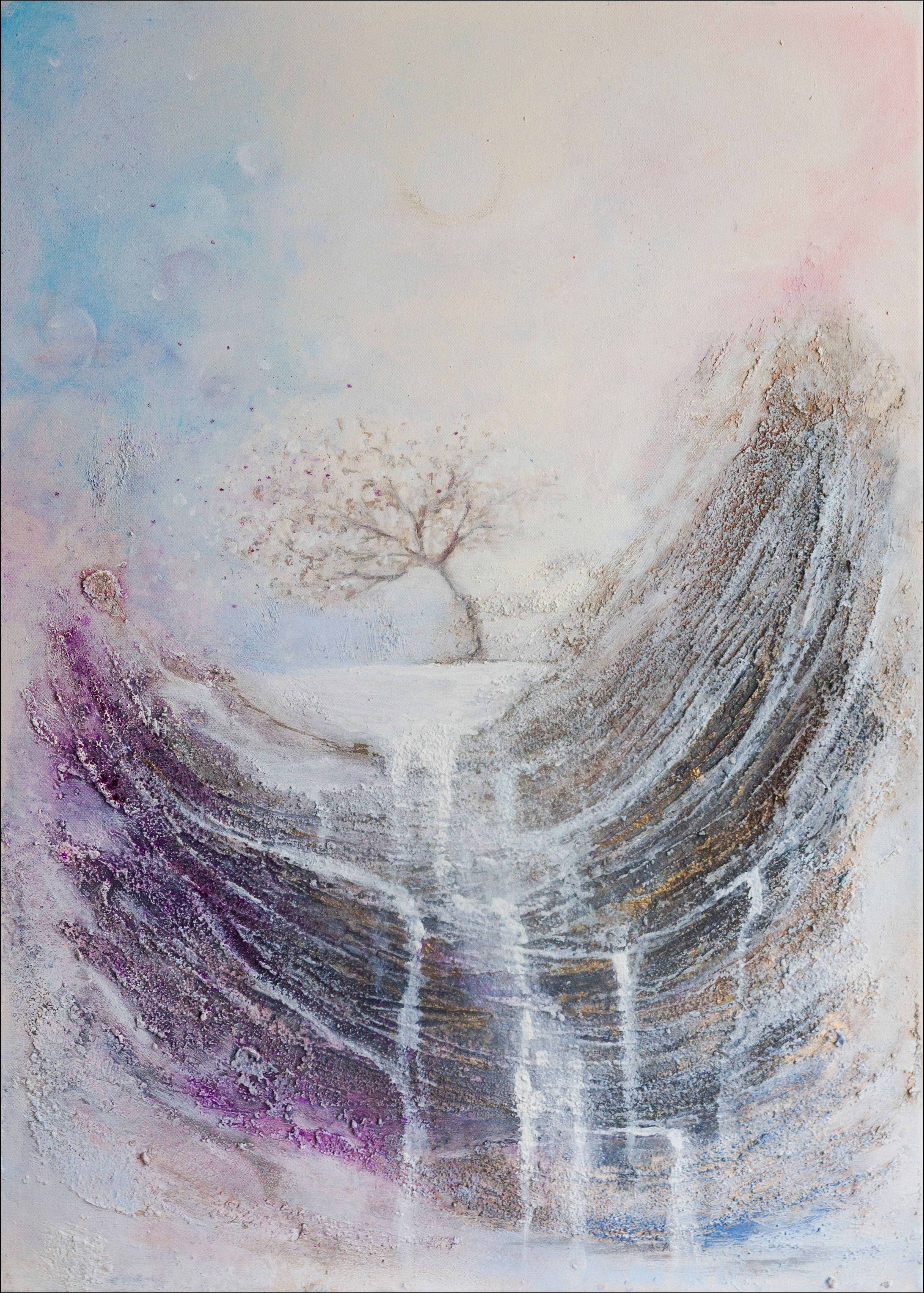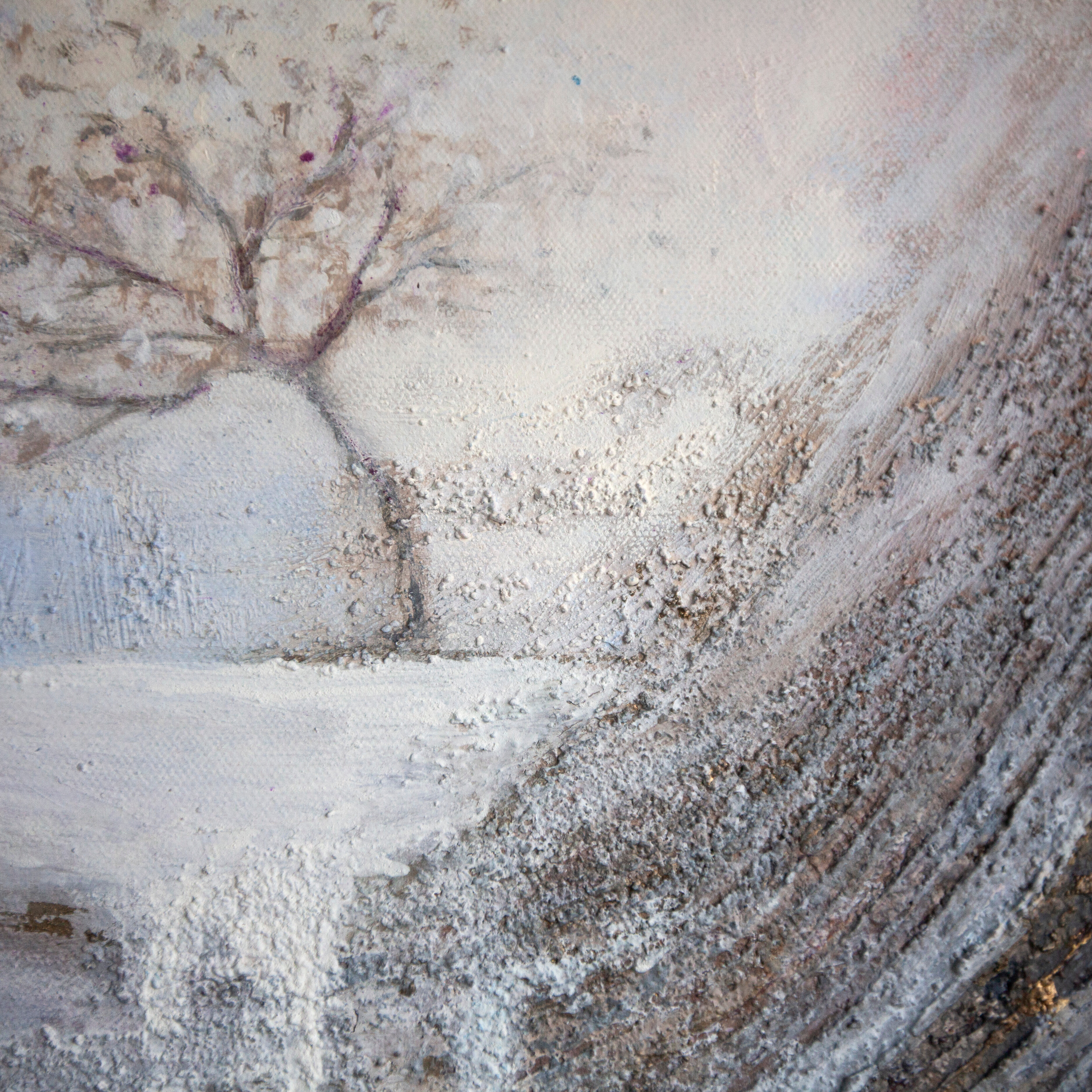 Obraz strukturalny wykonany techniką mieszaną - akryl, pasta strukturalna i pyłki UV, złoto w płynie. Obraz jest zawerniksowany (werniks satynowy) i ma zamalowane w tonacji obrazu boki. Obraz sprzedawany bez ramy.